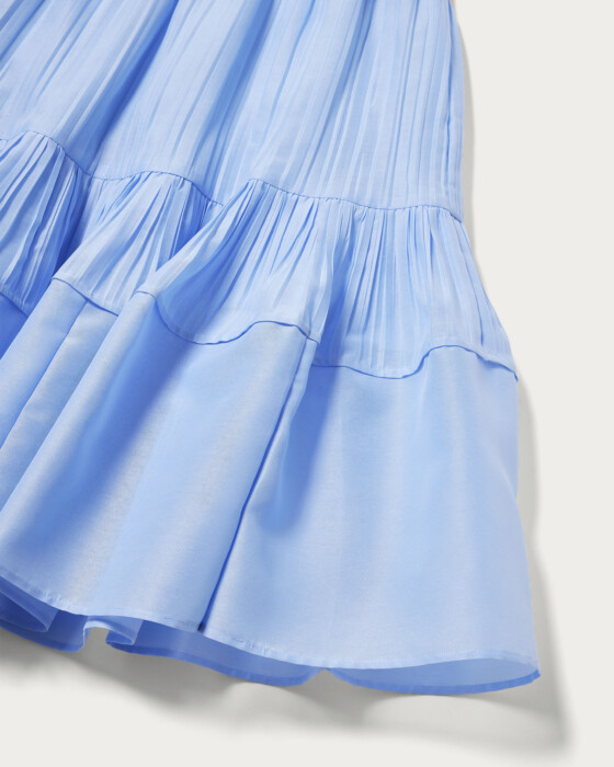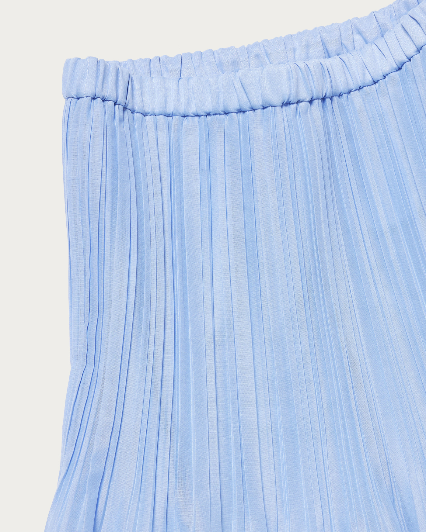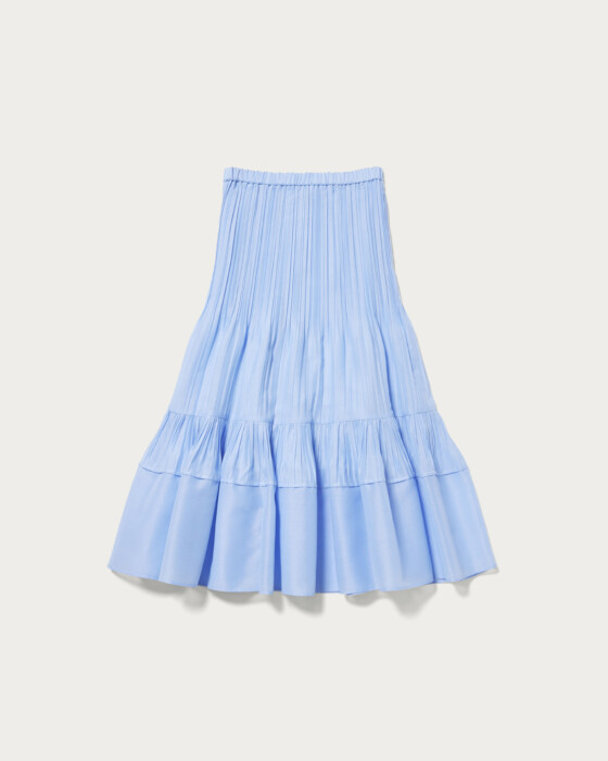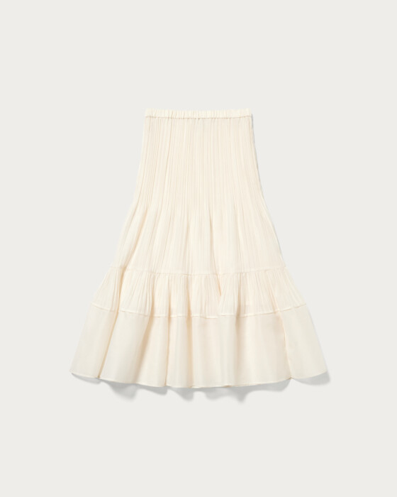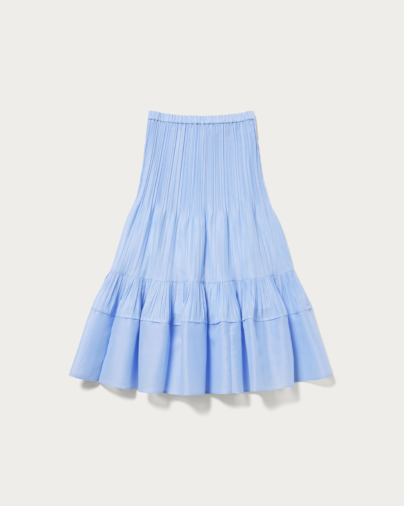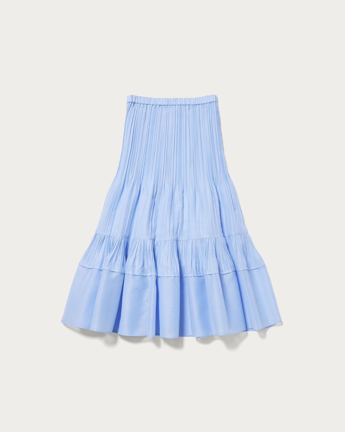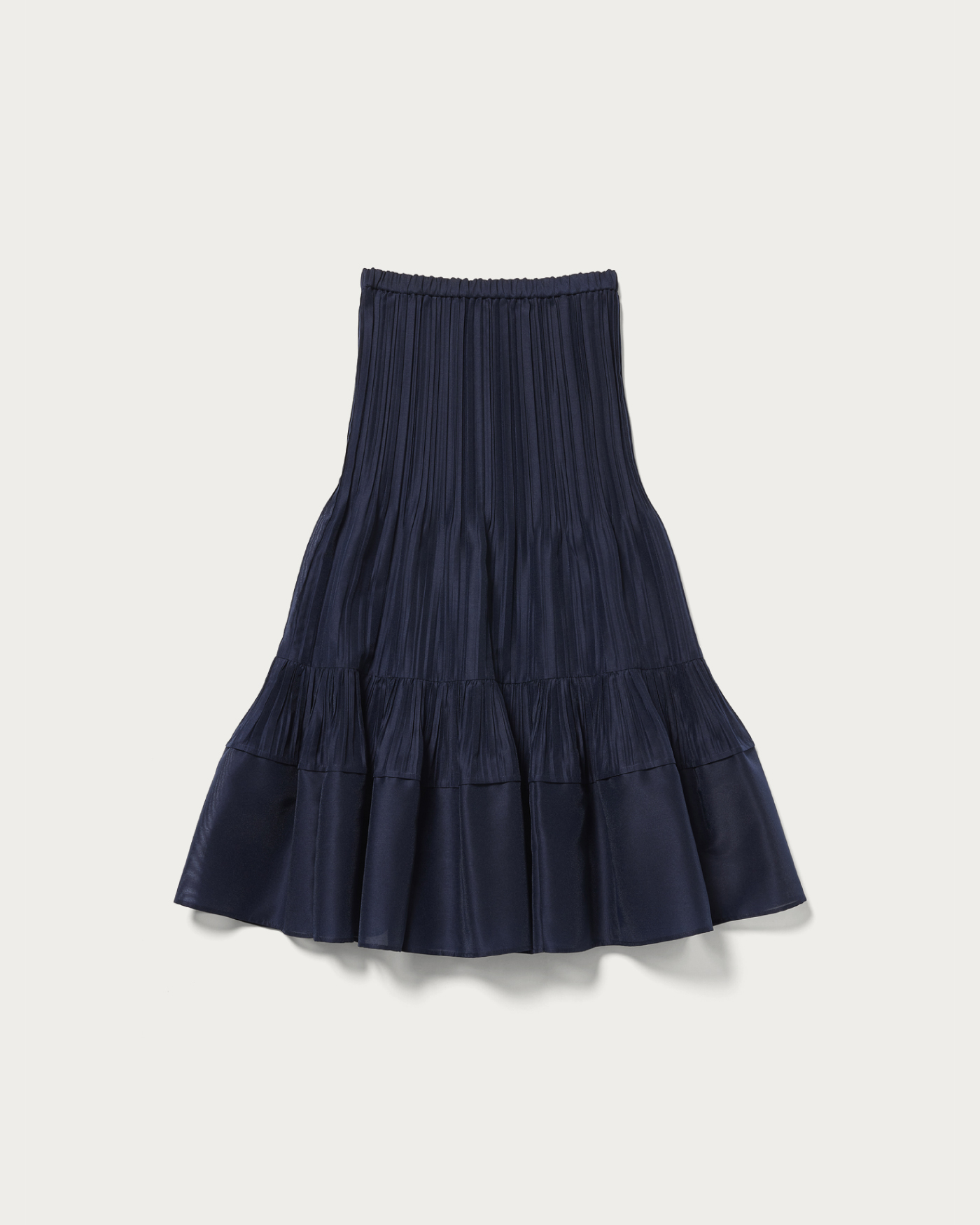 構築的なシルエットで独特なプリーツが印象的でコーディネートのアクセントとなるスカート。ウエストはゴム仕様で快適な 履き心地に。身体のラインを拾わないよう程よくフレアシルエットです。タイトなリブニットできれいめにも、スウェットでカジュアルにも幅広く活躍するスカートです。