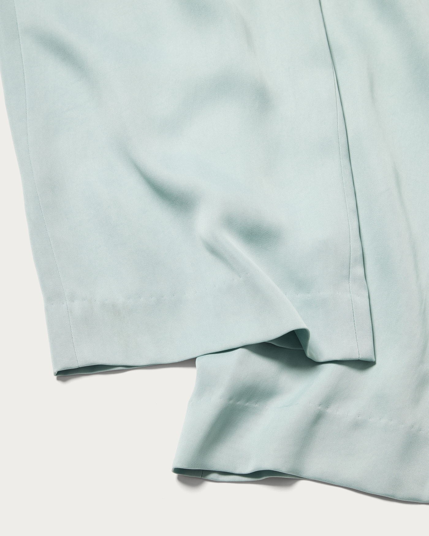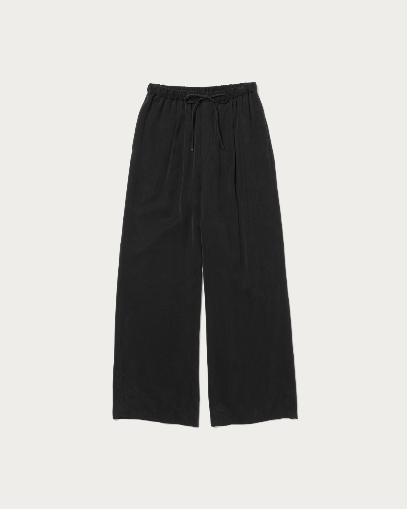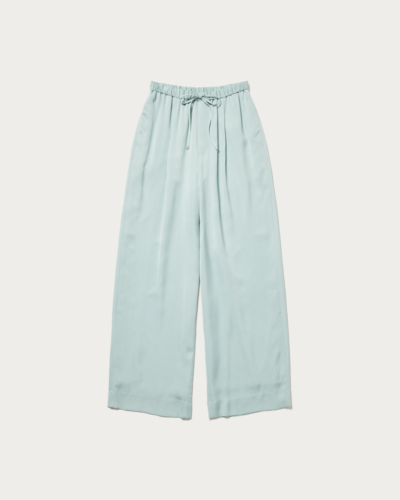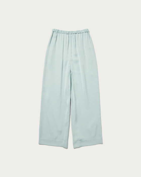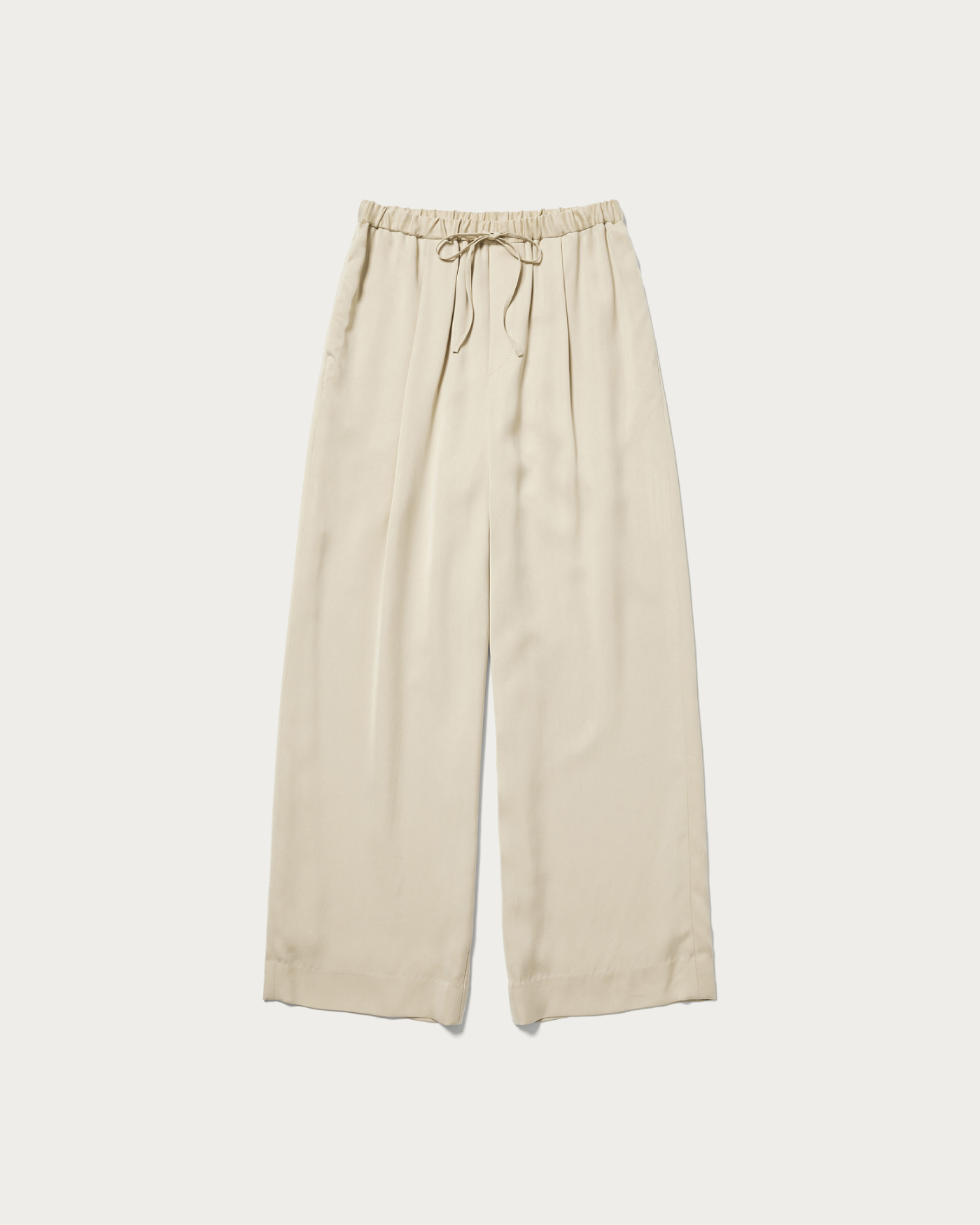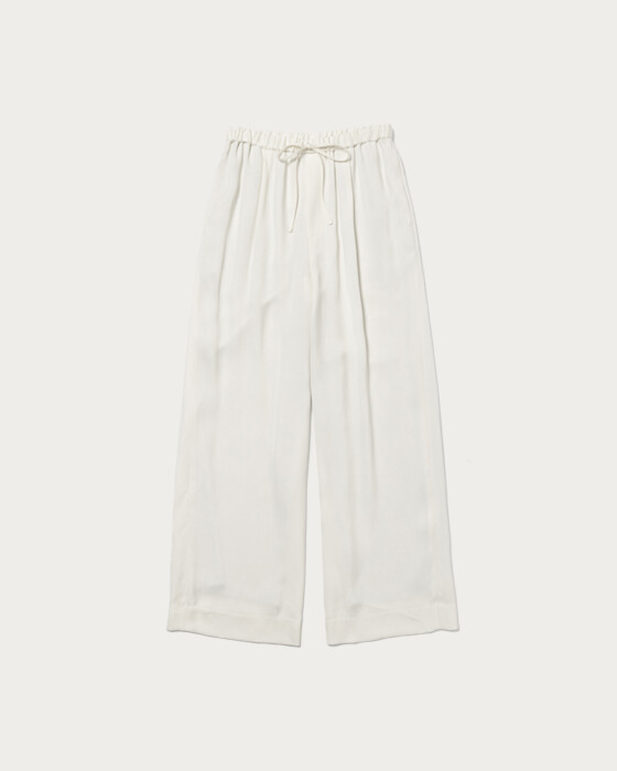 しなやかなドレープ感とパウダリーな微光沢が特徴のイージーパンツ。ウエストゴムでリラックス感がありながらも品のある佇まいが魅力の一着。ダブルクロス素材で上質な重厚感があり、肌寒い時期でも着用しやすいのが嬉しいポイントです。軽やかな素材を活かし寒い時期は毛足のあるニットと合わせるのがおすすめです。足元はキレイめなパンプスやスニーカーなどスポーティな合わせも素敵です。