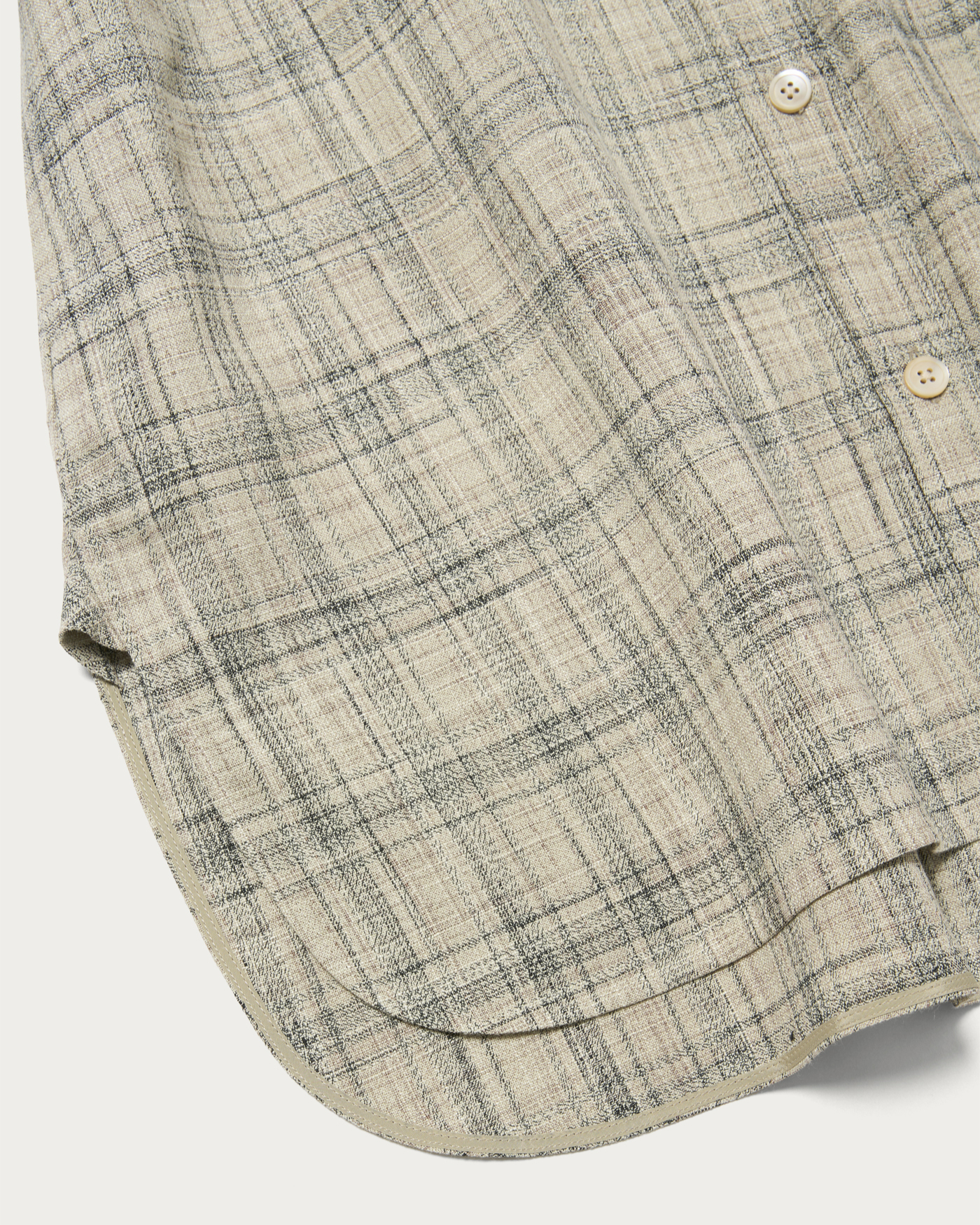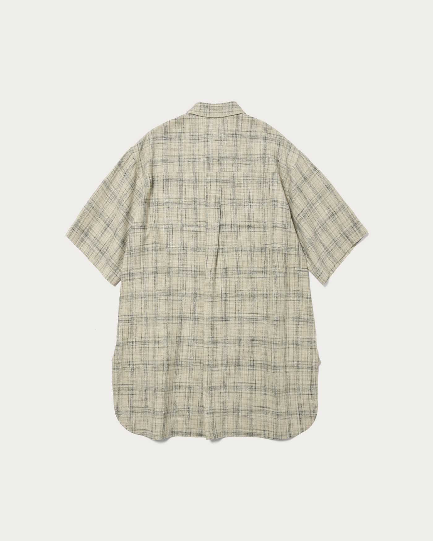 チェック柄で表面感のある素材を使用したチュニック丈のシャツ。やや肩を落とし、身幅にゆとりを持たせたシルエットで、リラックス感のある仕上がりに。ミニワンピースとしてはもちろん、パンツを合わせてチュニックとしても着用いただけます。やや厚みのある素材を使用しているので前ボタンを開けて羽織のようにもなり、合わせるアイテムによって着こなし変えて楽しめる一着です。