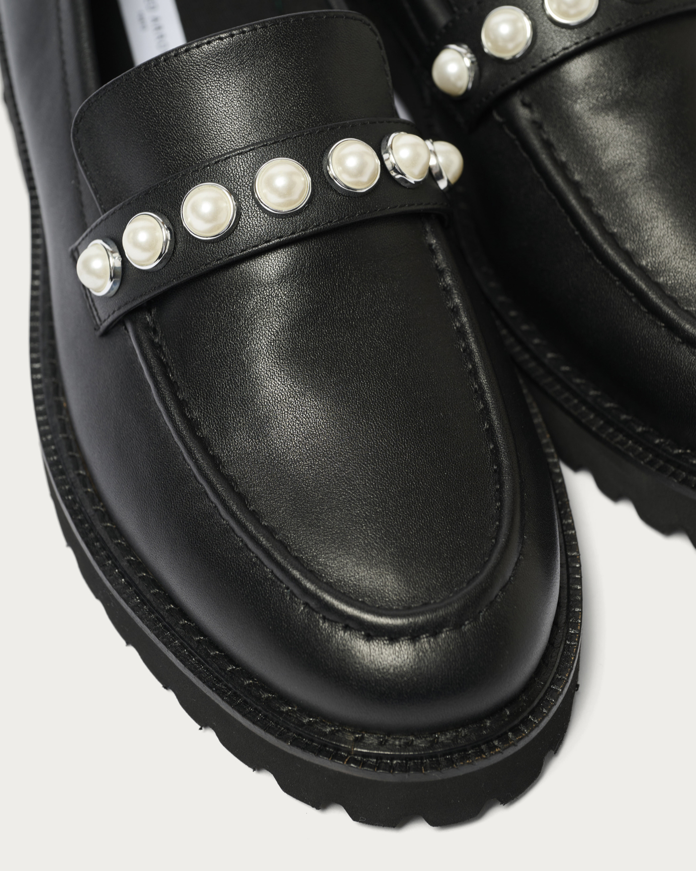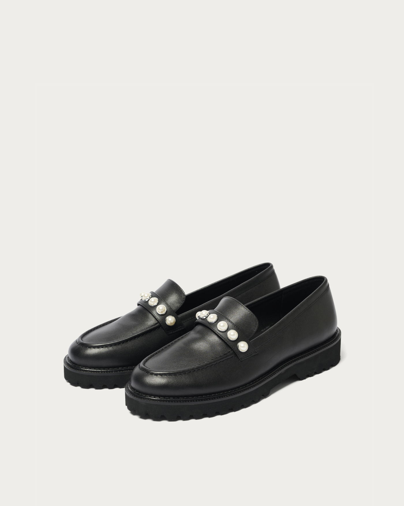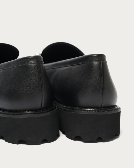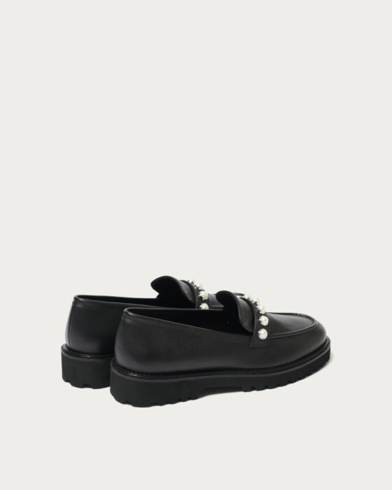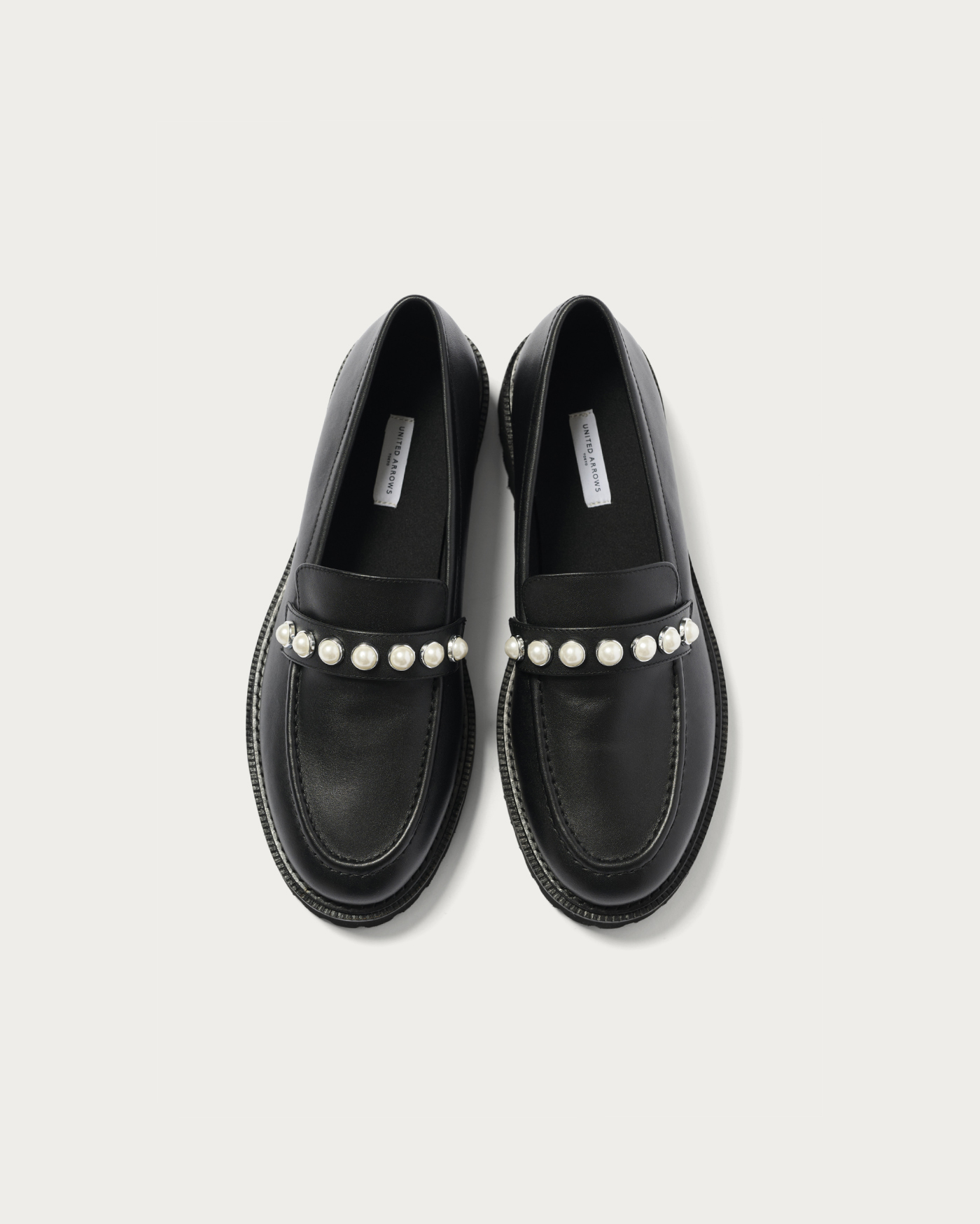 パールモチーフのスタッズをあしらったローファー。上品で華やかな印象ながら、底の厚みは程よく、さまざまなスタイルに合わせやすいデザインです。トラッドなローファーにフェミニンな要素が追加され、シンプルな着こなしのアクセントとなりコーディネートに馴染みます。オフィスシーンやカジュアルスタイリングまで幅広く活躍する一足です。