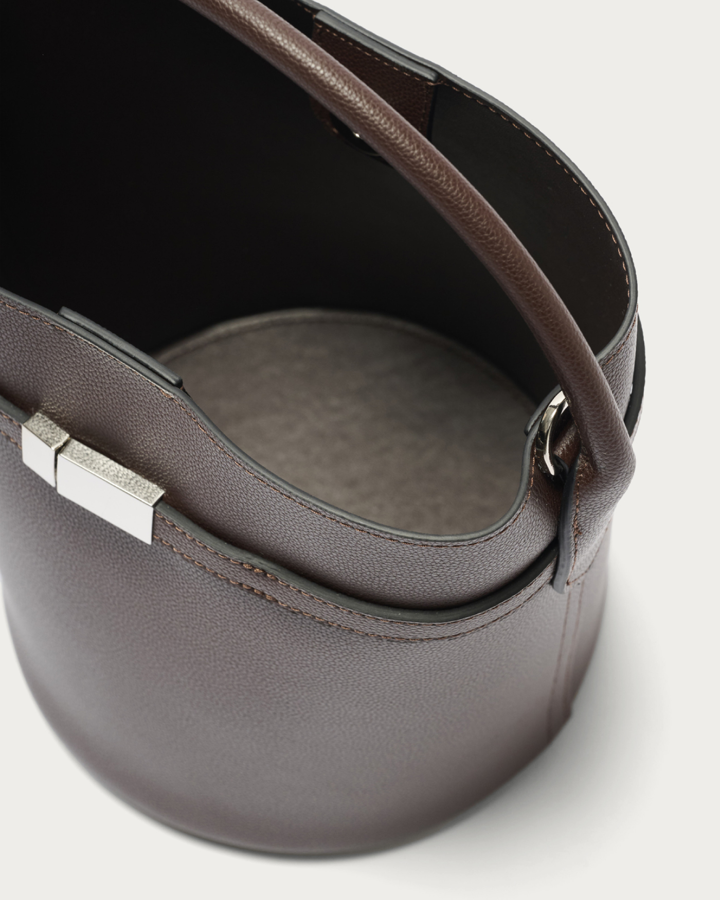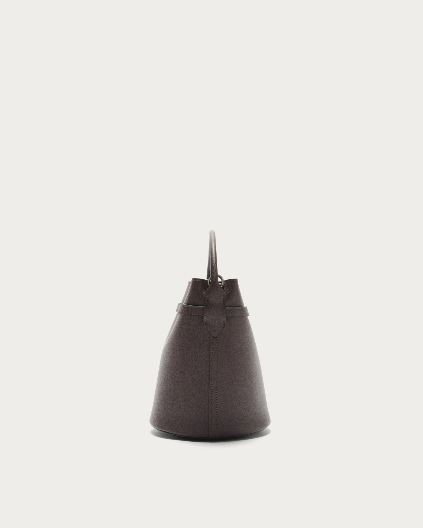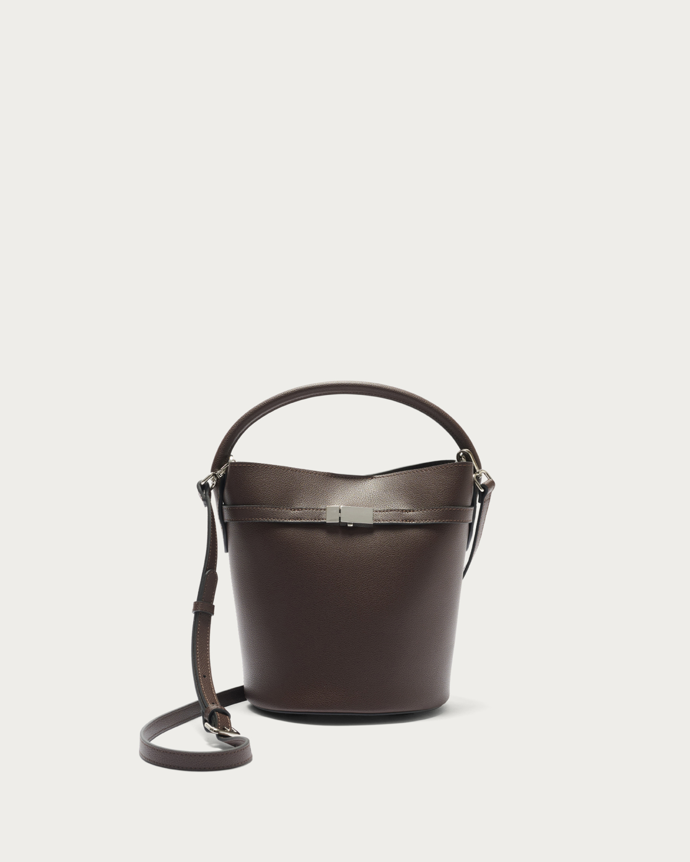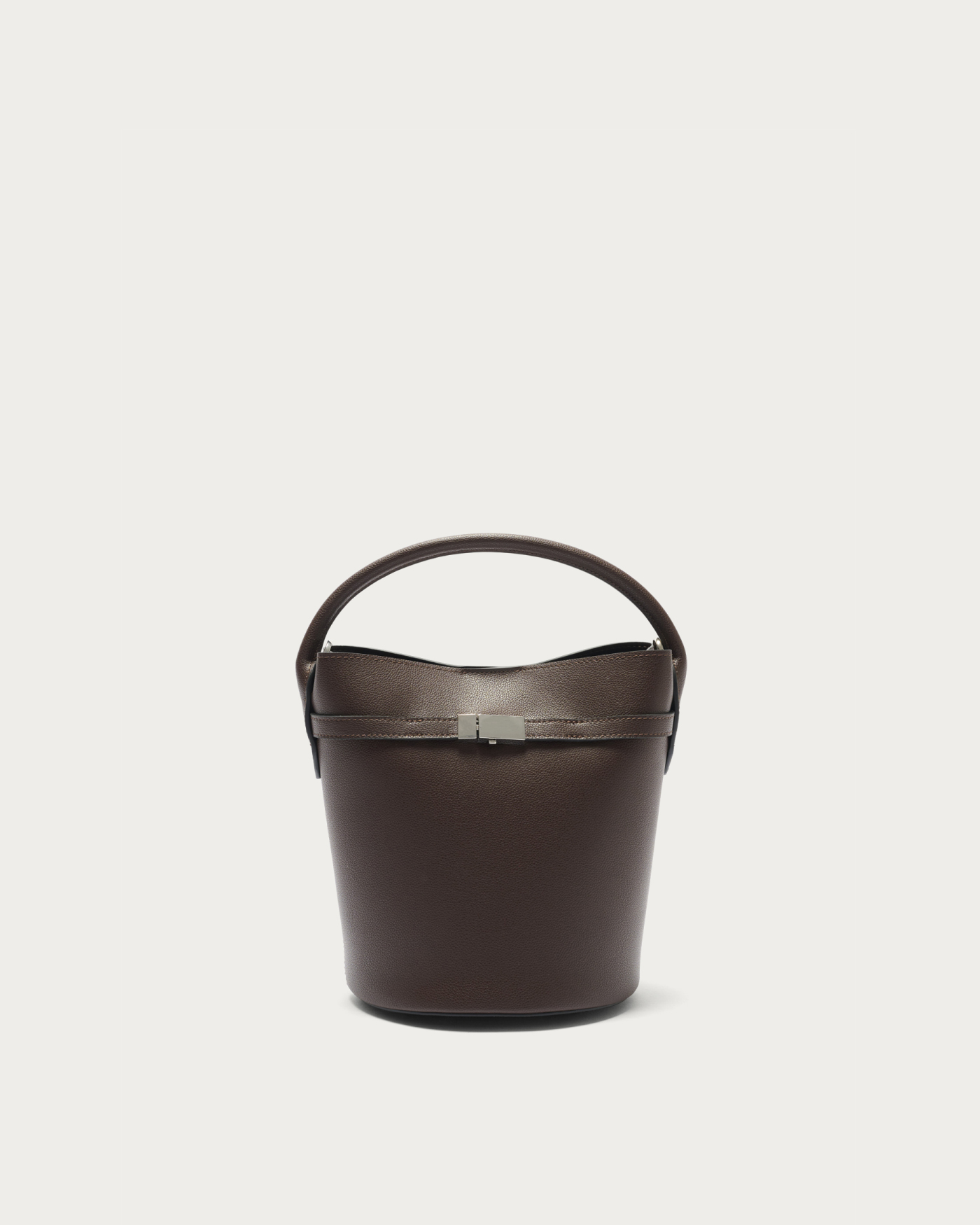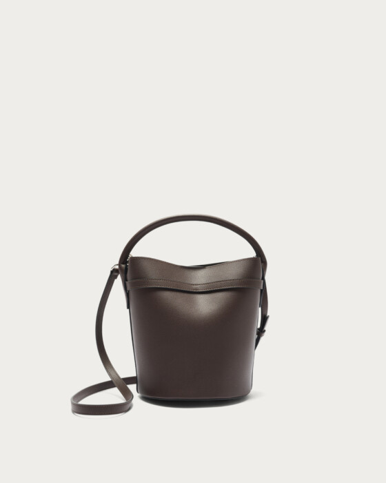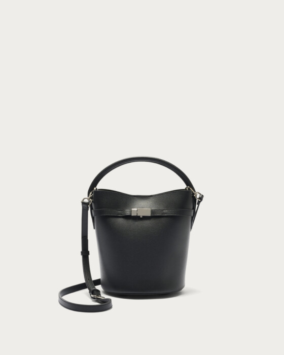 メタルパーツをあしらったベルトがアクセントのバゲットバッグ。毎シーズン人気のミニマルなバケツ型のバッグをベースに、口元の金具がポイントの細ベルトでデザインをアップデート。表裏素材を貼り合わせ、一枚仕立てのように軽やかに仕上げました。マグネット開閉で、取り外し可能なショルダーストラップ付きです。
