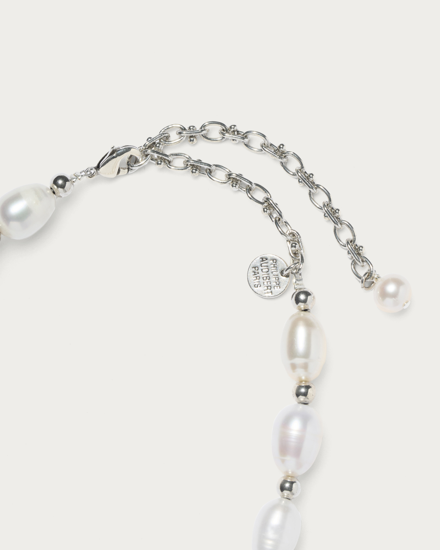 品質にこだわり、レベルの高いデザインをコンセプトに、ファッショナブルなアクセサリーを制作するフランスのアクセサリーブランド〈PHILIPPE AUDIBERT(フィリップ オーディベール)〉に別注したネックレス。ぷっくりとしたシェイプ型の淡水パールを連ねた別注デザインのチョーカーネックレス。長めのアジャスター付きで、スタイリングに合わせて長さの調整が可能です。