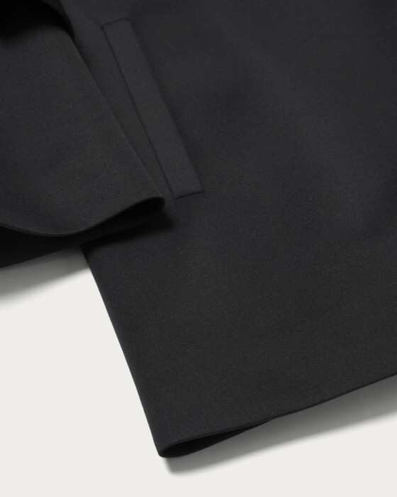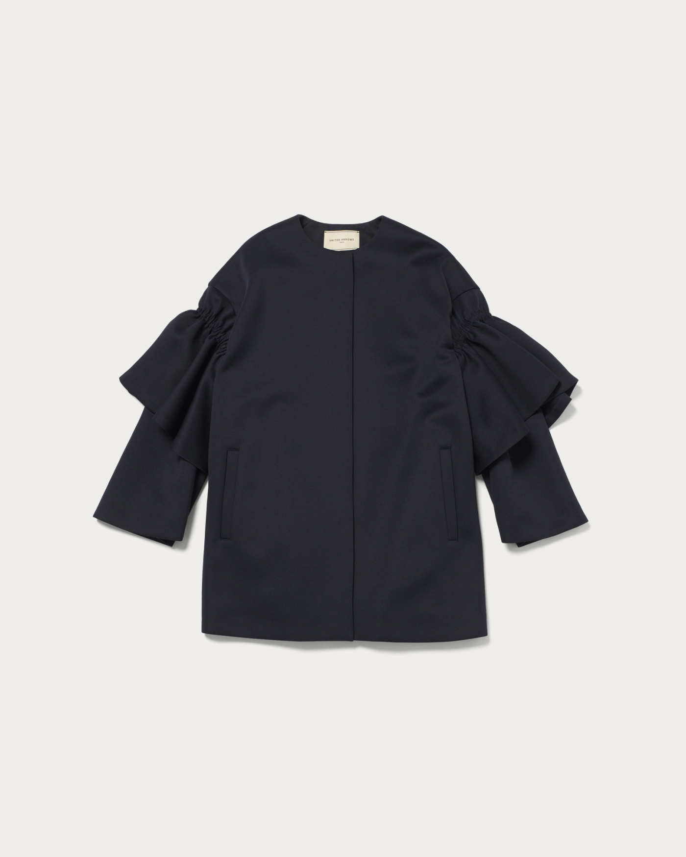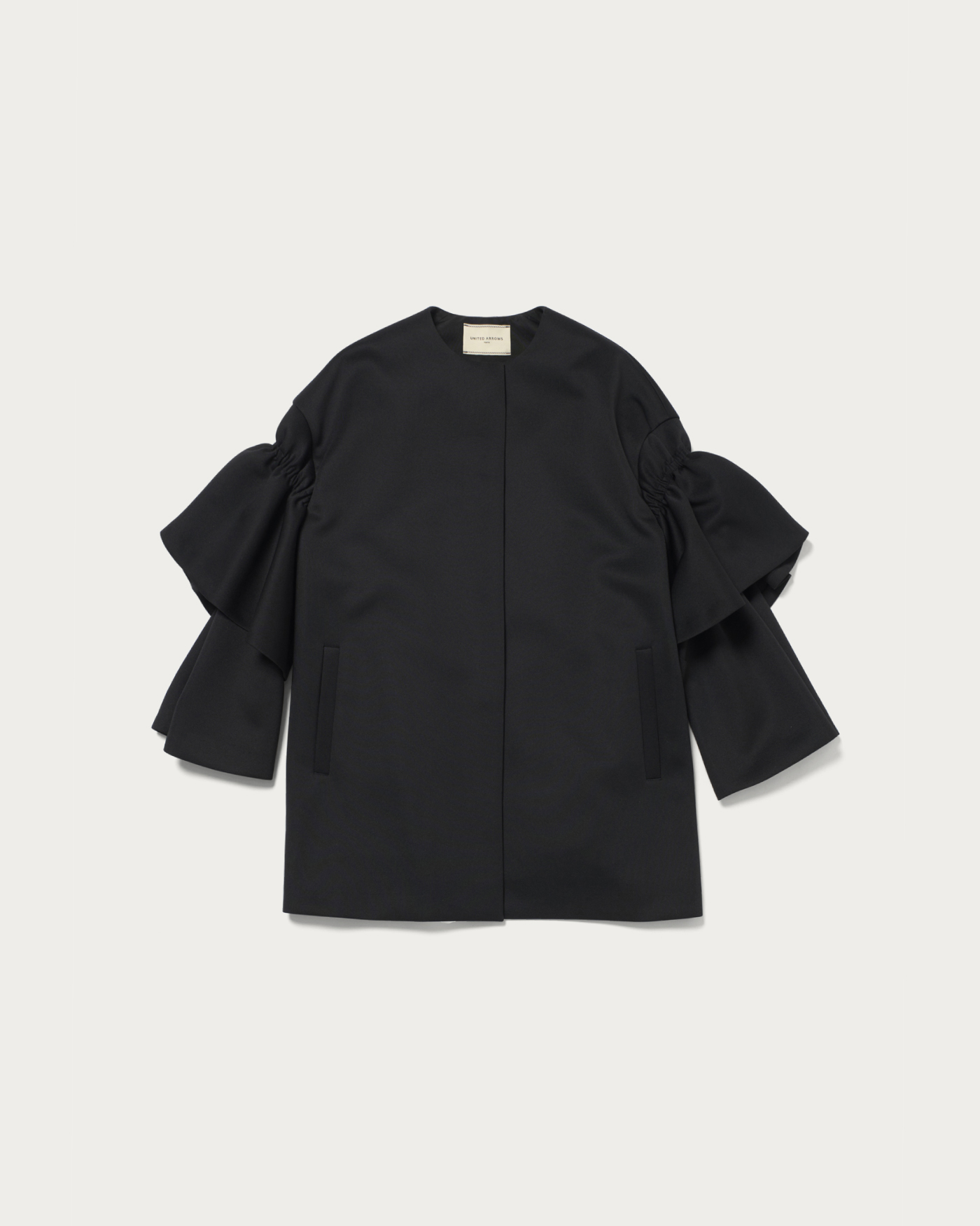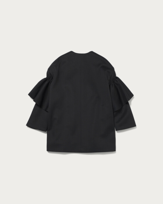 おでかけやセレモニーシーンにも活躍する袖コンシャスなコート。分量感のあるシルエットながら、ジャージー素材ならではの軽やかさで、さらりと羽織れる仕上がりです。アームホールと身幅にほどよいゆとりがあり、中に着るアイテムの形を選ばず着用いただけるデザイン。袖に重ねたフリルパーツが、動きに華やかさを添える一着です。