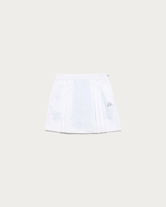 フロントのパッチポケットがアクセントとなる、端正な印象のスクエアスカート。インナーパンツ一体型仕様により、スイング時もスカートが回らず、快適で安心感のあるプレーをサポートします。透けにくさと軽やかさを兼ね備えたポリエステル素材を使用し、春夏のラウンドにも最適。ウエストにはジャガードゴムを採用し、ブランドロゴを上品に表現。滑り止めプリントによりシャツのずり上がりを防ぎ、安定した着用感をキープする一着です。