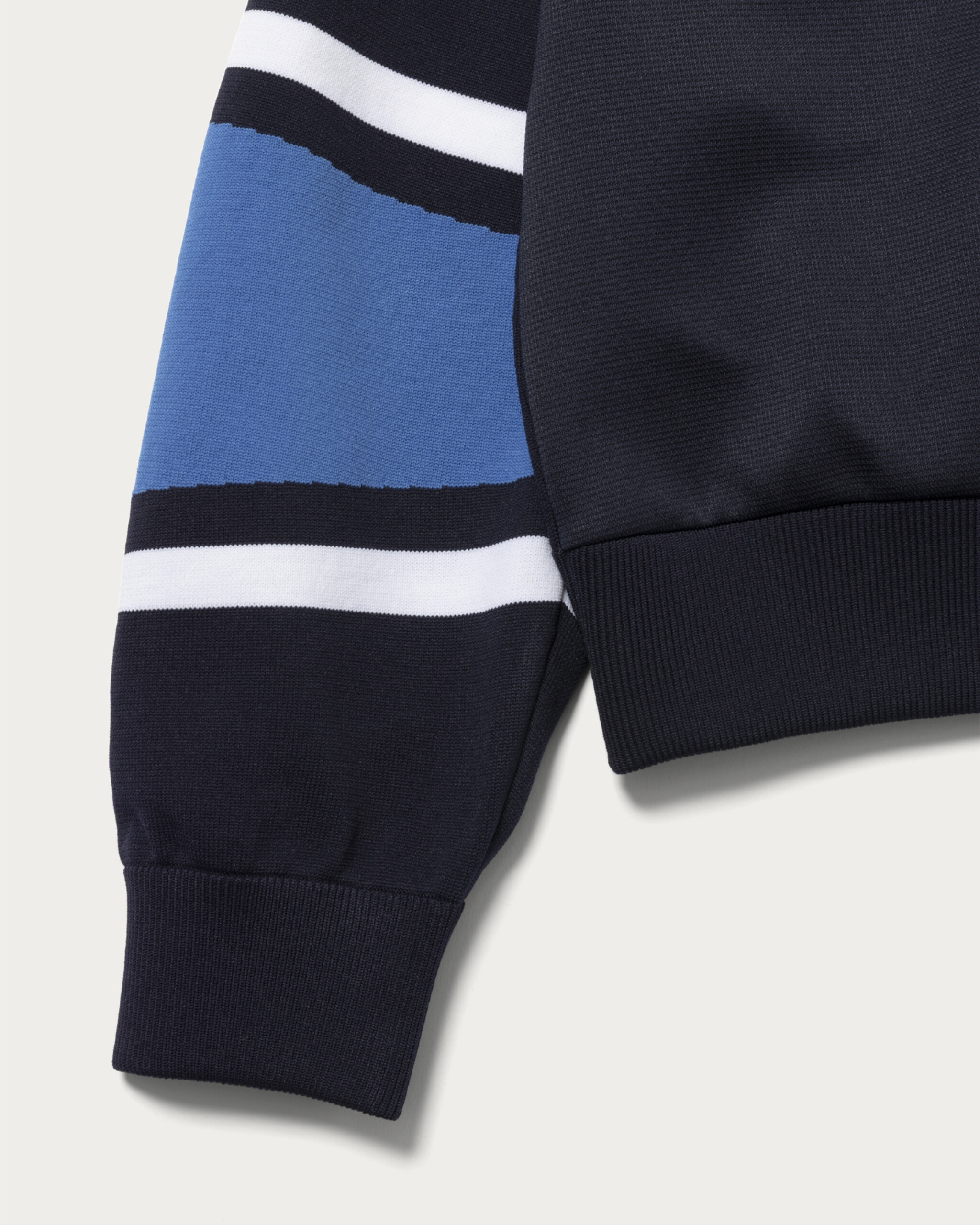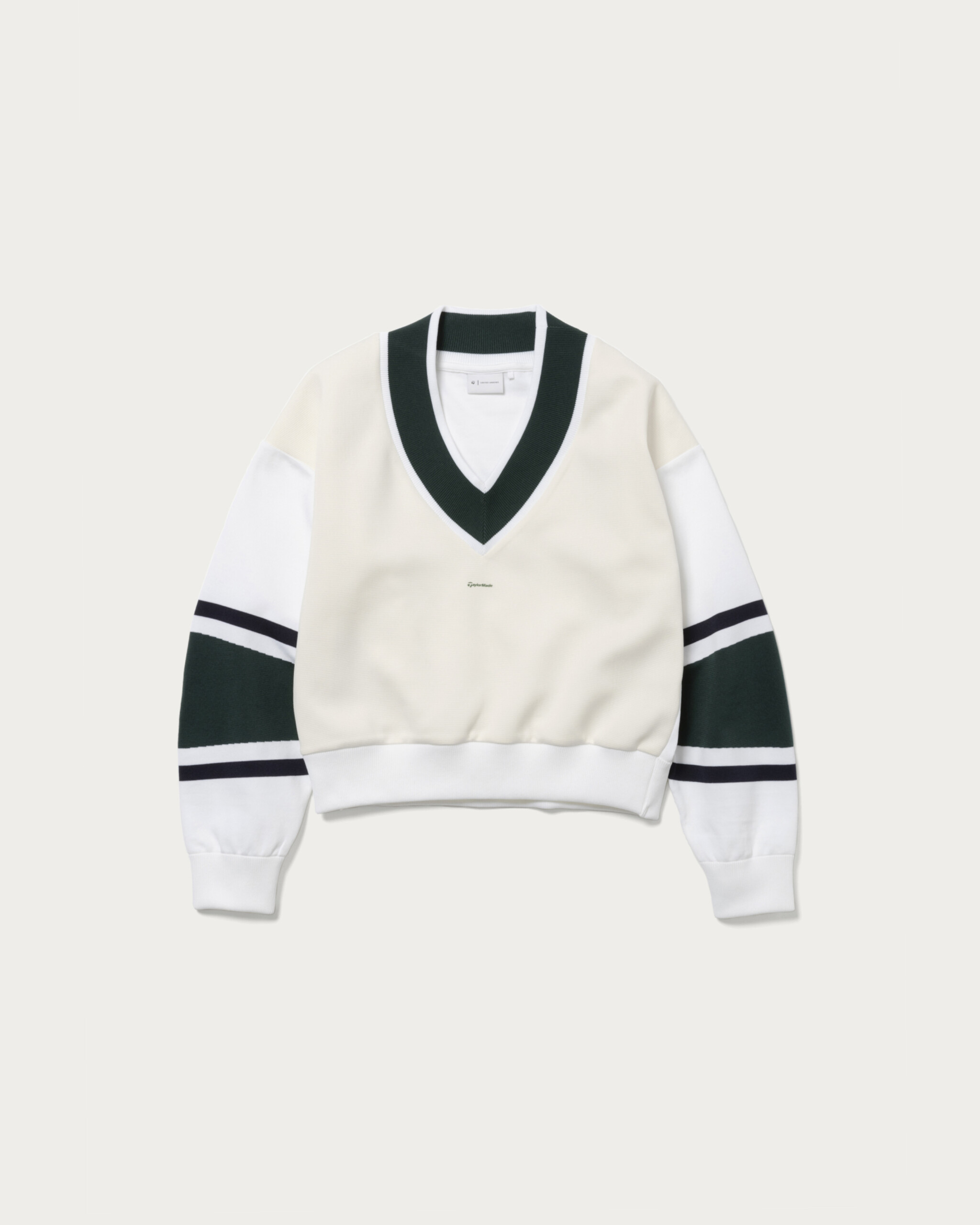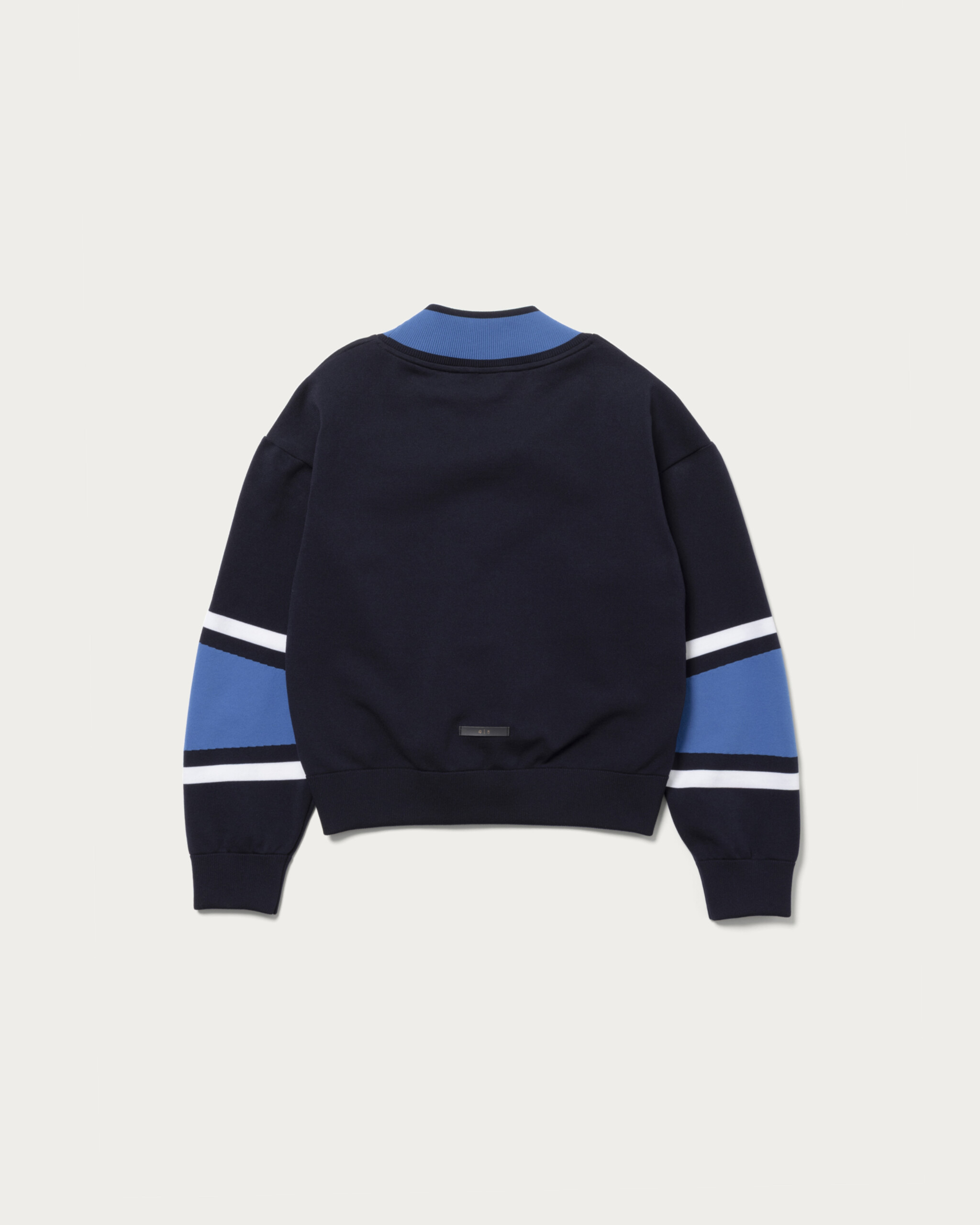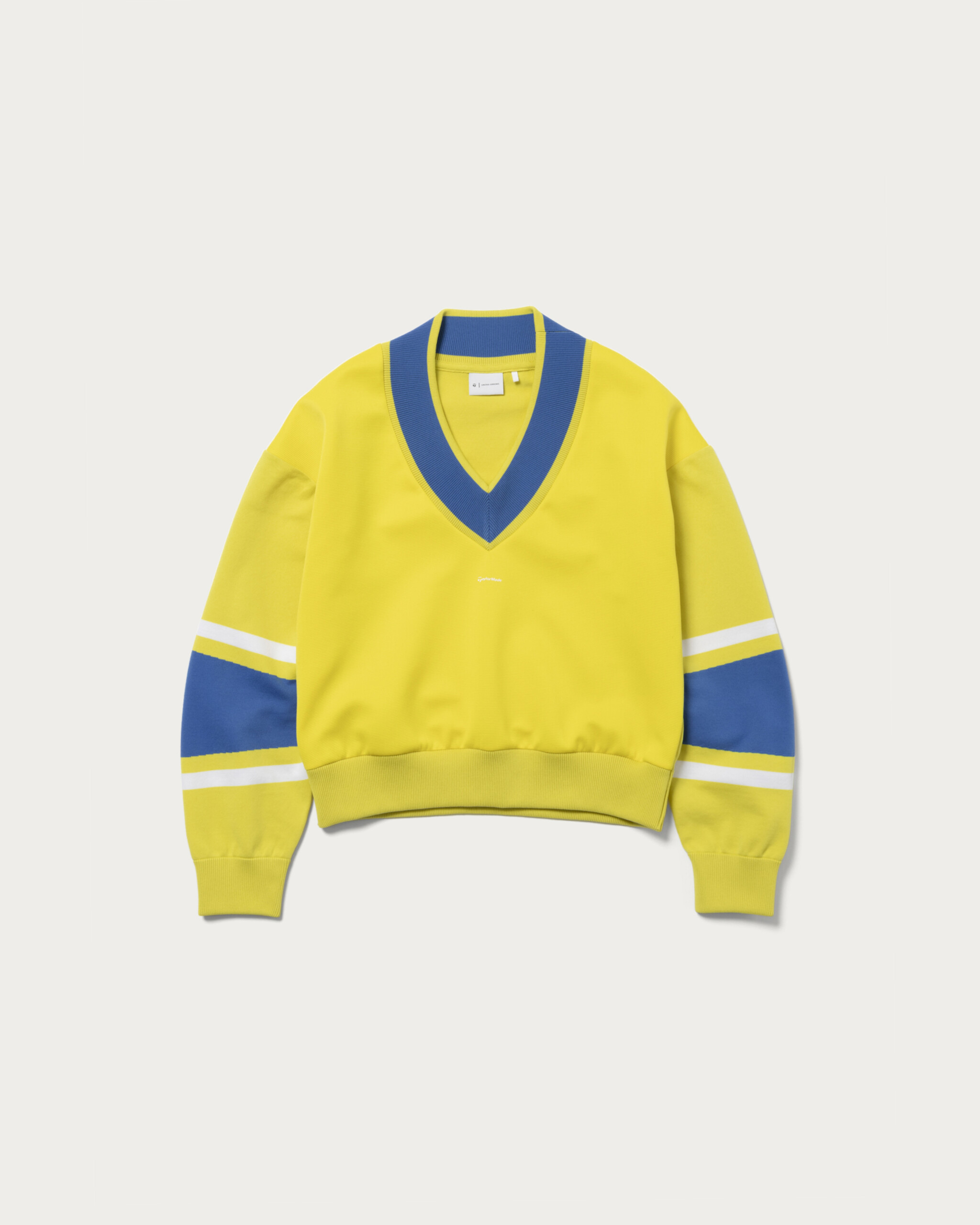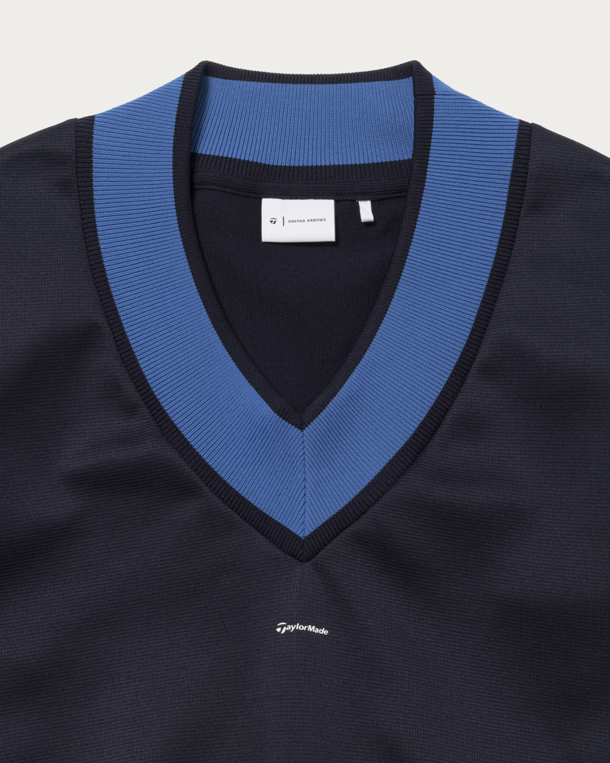 リラックスフィットのVネックプルオーバーニット。カラーブロックがややレトロでスポーティな印象を与えます。テーラーメイドとユナイテッドアローズによるコラボコレクションです。