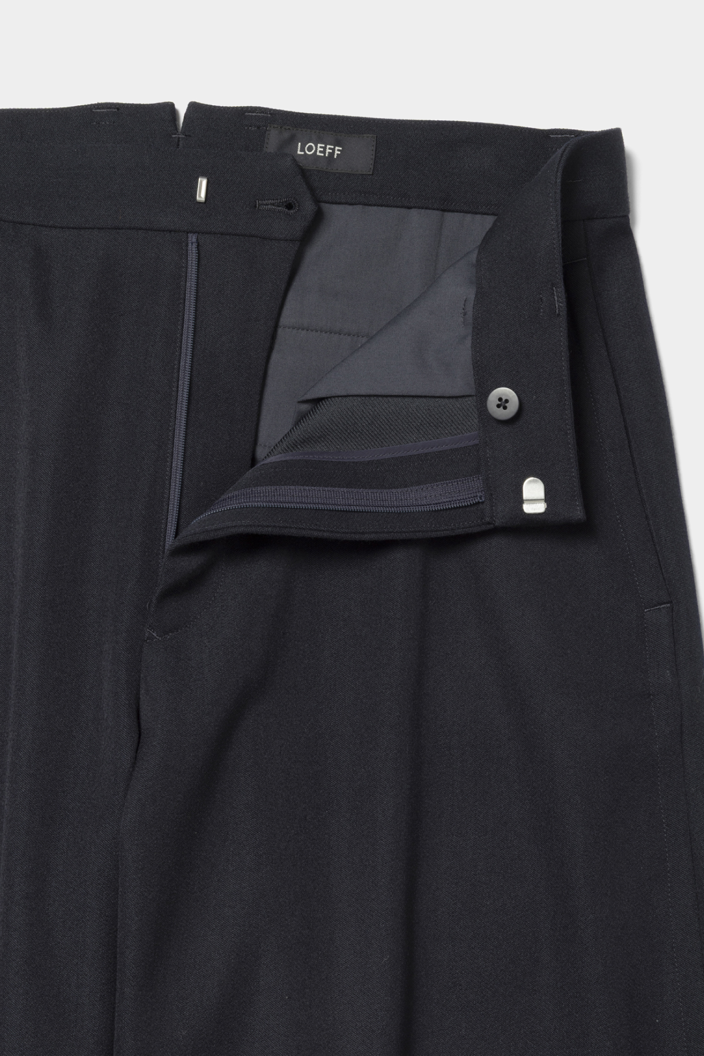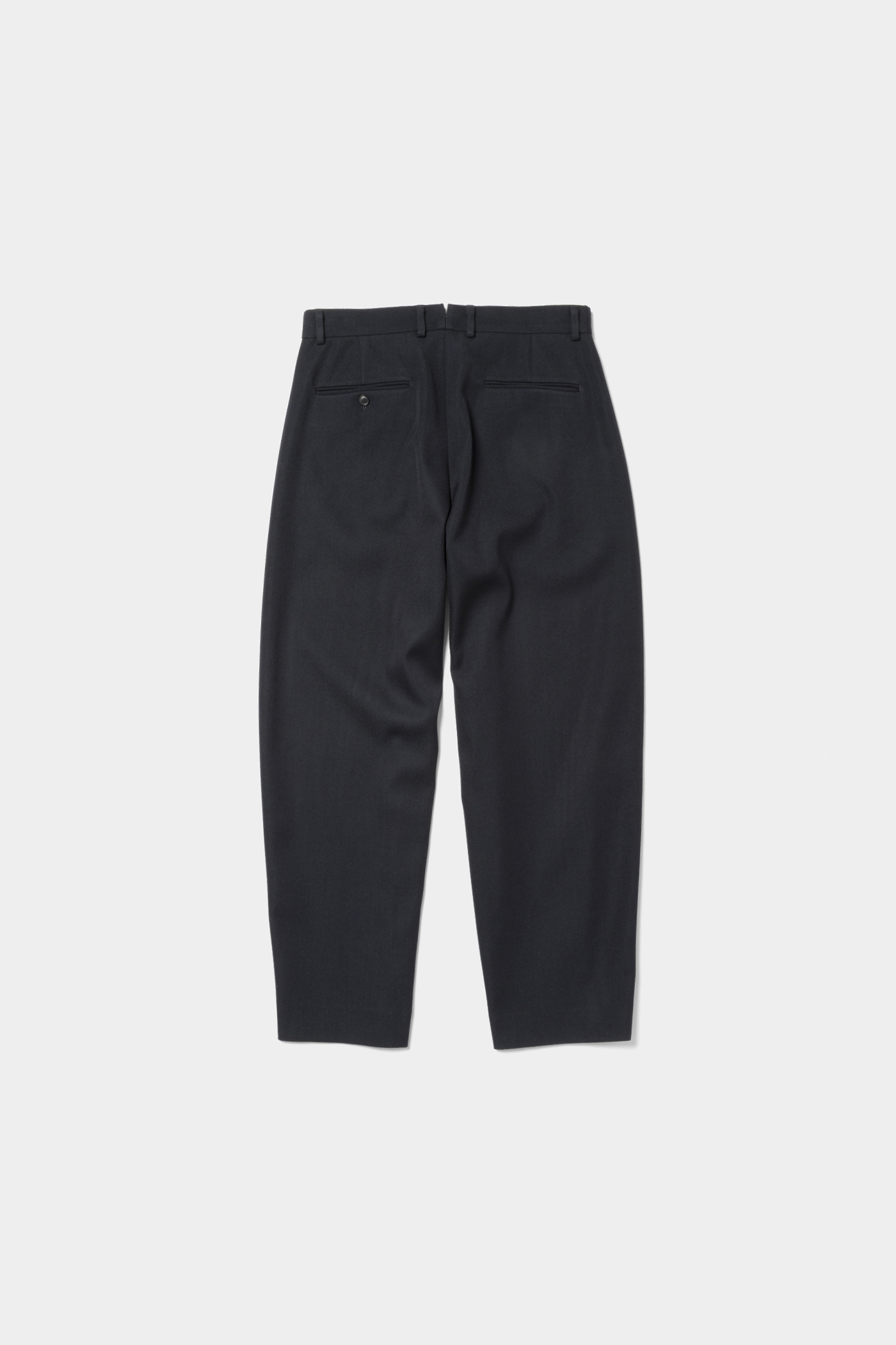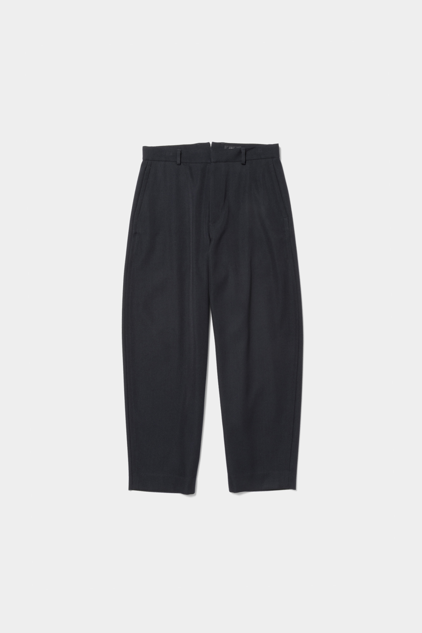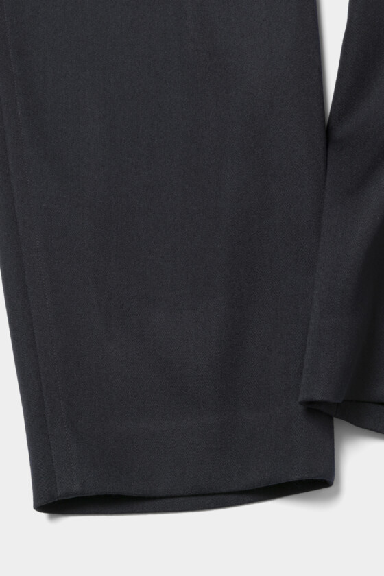 渡りのゆとりと膝下の収まり、その緩急のつけ方が非常に巧みです。太ももにボリュームを持たせつつ、裾にかけて自然にテーパードする構築で、どんな体型にもすっと馴染みます。ワイドでもストレートでも、はたまた単純なテーパードでもない。生地量が多くても重たく見えず、上品な佇まいを保つのは、この設計の妙だと思います。トレンドを超えて長く穿ける、完成度の高いパンツですね
