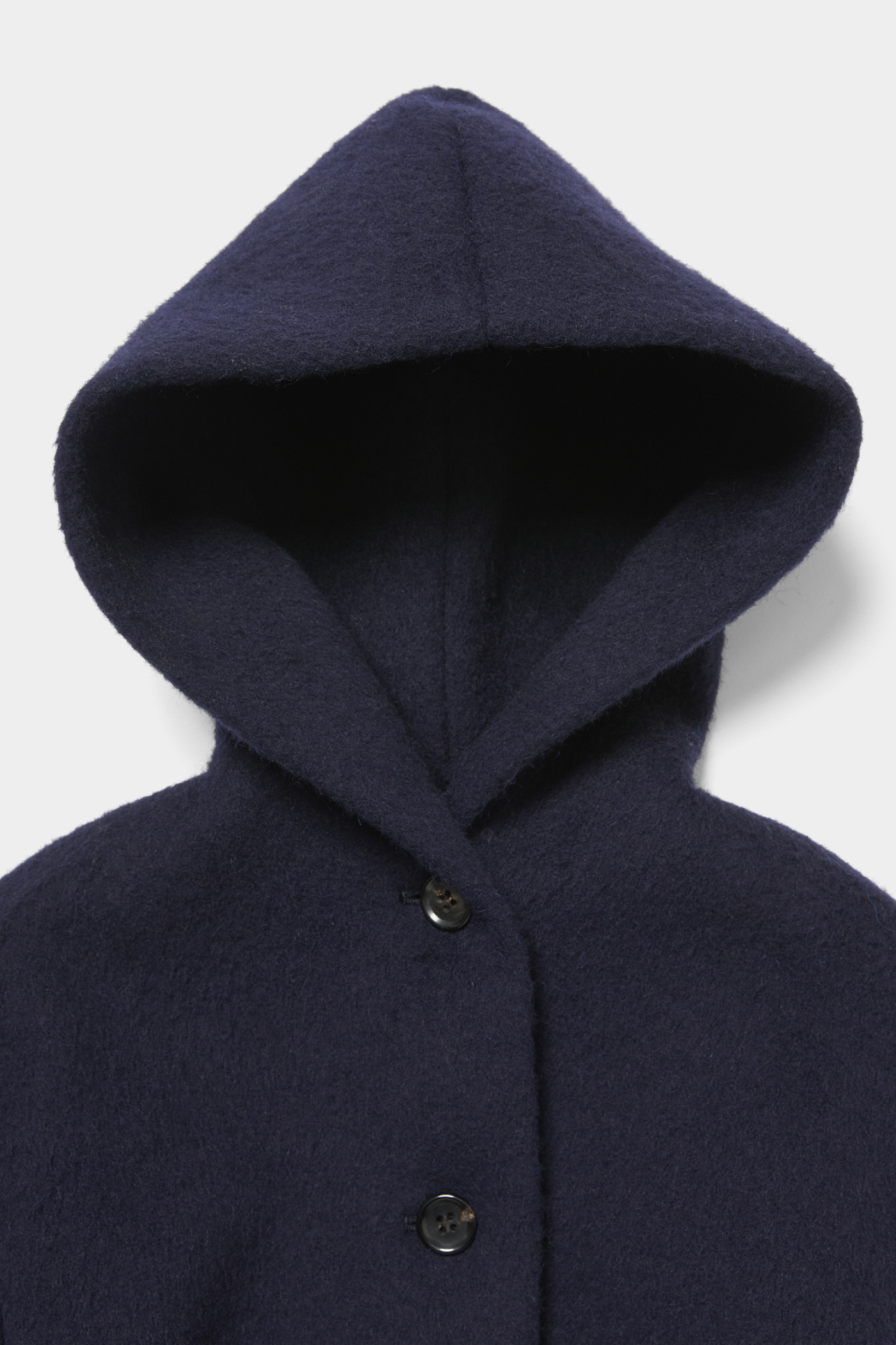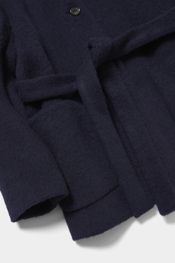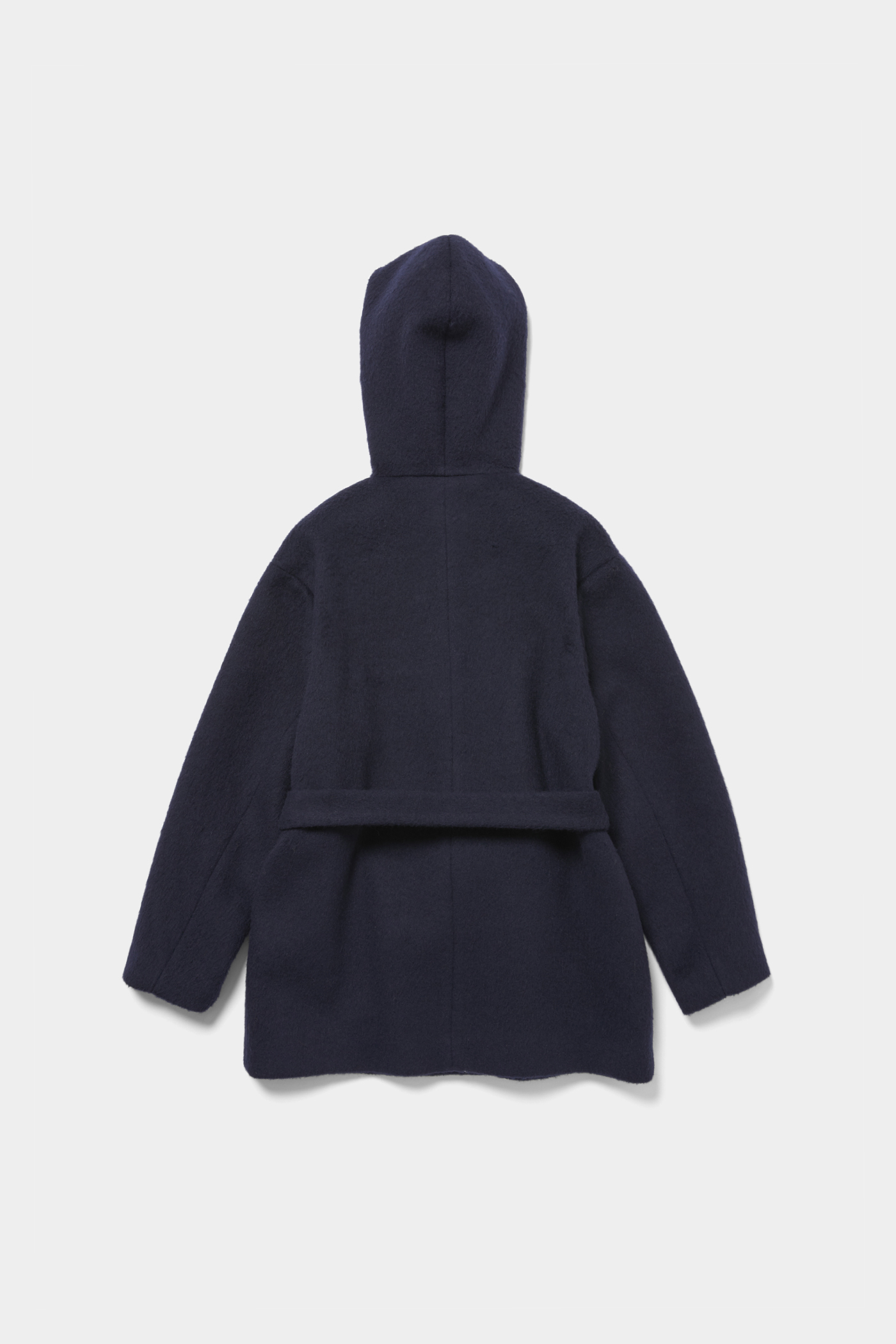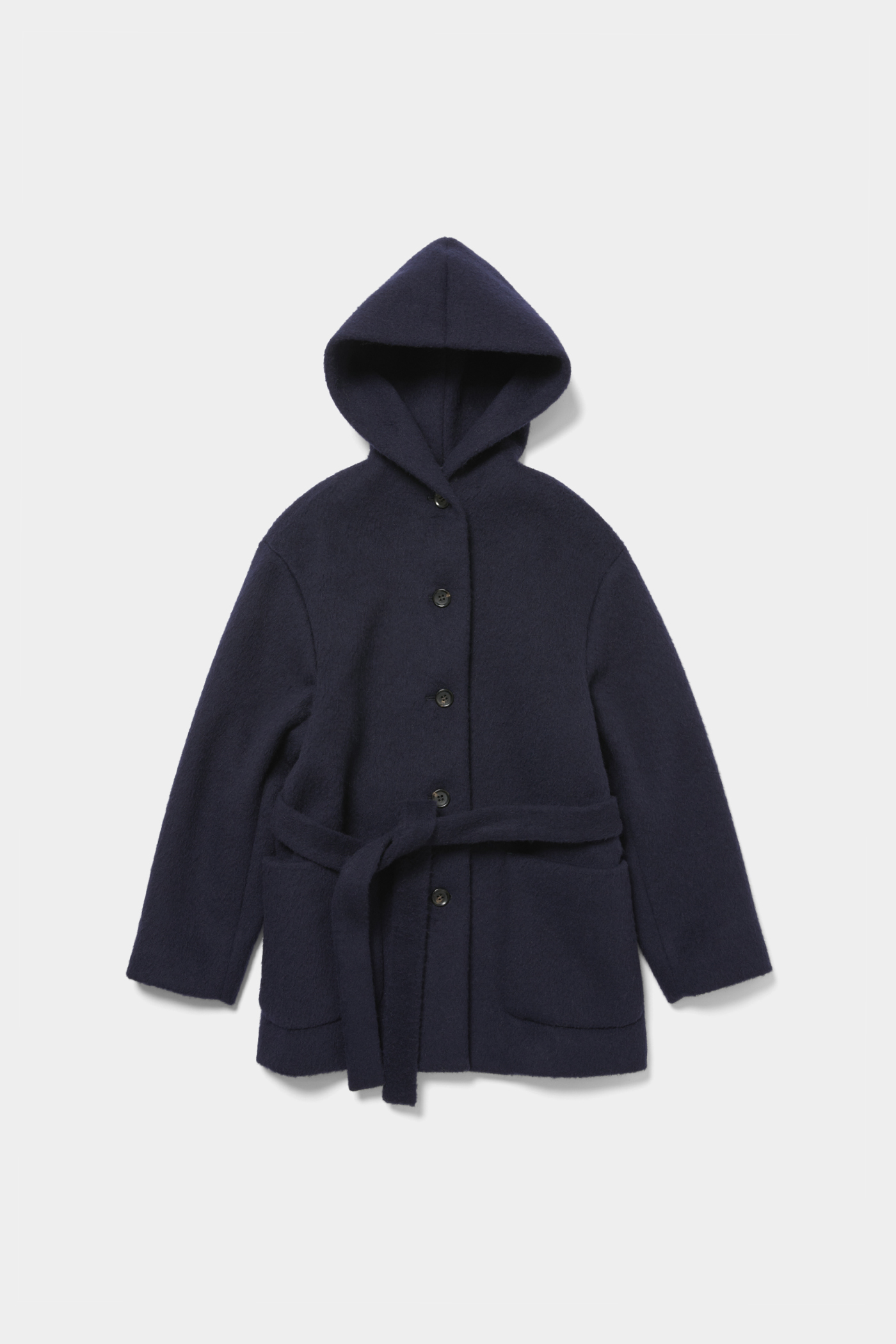 毛足のあるシャギー素材がやわらかな印象を生むフードコート。リラックスしたシルエットながら、共布ベルトでウエストを絞ると上品な雰囲気に仕上がります。