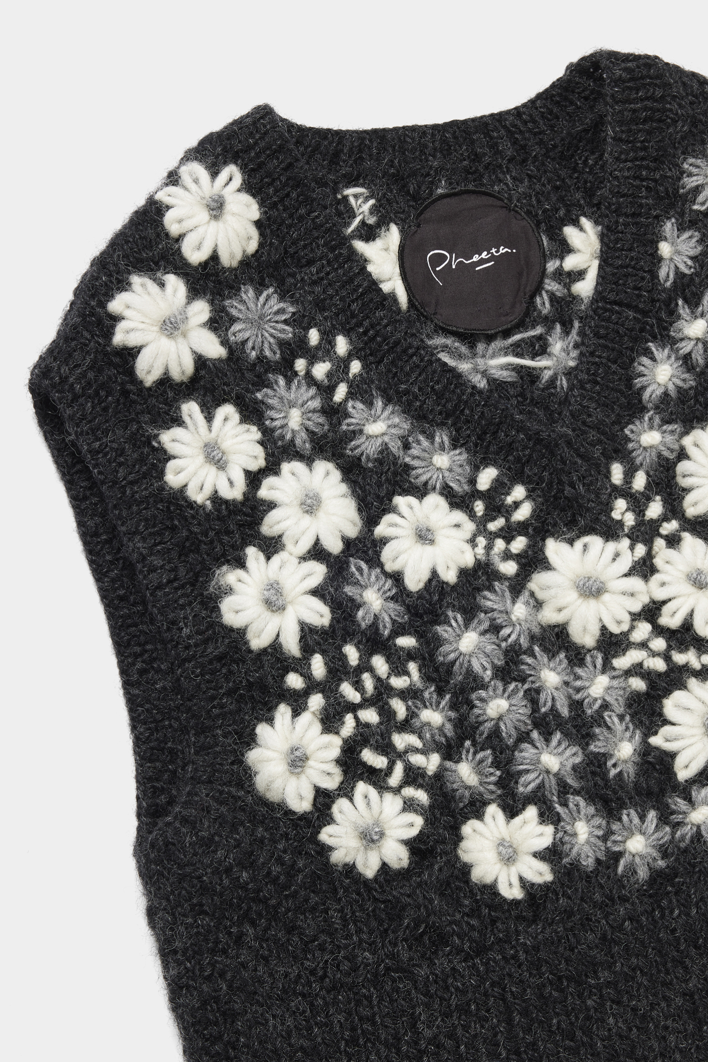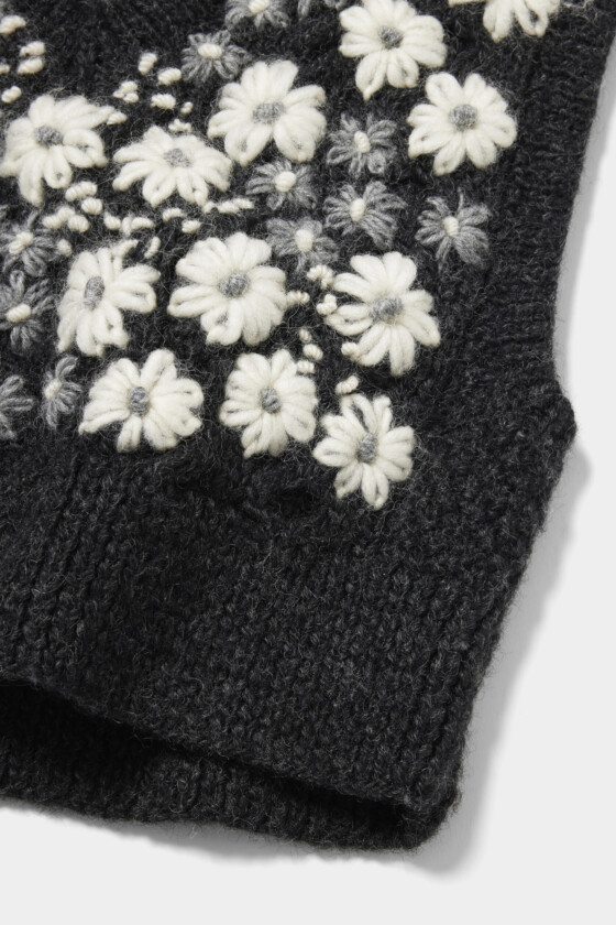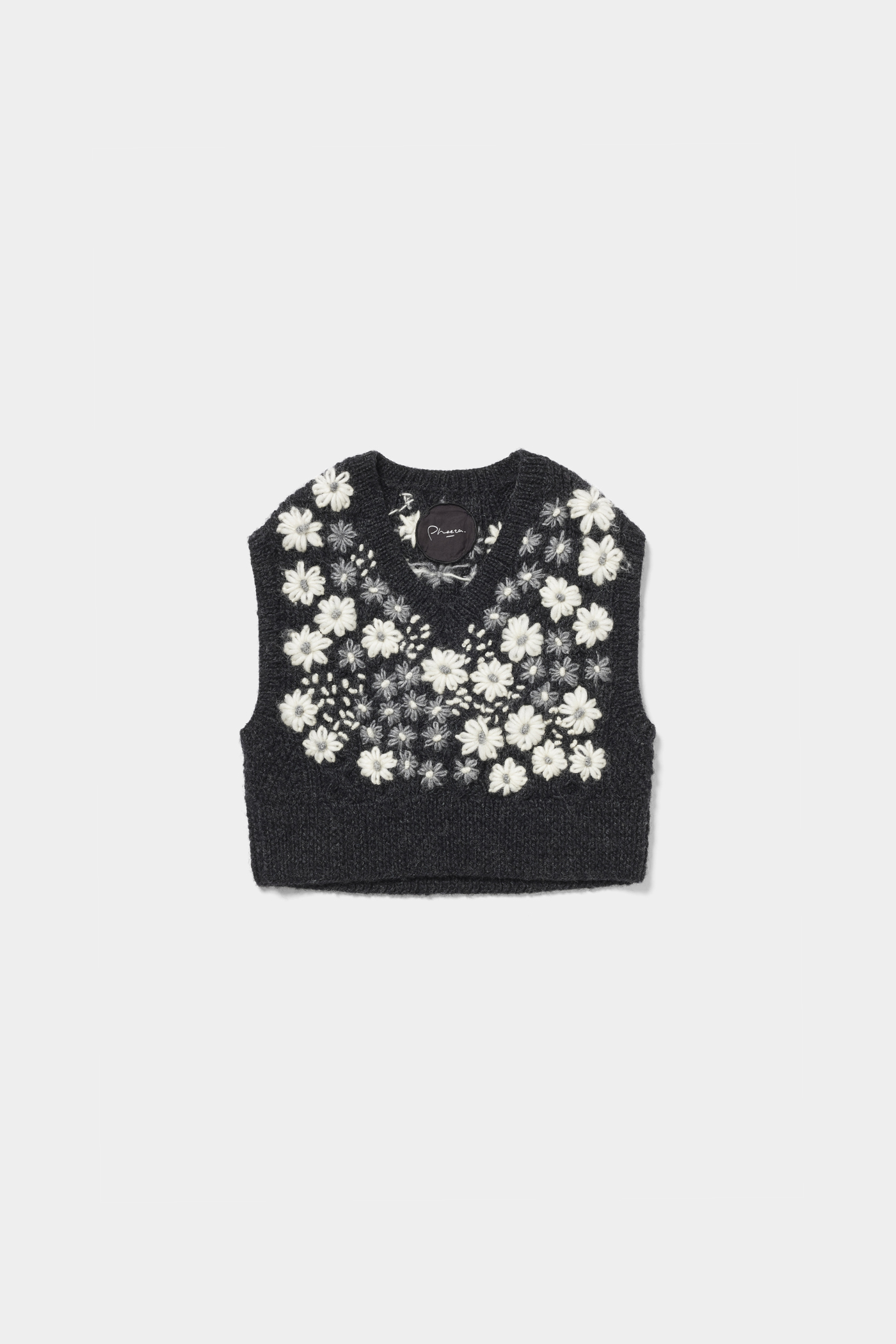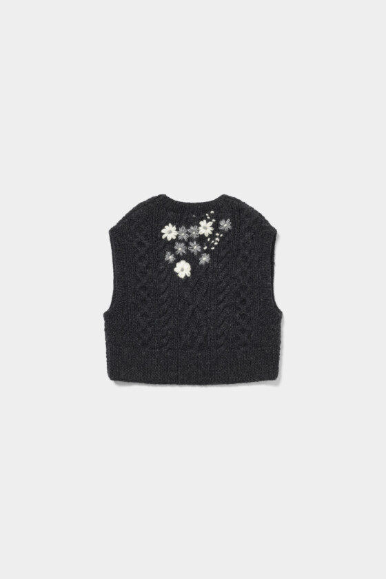 刺繍の入ったベストが、コーディネートに柔らかい存在感を放ちます
