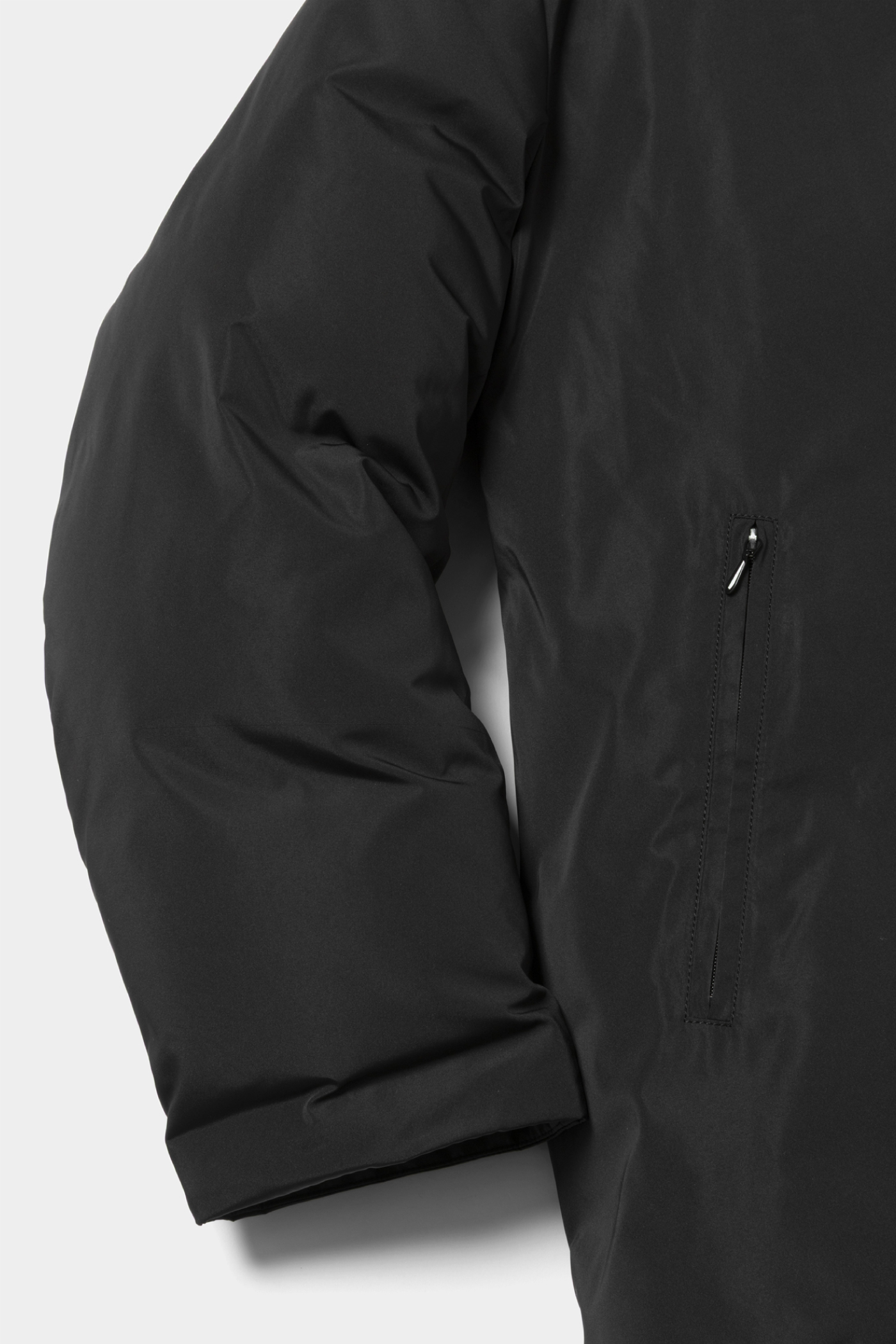 ポリエステルの中に10%だけシルクを混ぜた、この素材のあり方がすごく上品なんですよ。触るとサラッとしていながら、わずかな引っかかりがあって、軽やかだけど存在感がある。裏地に入った細かなステッチで立体感を出しながら、表はつるっとしていてとても美しいんです。腕のパターンもわずかに前へ湾曲していて、構築的で男らしいシルエットを生んでいる。〈ロエフ〉の服づくりの緻密さがよく表れています