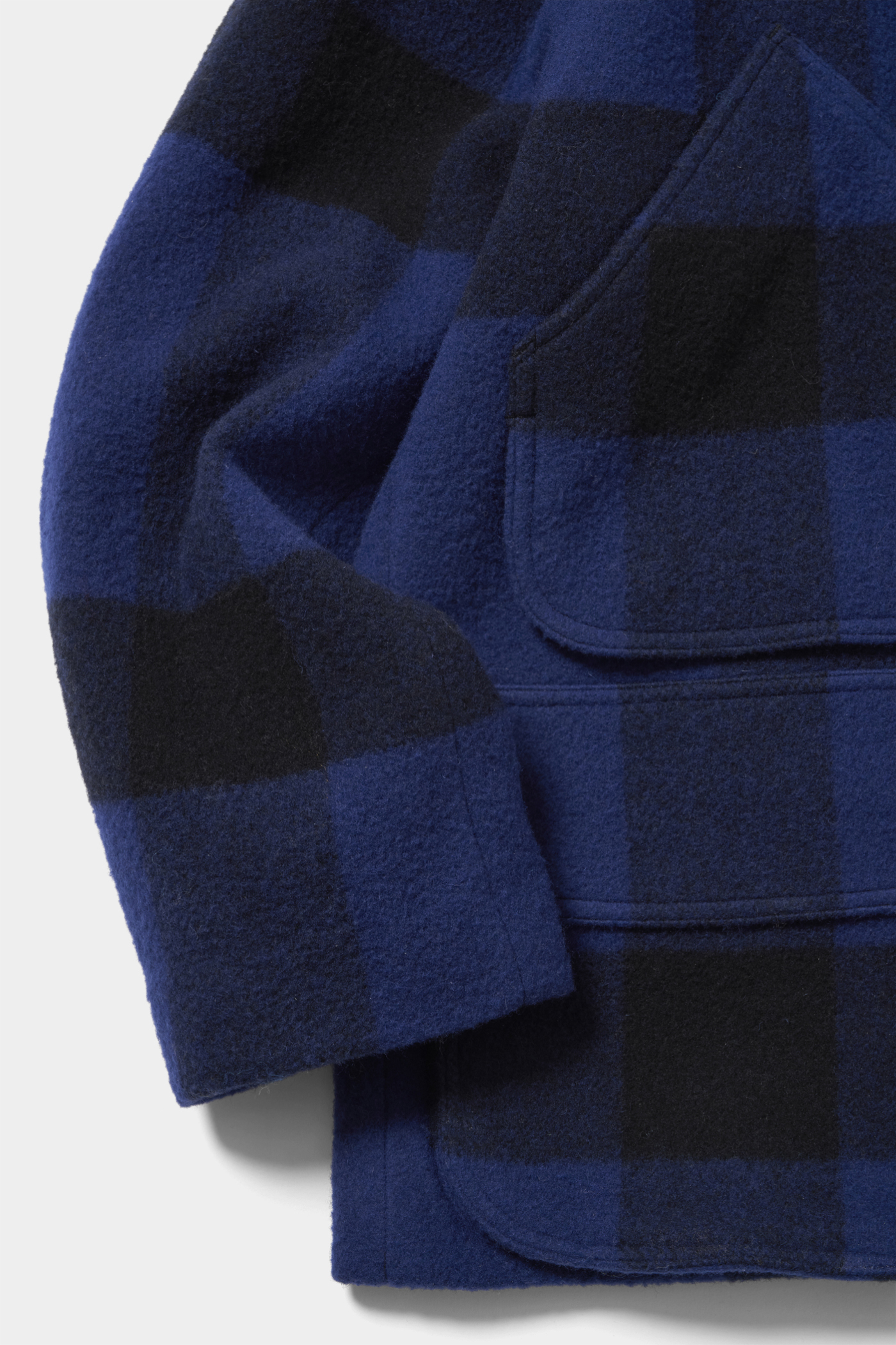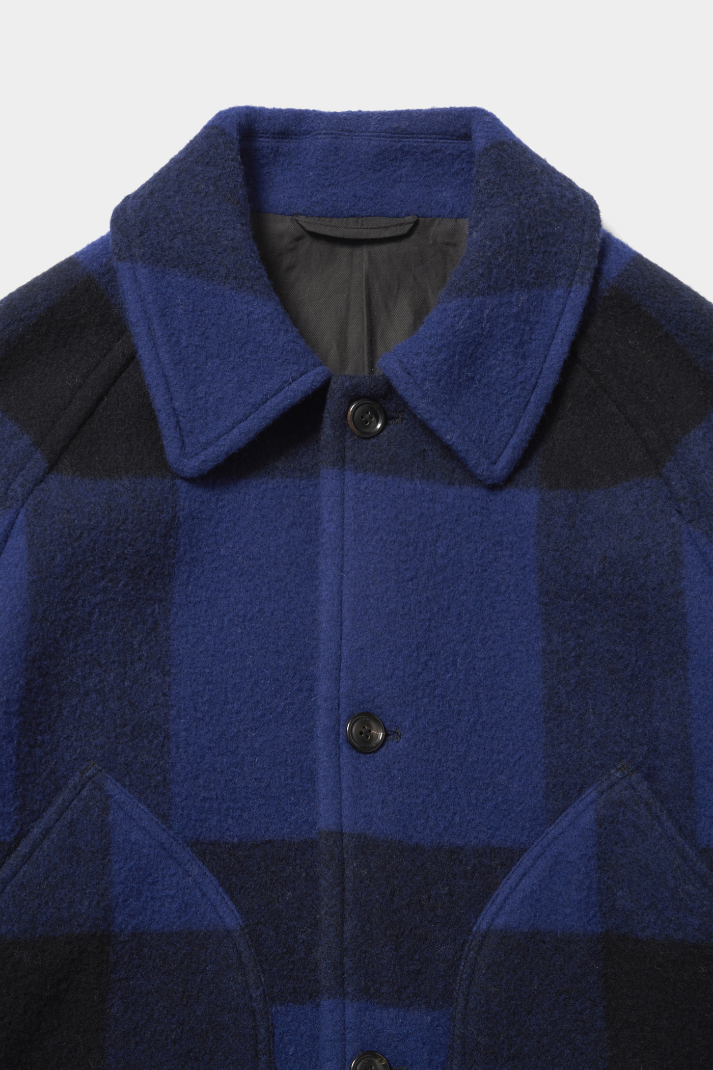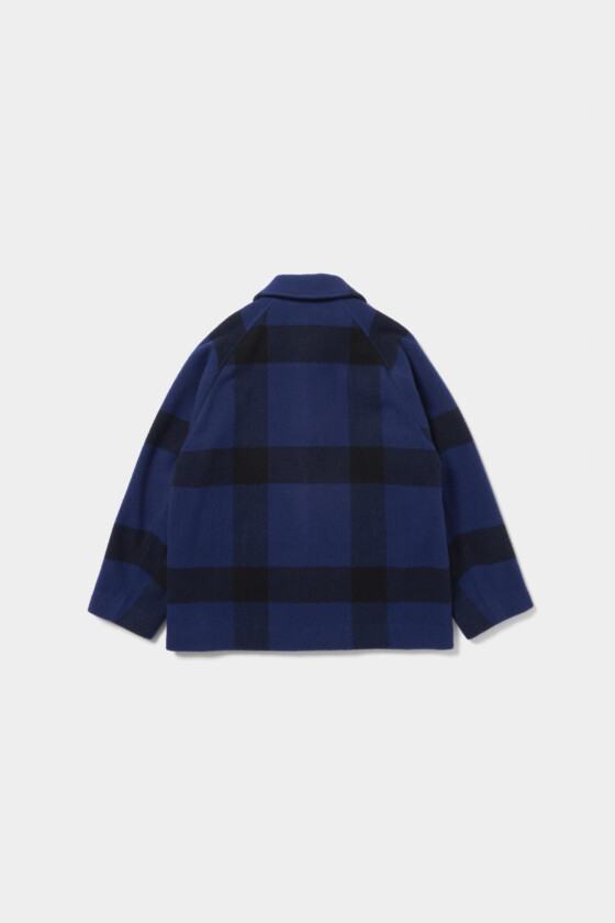 別注色のブルーの大判チェックが目を惹くハンティングジャケット。ウールの質感が温かみをプラスしてくれます。