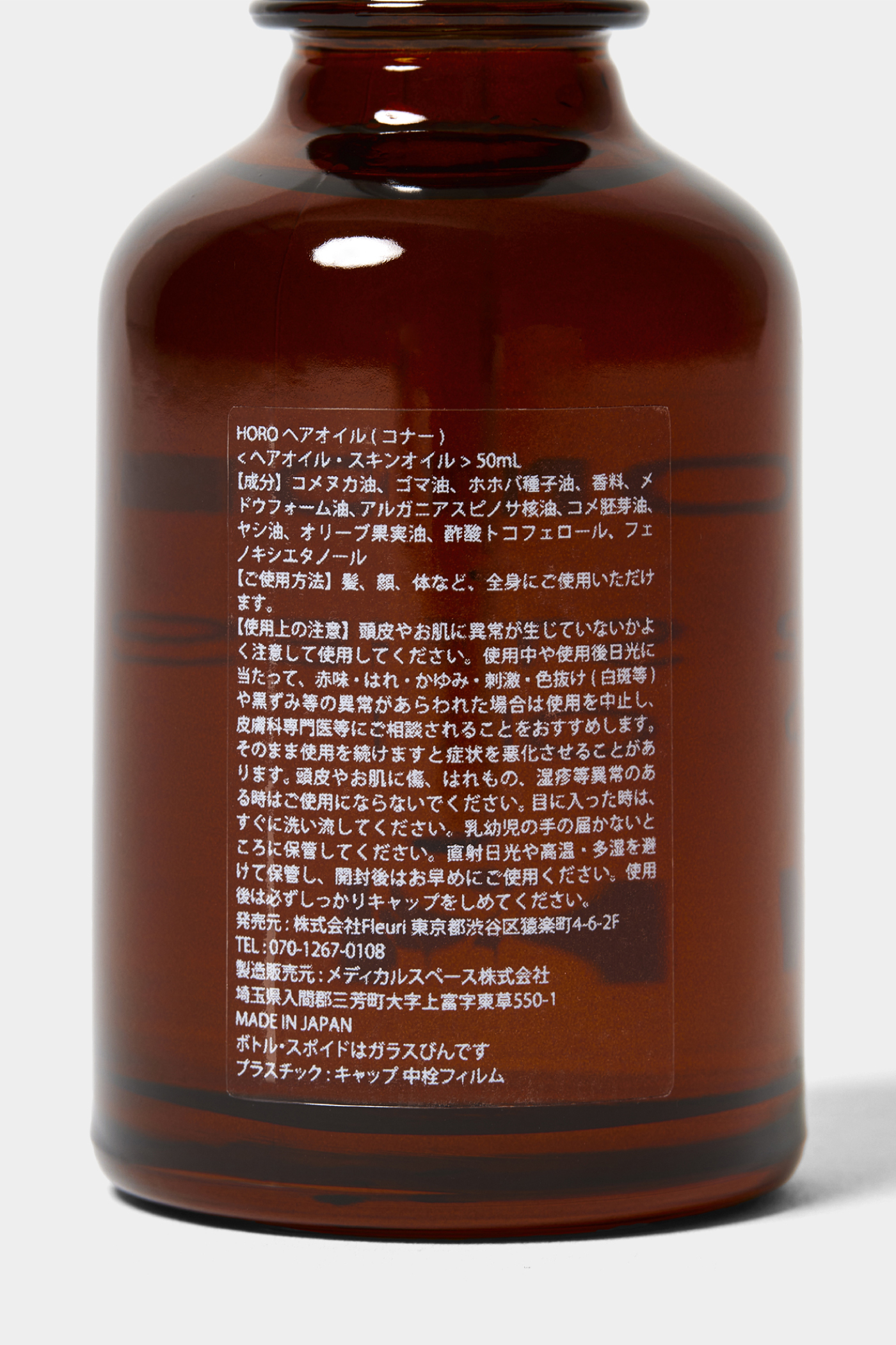 ヘアケアプロダクト〈HORO〉より、コメヌカ油・コメ胚芽油をベースに採用した、指通りの良いスムースな使用感が特徴のヘアオイルCONORを別注。ジェンダーやスタイルを問わず、どんな感性にも寄り添う、毎日のルーティンに取り入れやすいプロダクト。ウッディムスクの余韻が特徴的な、現代的で控えめなエレガンスを体現した、タイムレスな香りのプロファイルです。