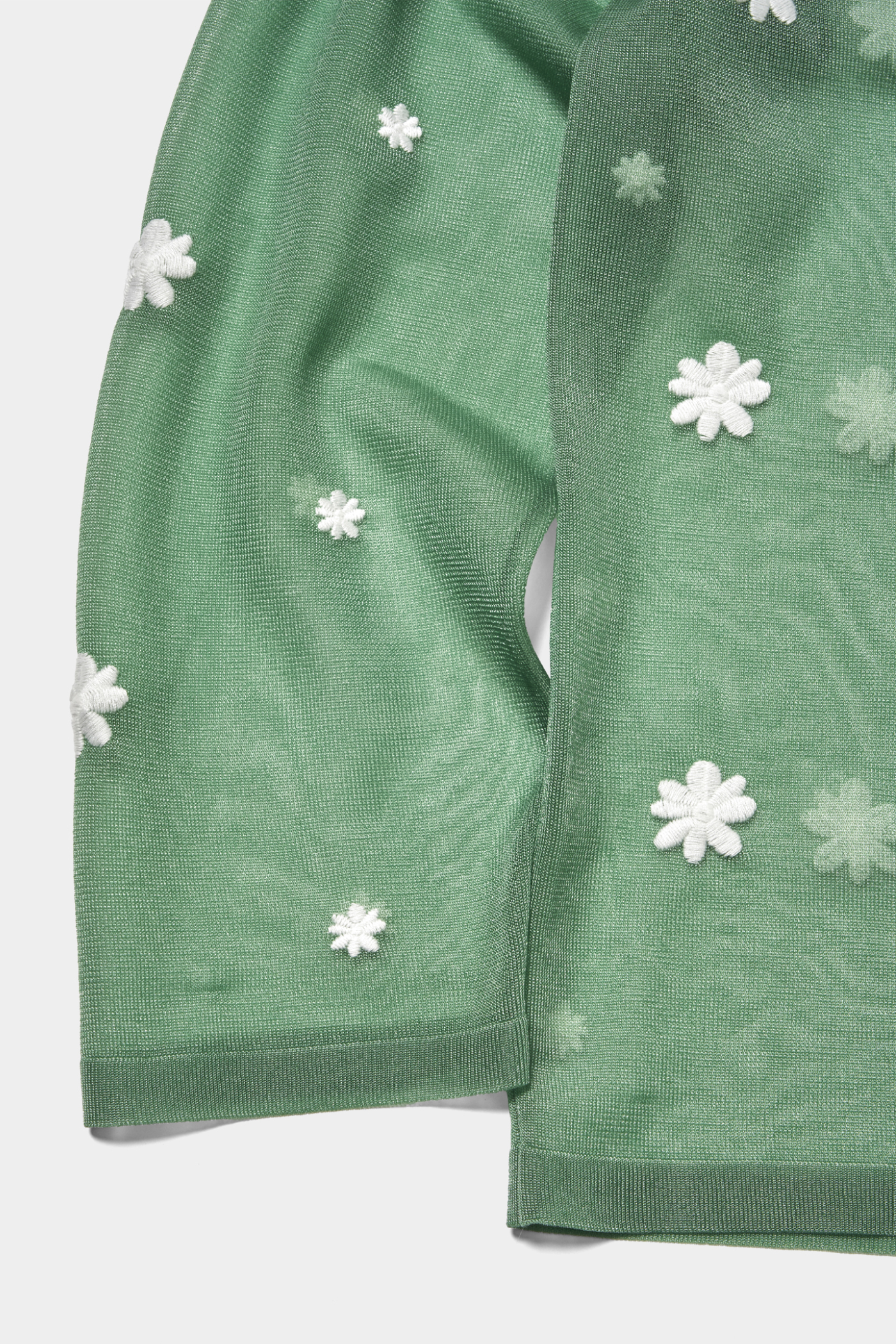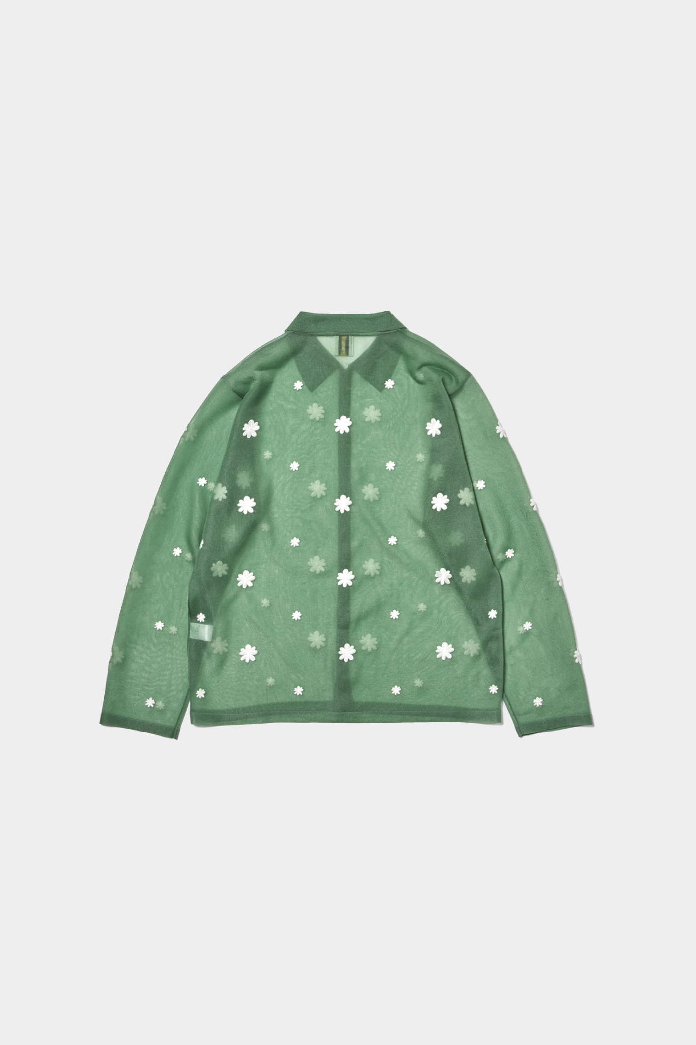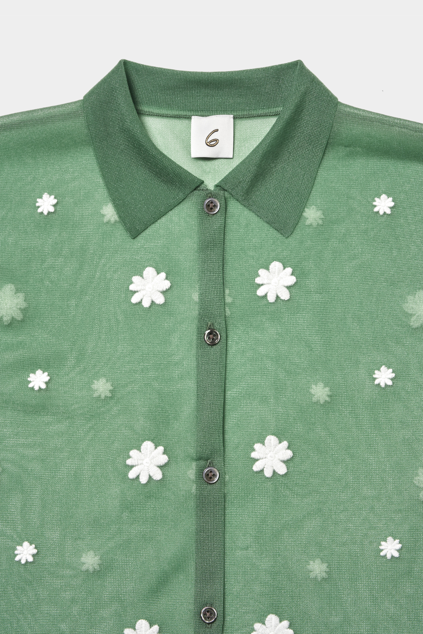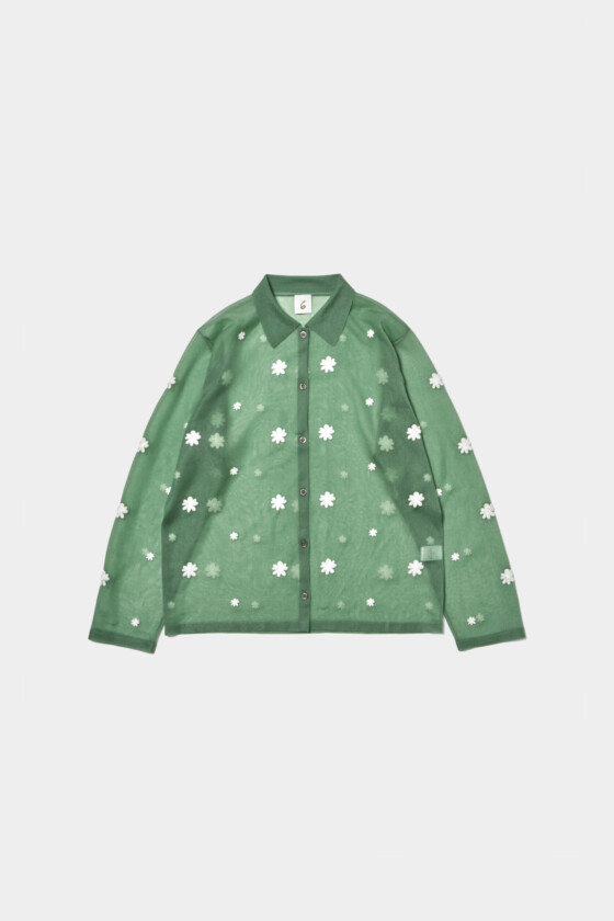 生命感あふれるグリーンが華やかな〈ROKU〉のシャツ。シアー素材で透けるので、キラキラのスパンコールのような異素材のインナーを組み合わせるのがおすすめです。