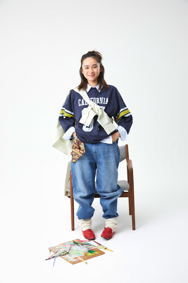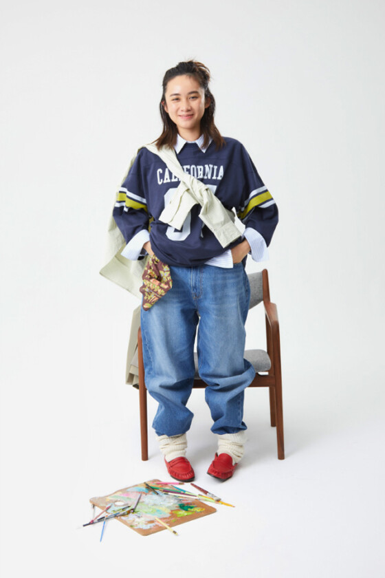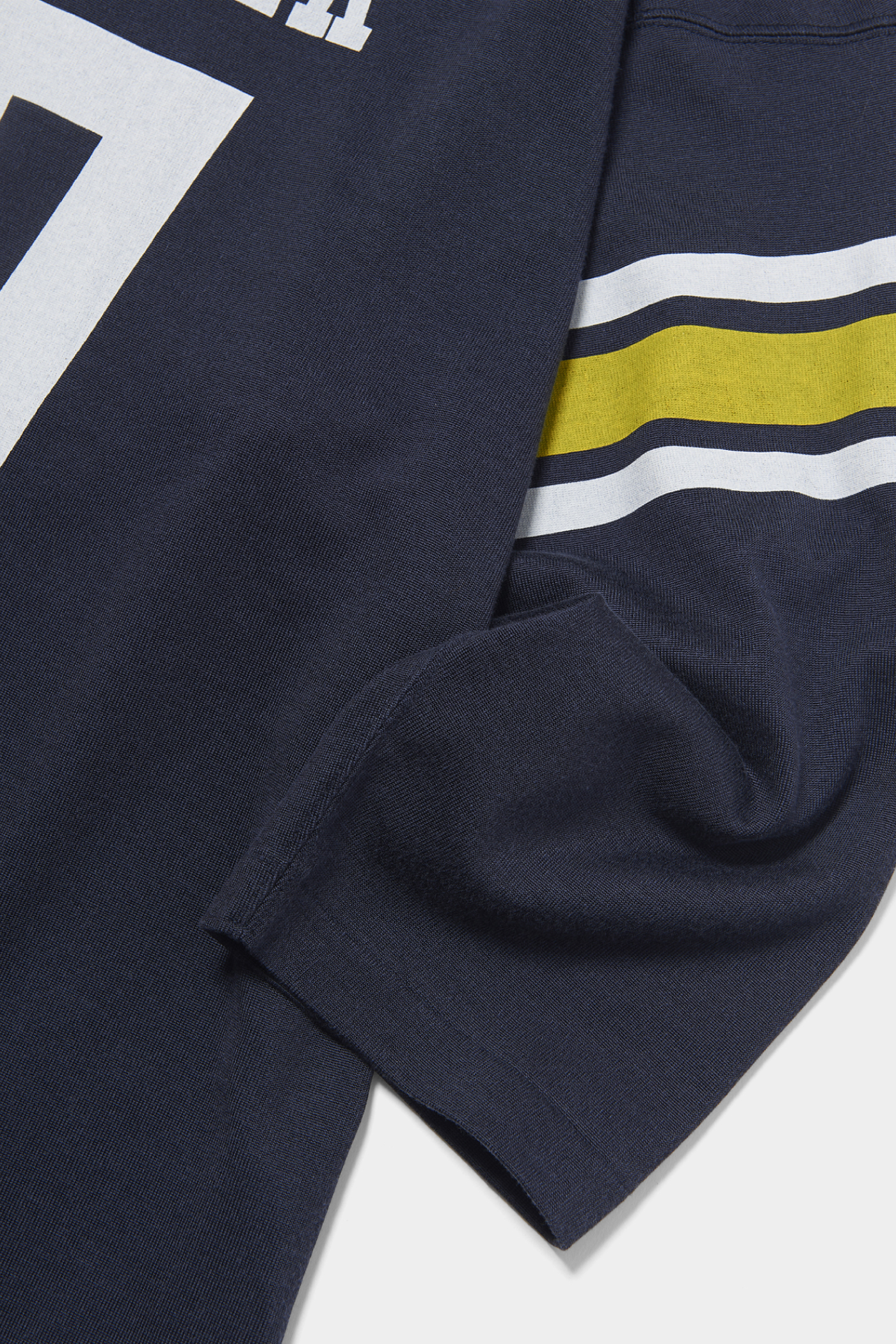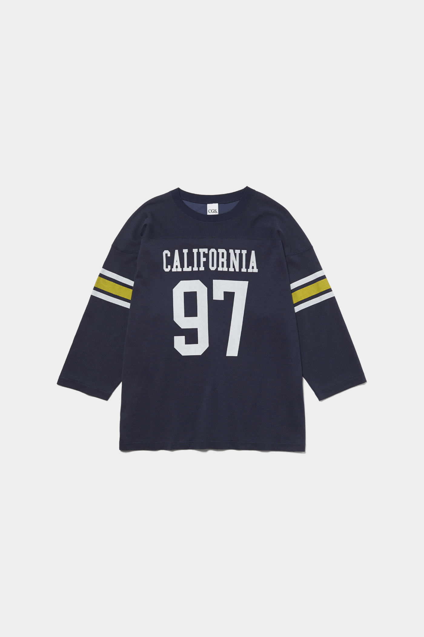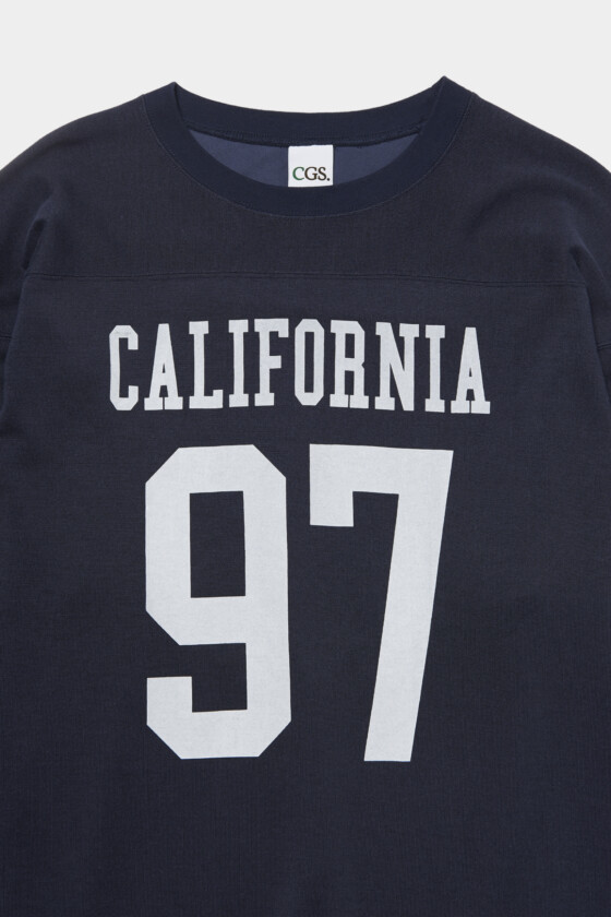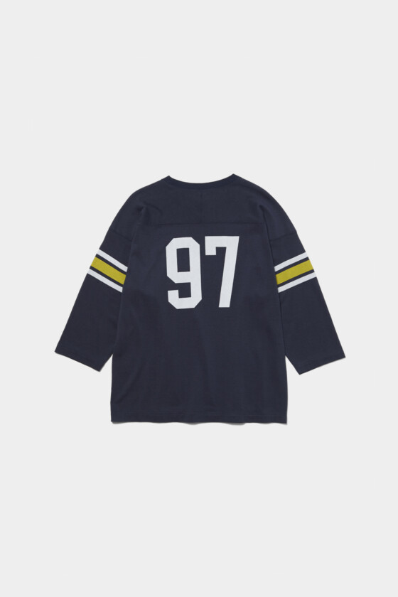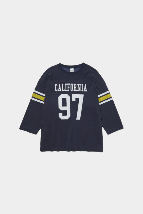 気分は90年代のアメリカ、西海岸のキャンパス・ライフ。メンズのフットボールTなので、インナーにシャツを合わせてレイヤーを楽しむのがポイントです。