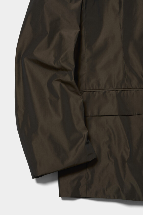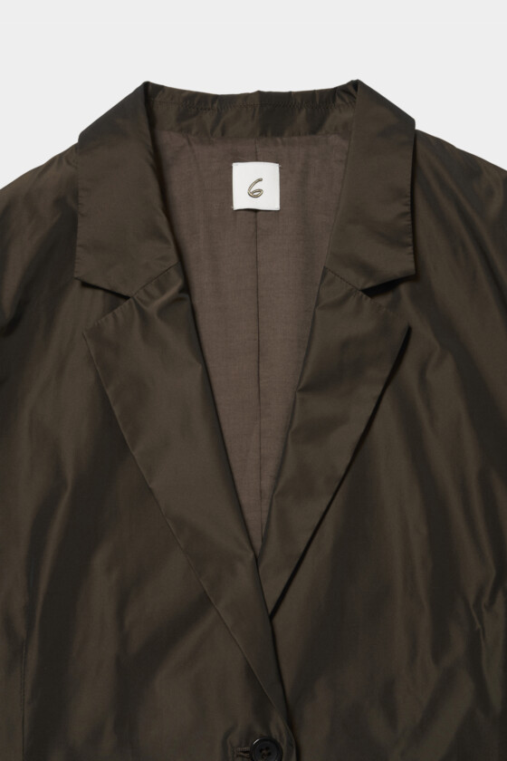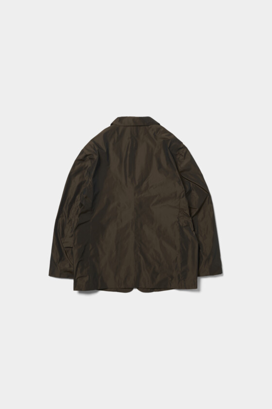 ジャケットは好きなんですけど、どうしてもブラックを選びがちで、こういうブラウン系の色味は自分ではあまり手に取らないですね。しかも素材に少しシャカっとした軽さと光沢があって、ブラウンといっても単純な茶色じゃなく、ほんのりグリーンっぽさも感じる不思議な色味なのが面白いなと思いました。今ちょうど髪色が暖色寄りなので、着てみたら意外と今の自分にしっくりきたんです。(21歳/モデル/瑚雪)