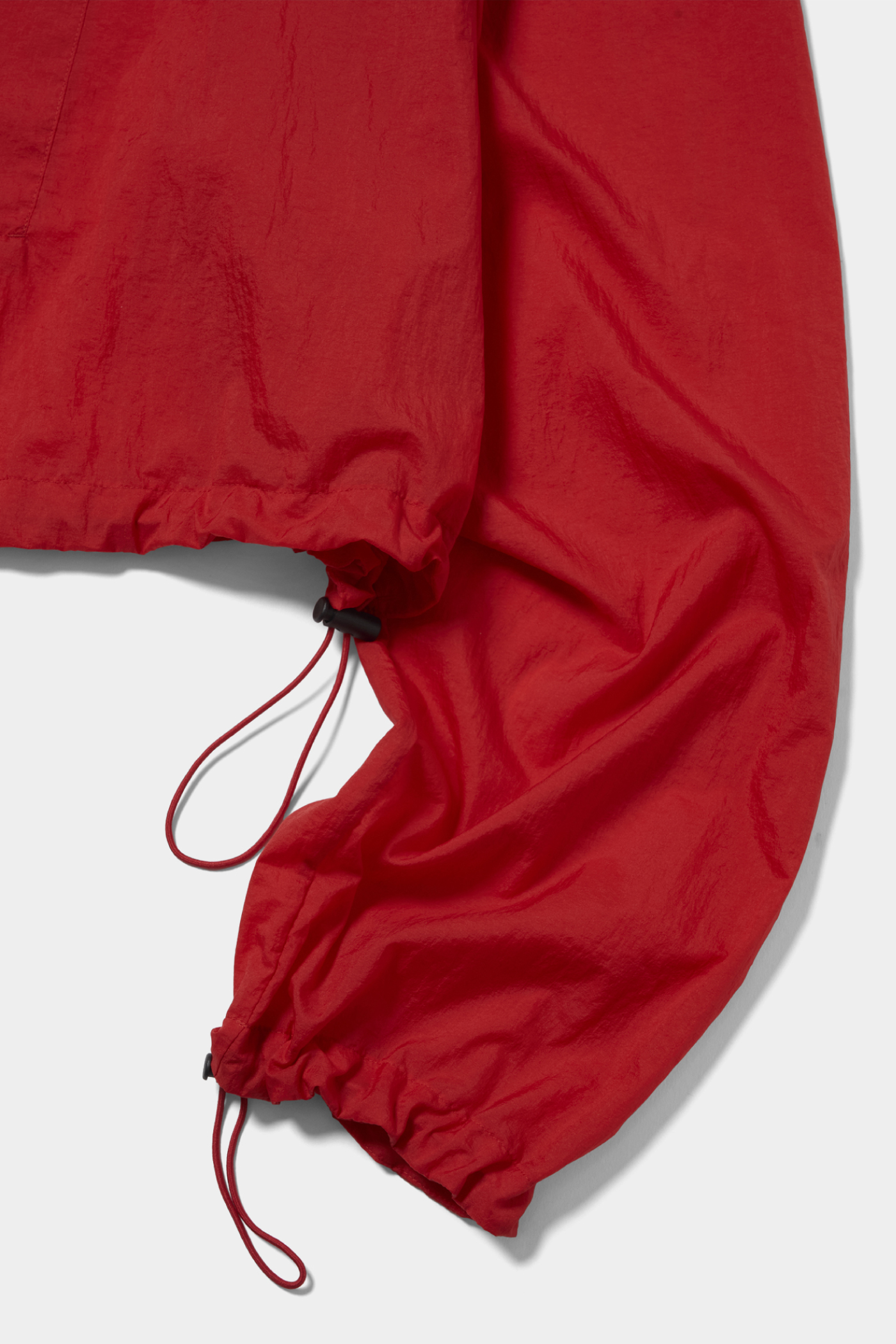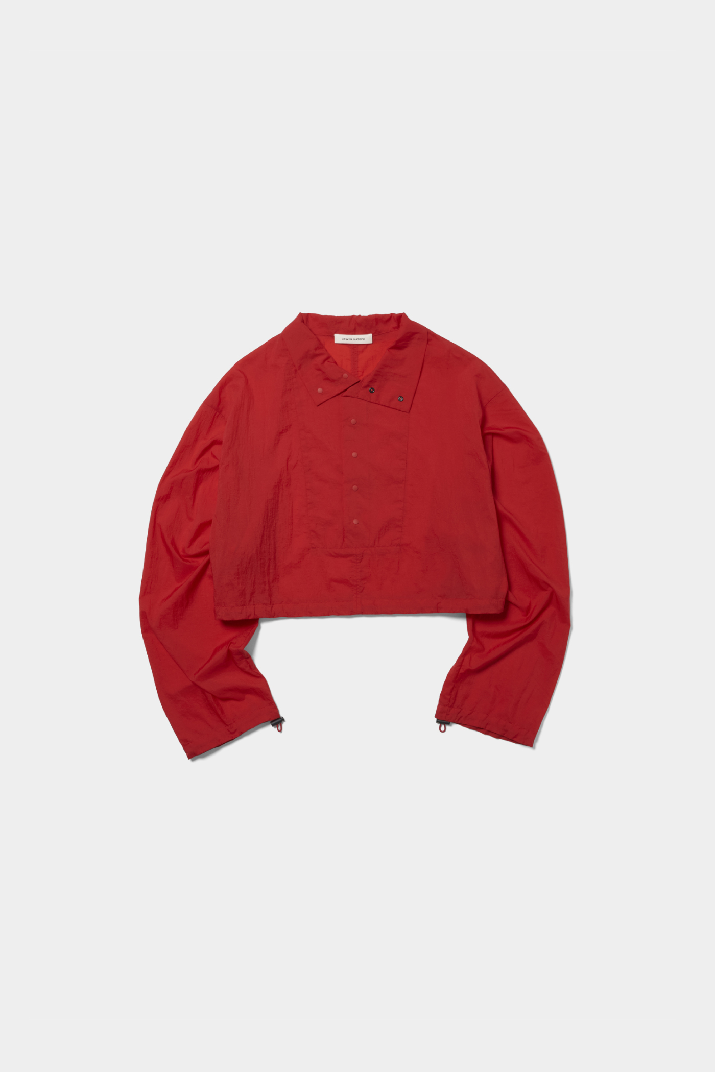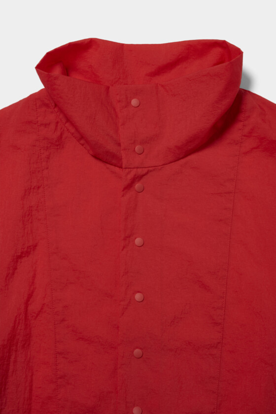 赤といっても真っ赤ではなくて、少し黄みのある朱赤っぽい色で、主張はあるのに強すぎないところが印象的でした。前を少し開けてインナーを見せる着方も新鮮で、テックっぽさがありつつ、どこか品もあって意外と取り入れやすい。ウエストを絞れるディテールや、巻き物を合わせたときのバランスもかわいくて、着方次第で印象が変わるのも魅力だと思います。(19歳/文化服装学院/石川璃月)