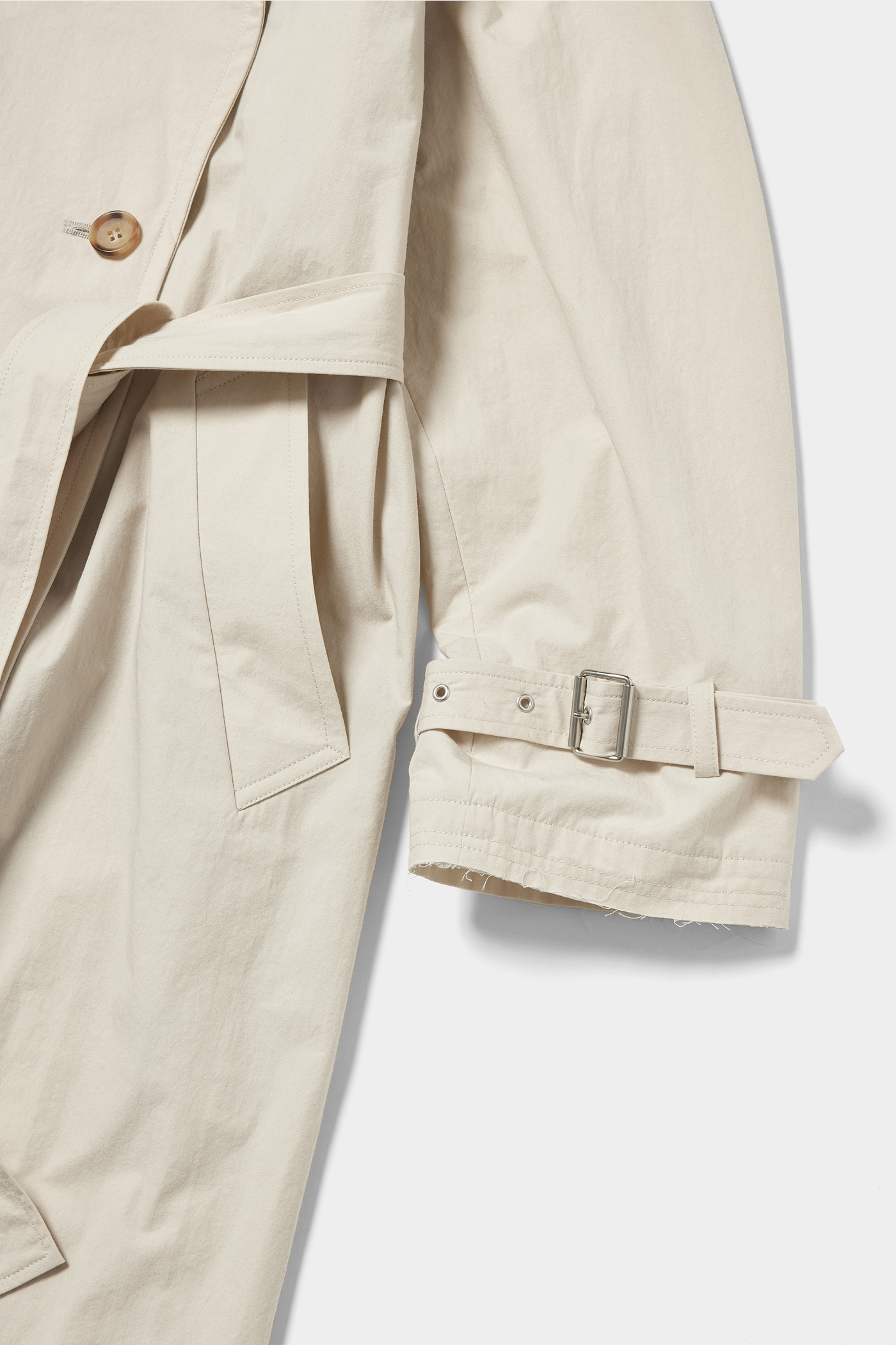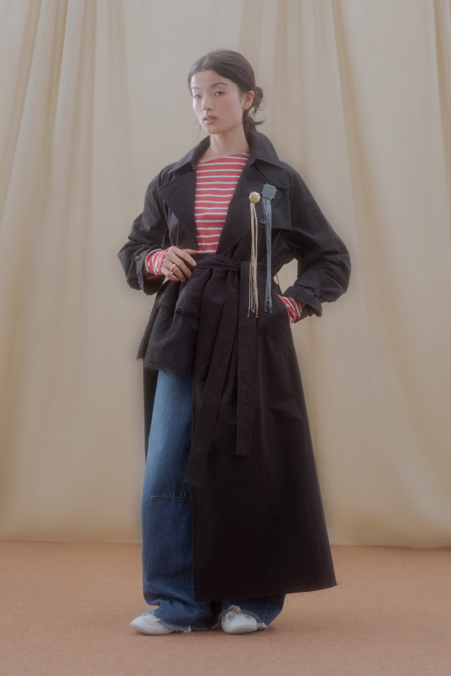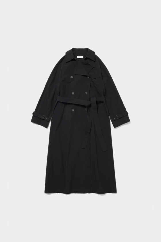 一枚でスタイリングが完成するトレンチコート。長い着丈は、ドレスを纏うような気持ちで取り入れたくなります。クールなブラックカラーが装い全体を引き締めてくれて、凛とした印象に。袖口をぎゅっと絞ってインナーをのぞかせることで、レイヤードの楽しさも広がりそう。