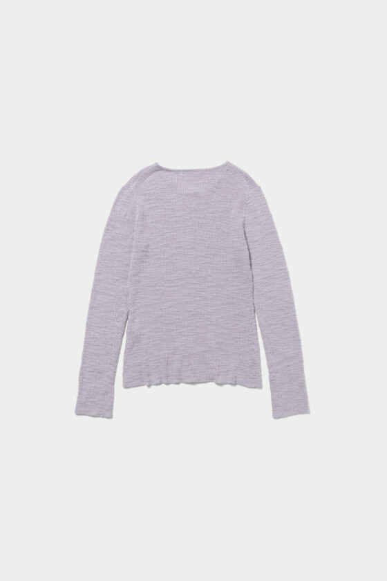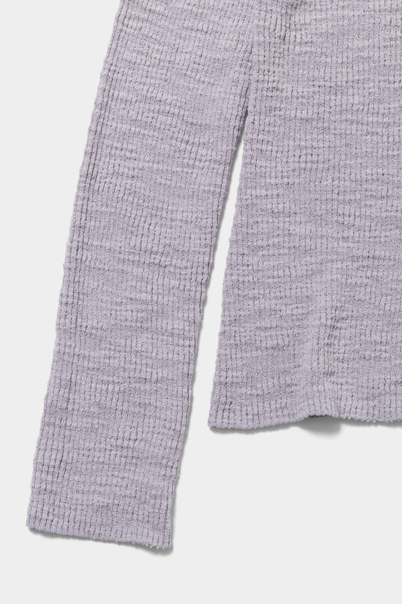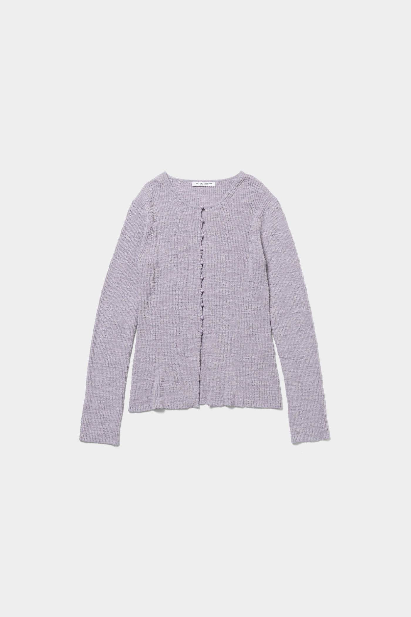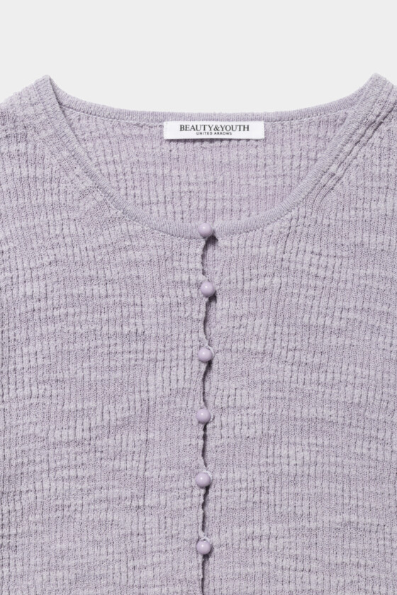 着回し力の高さに惹かれたカーディガン。淡いパープルカラーが可愛く、シンプルな装いの差し色としても活躍しそうです。羽織りとしてだけでなく、ボタンを留めてプルオーバー風に着たり、腰に巻くアレンジもできるので、スタイリングの幅が広がりそう。凹凸のあるスラブ素材とコンパクトなシルエットも今っぽい一着。