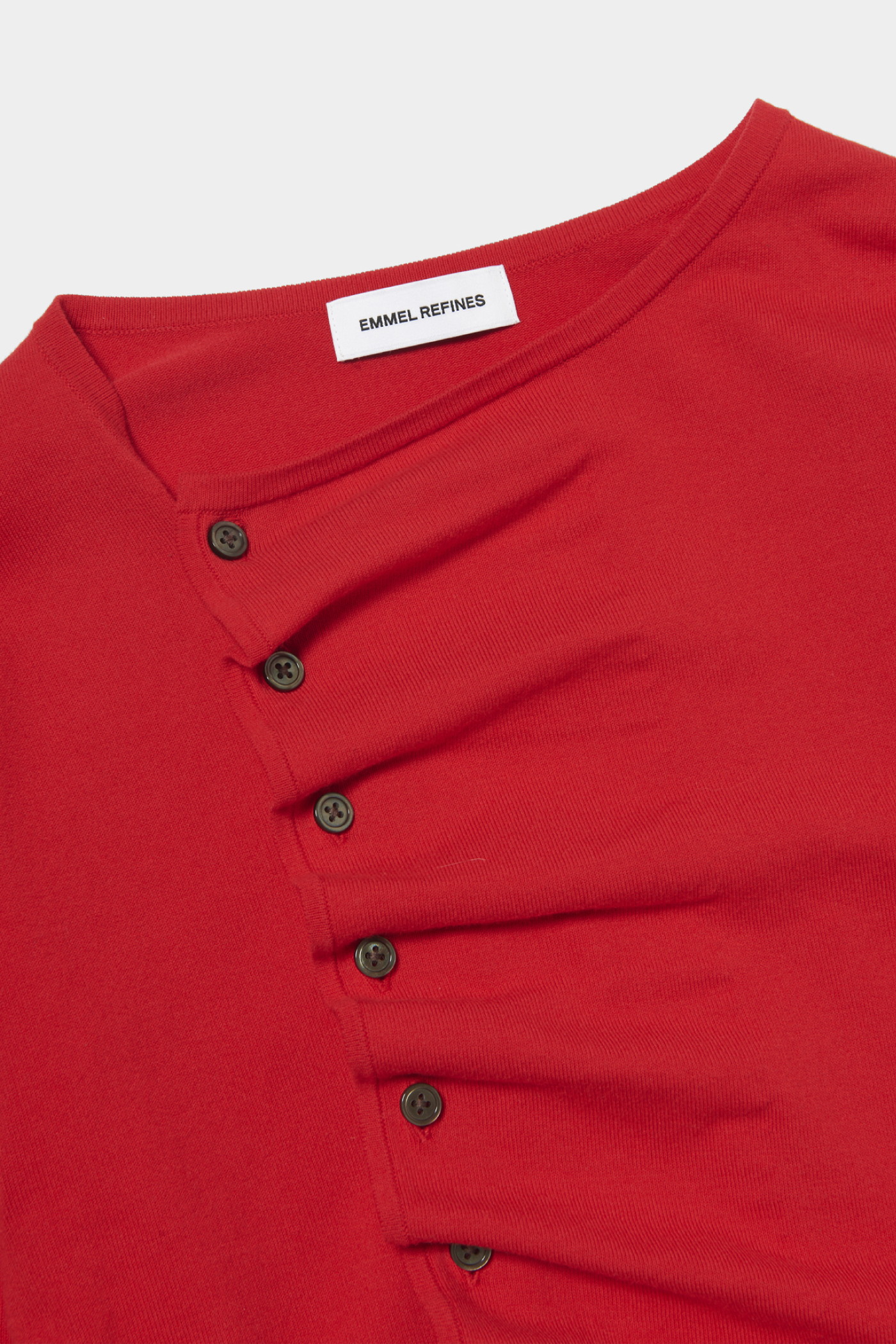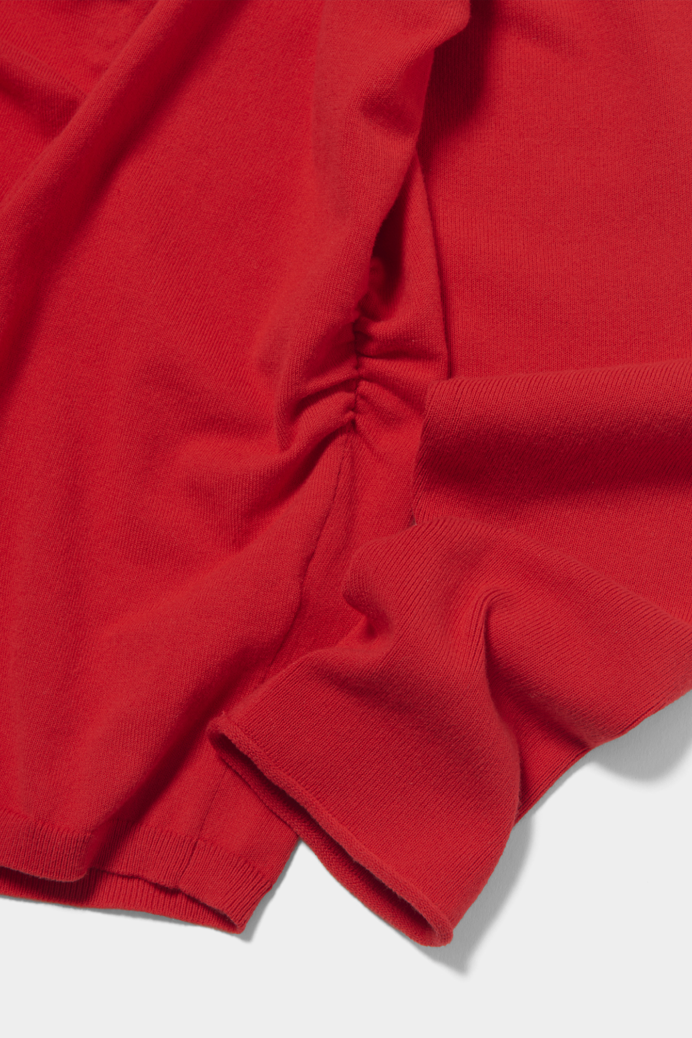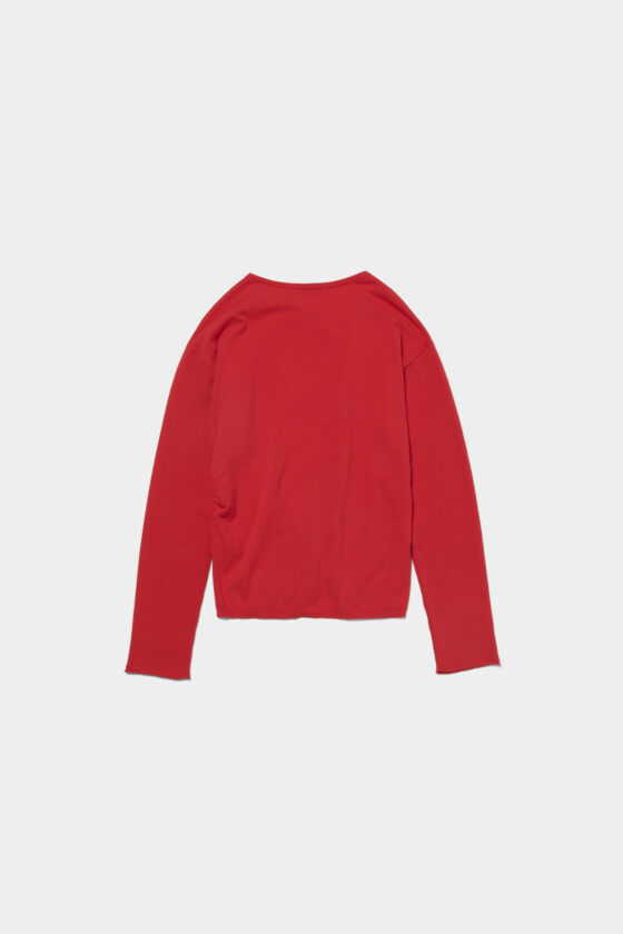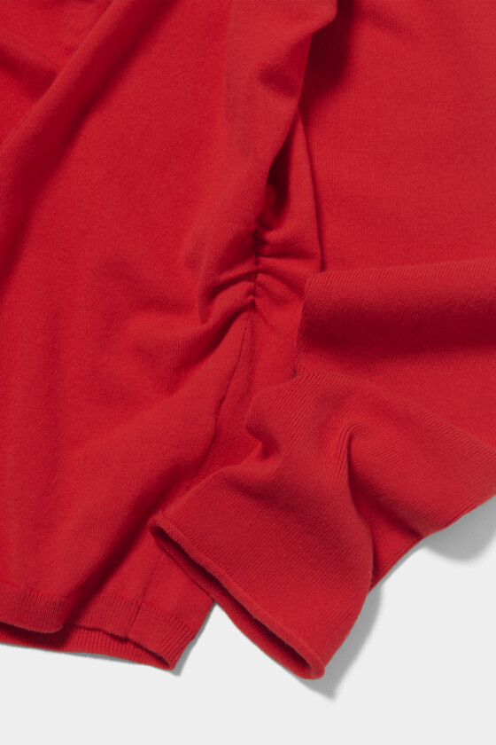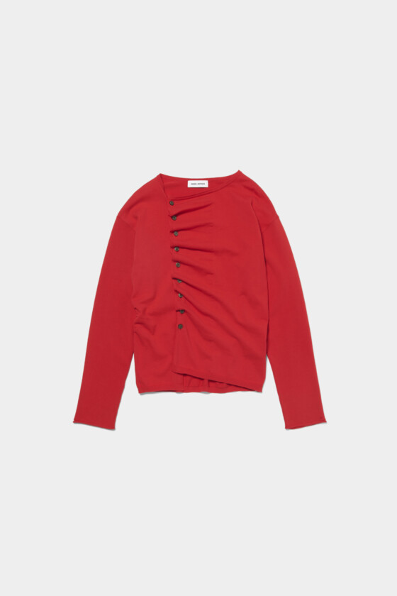 斜めに入ったプリーツの表情がとても素敵!サンドイッチのトマトみたいな、少し赤みを帯びたカラーがスタイリングの差し色になってくれます。アシンメトリーのボタンもアクセントに。ハイゲージのニット素材で春先にも着やすく、オンオフ問わず幅広いコーディネートに活躍しそう。