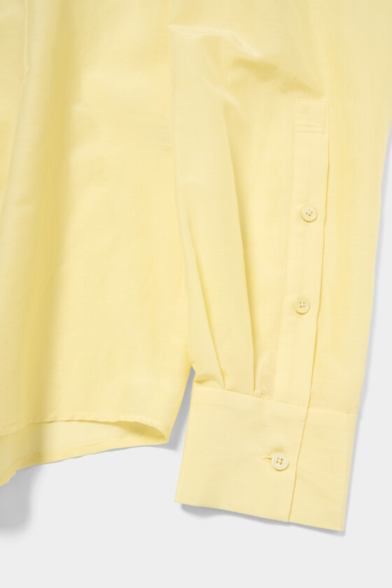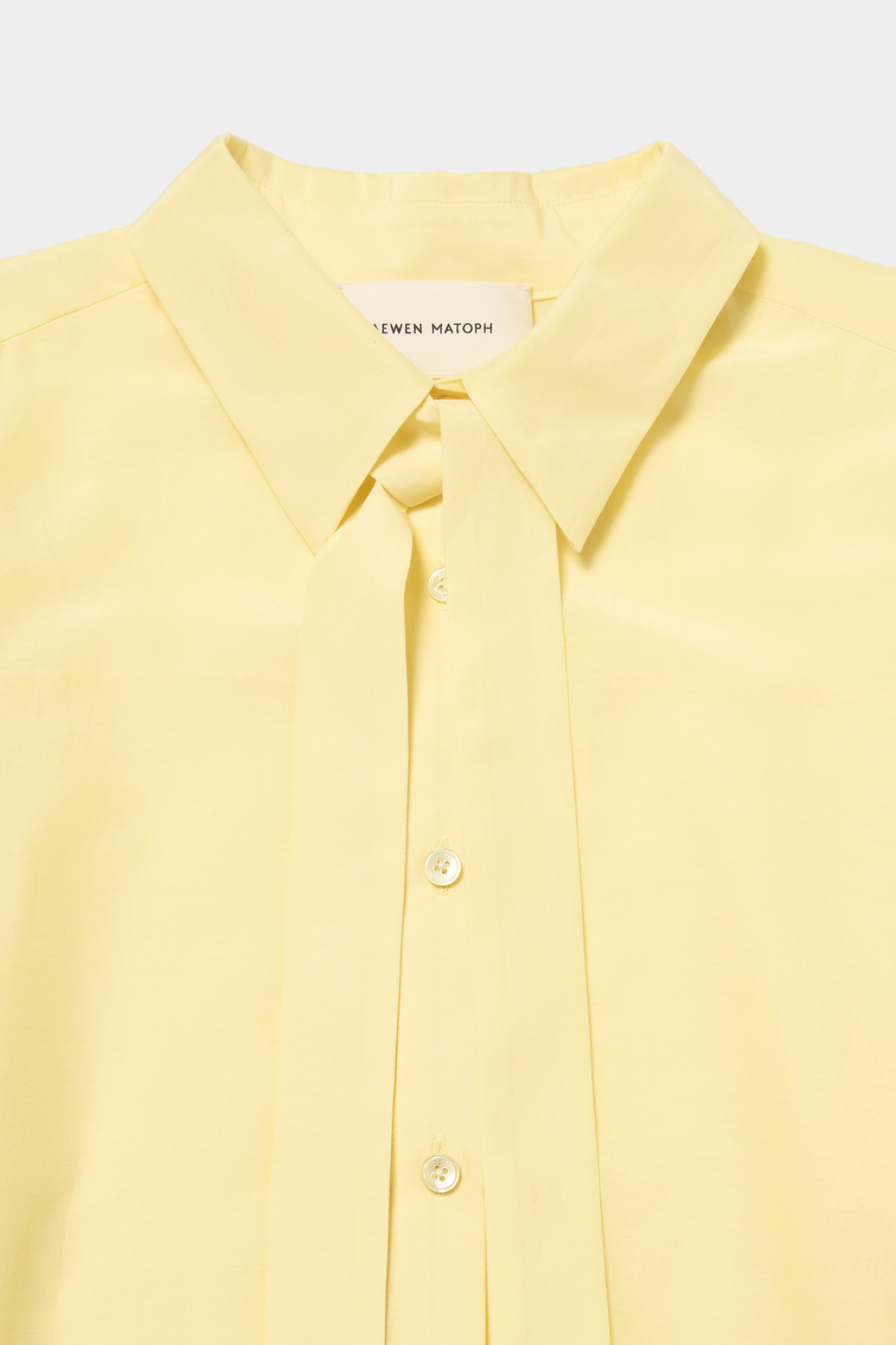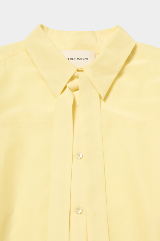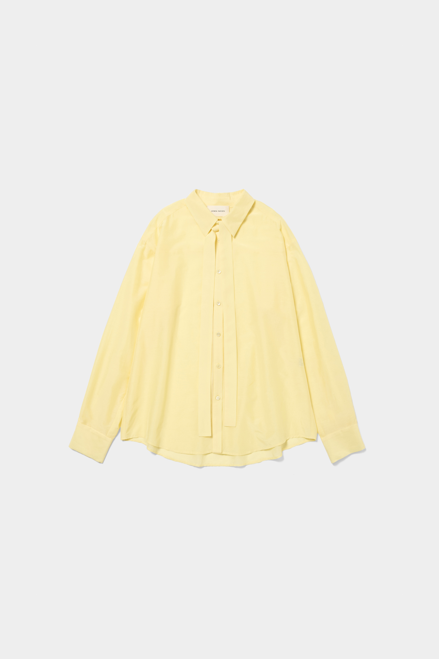 シャツと同素材のボウタイで、いろいろなアクセントがつけられるのでおすすめ。こうしたディテールがあることで、結び方や垂らし方次第で着こなしの幅がぐっと広がります。お花のように鮮やかなイエローもポイントで、シンプルなスタイリングに取り入れるだけで春らしい華やかさを足してくれます。