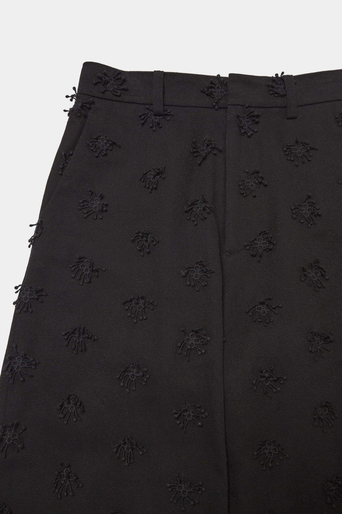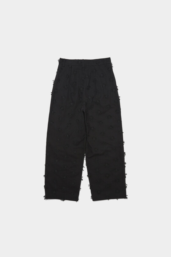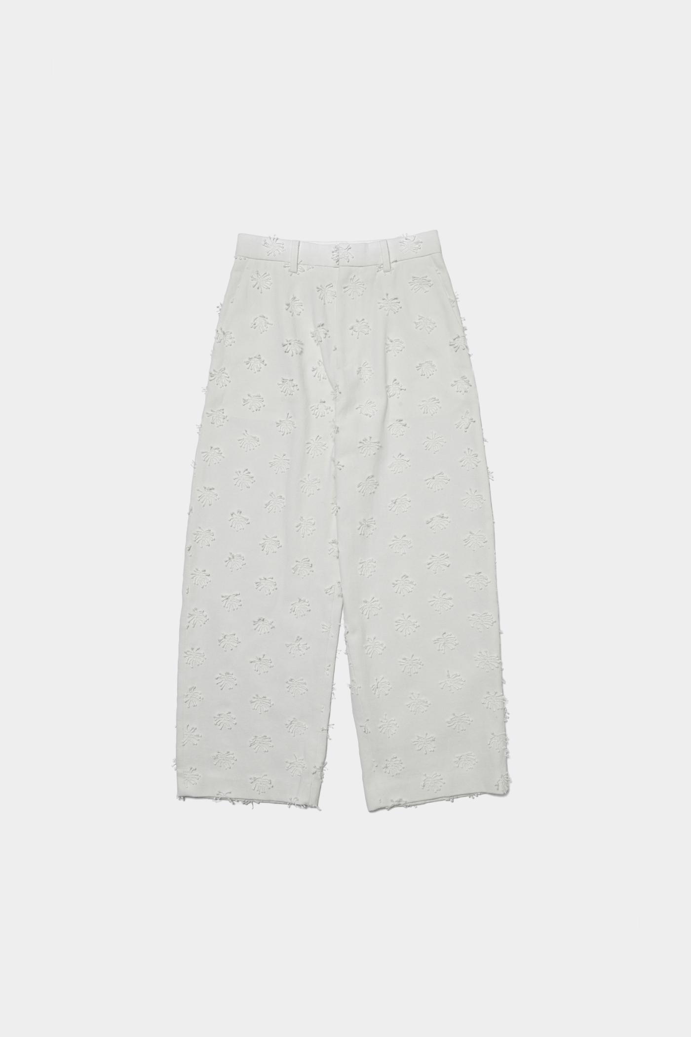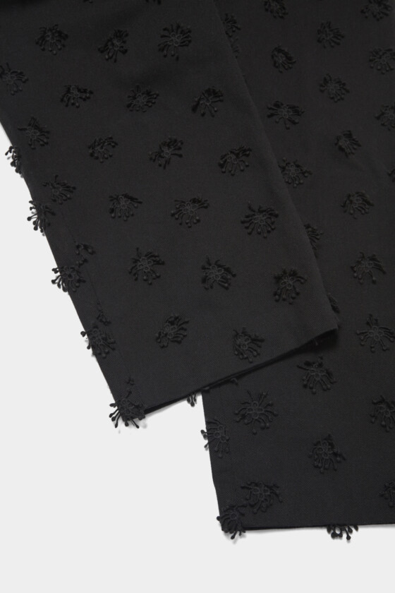 同じ素材のジャケットとセットアップで着たいパンツ。立体的な刺繍のディテールがさりげないアクセントになっていて、ミニマルな中にも表情が加わります。重くなりがちな春先の装いには、やっぱり白を取り入れて軽やかさを出したくなりますね。