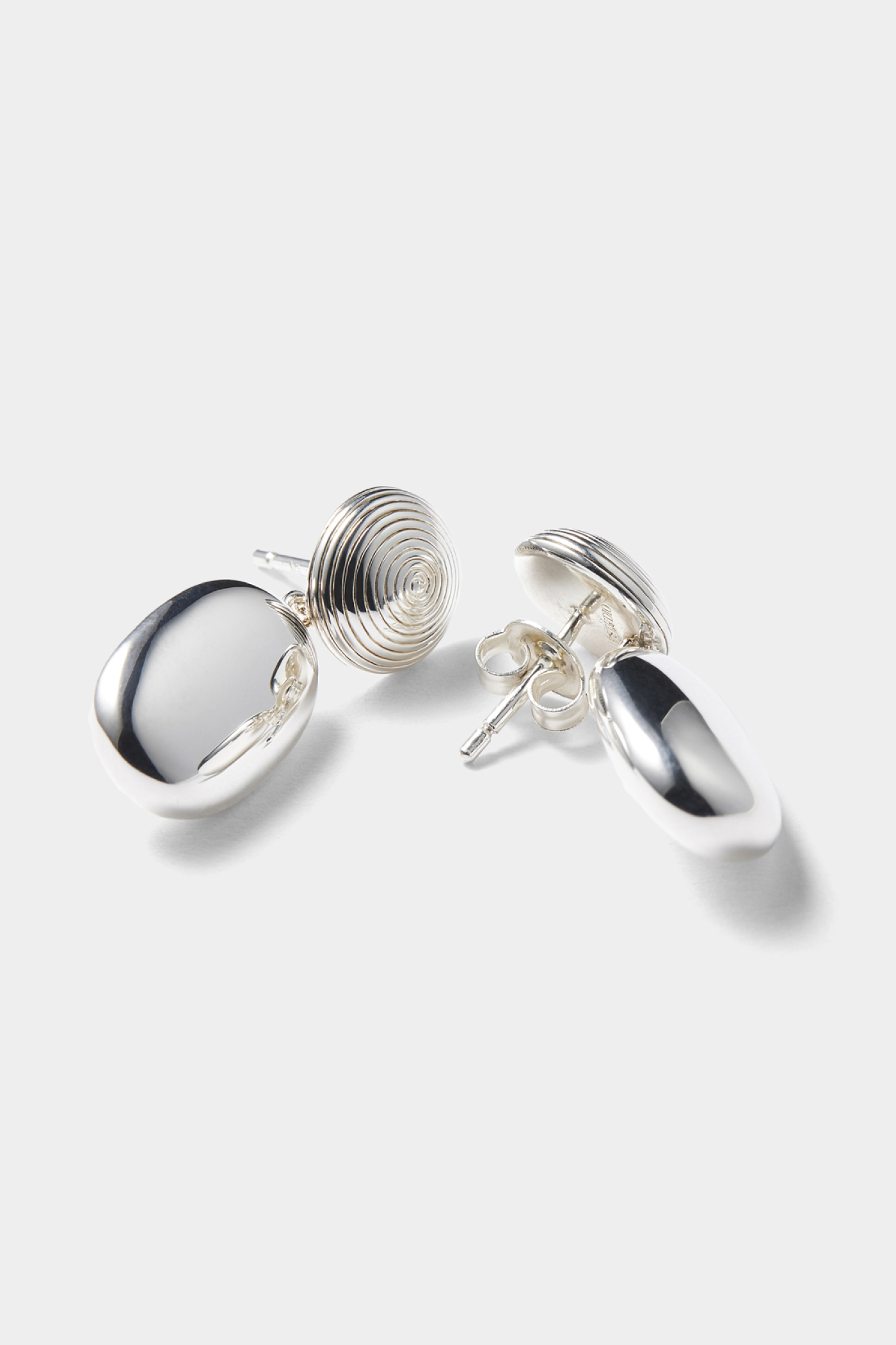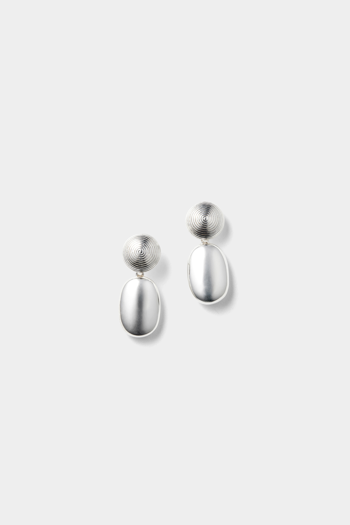 カジュアルな装いに、あえてボリュームのあるシルバーアクセサリーを合わせることで、雰囲気を変えられるのがいいですね。軽やかに揺れるドロップデザインが、動くたびに耳元に表情を与えてくれます。異なる形のモチーフがさりげないアクセントに。