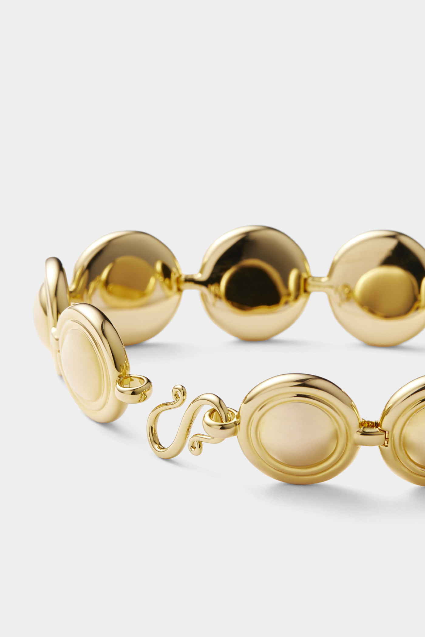 ボリュームのあるブレスレットは、シャツの上に留めて印象的に取り入れたい!プレート状のパーツが連なるデザインはどこかレトロなムードがあり、手元にさりげない存在感を放ちます。丸みのあるプレートが光を受けてやわらかく反射し、上品な輝きに。