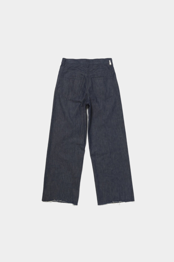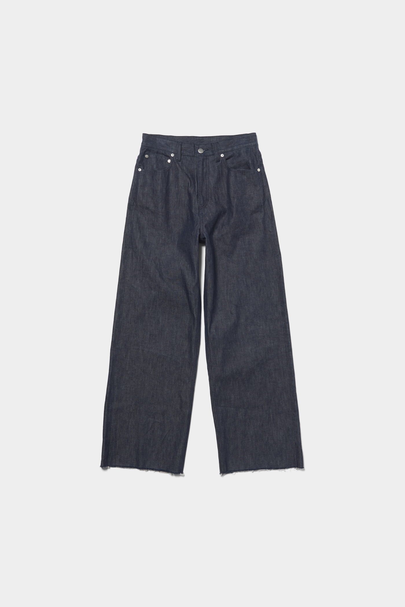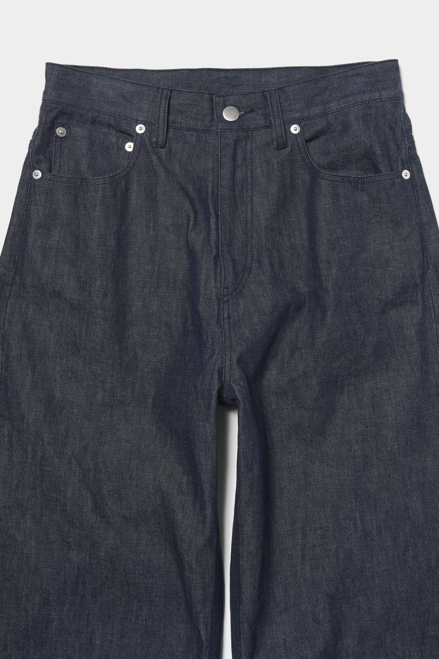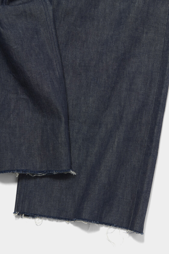 ワイドなストレートシルエットのリジットデニムは、生地にハリ感があるので、カジュアルだけでなくきれいめなコーディネートにもおすすめ。コンパクトなトップスと合わせることで、スタイルアップも叶えてくれる。