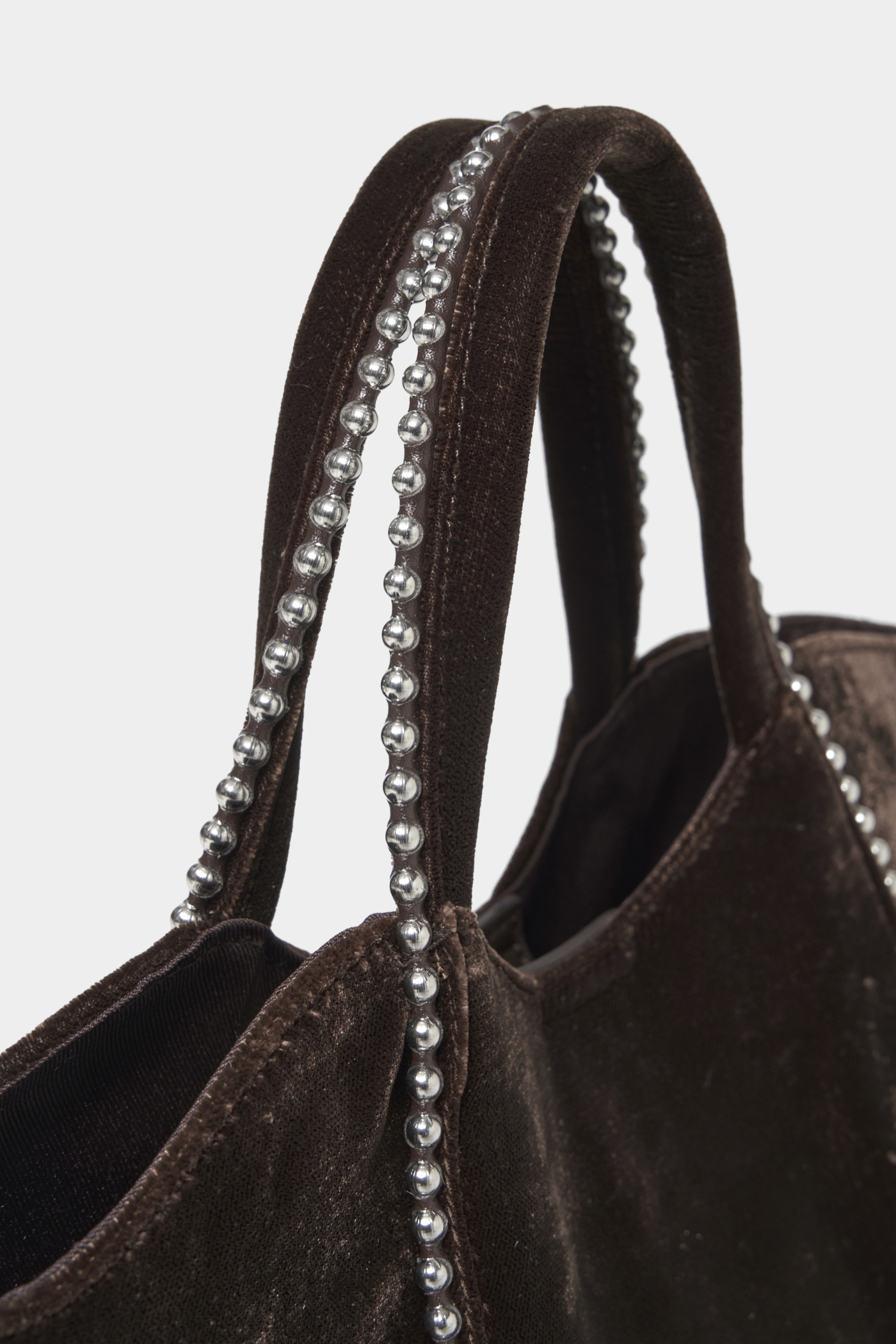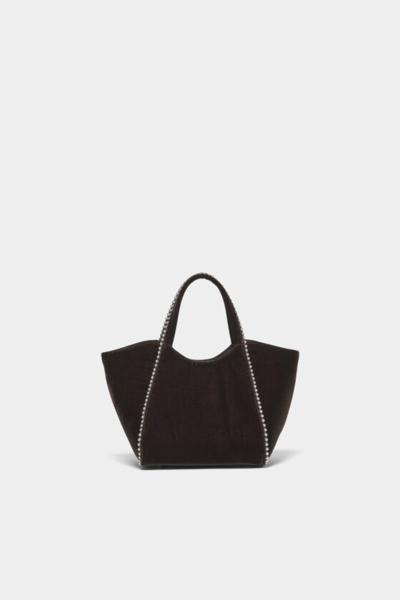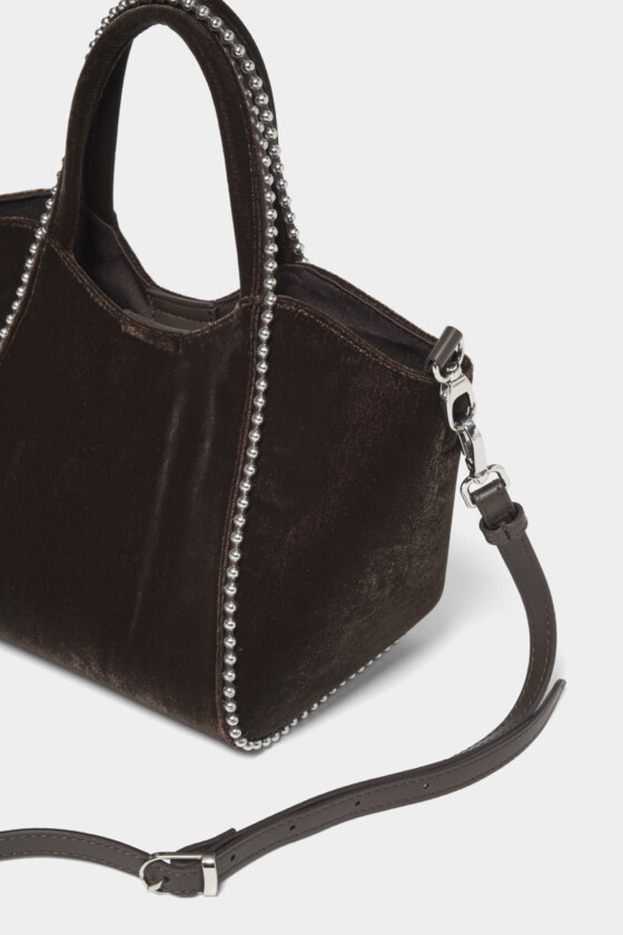 ダークブラウンのベルベッド素材が上品さをプラス。ラインに沿ってあしらわれたボールチェーンがスタイリングのアクセントになって◎。ミニサイズのバッグにお気に入りのリップや小物を入れて、身軽に出かけたい。