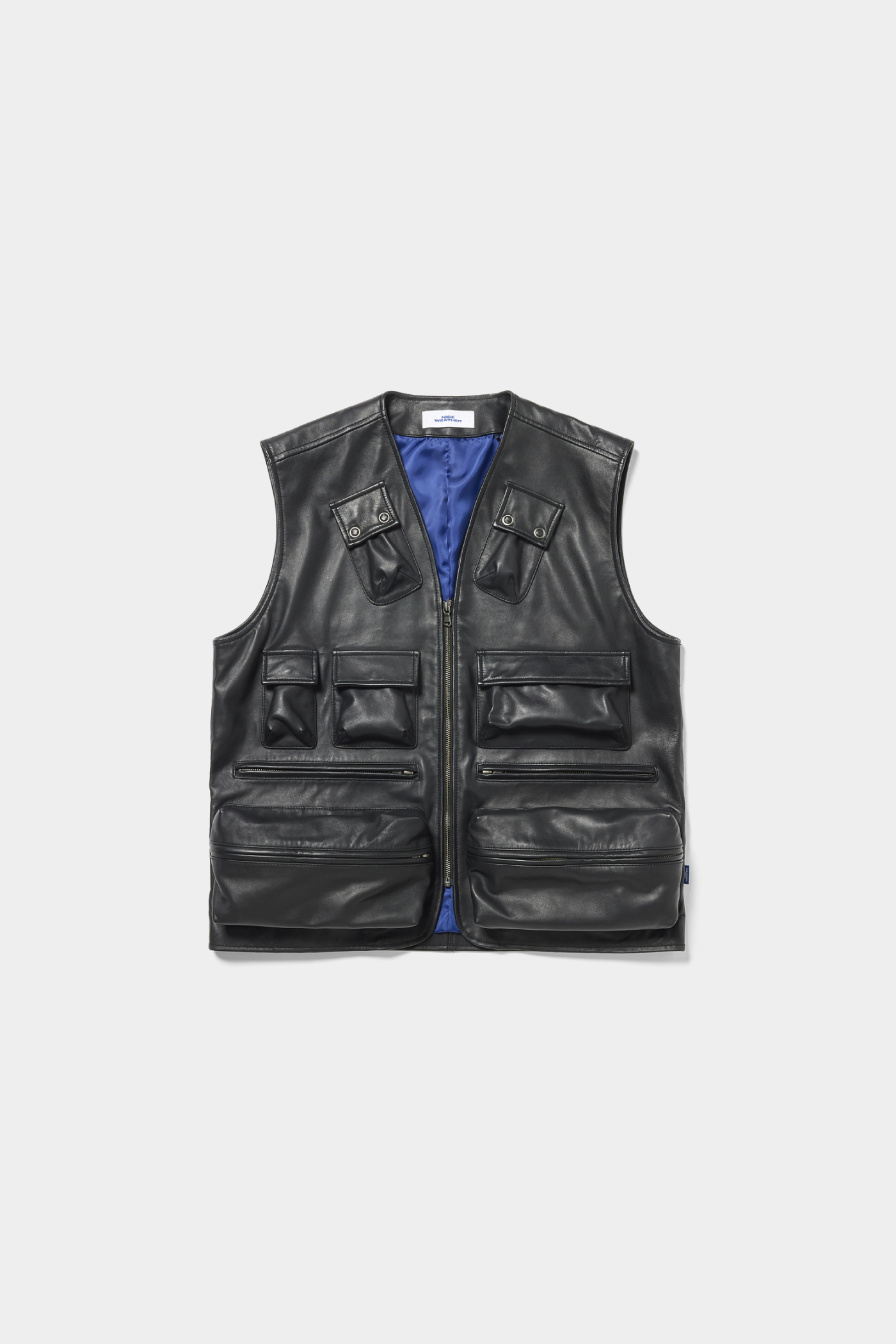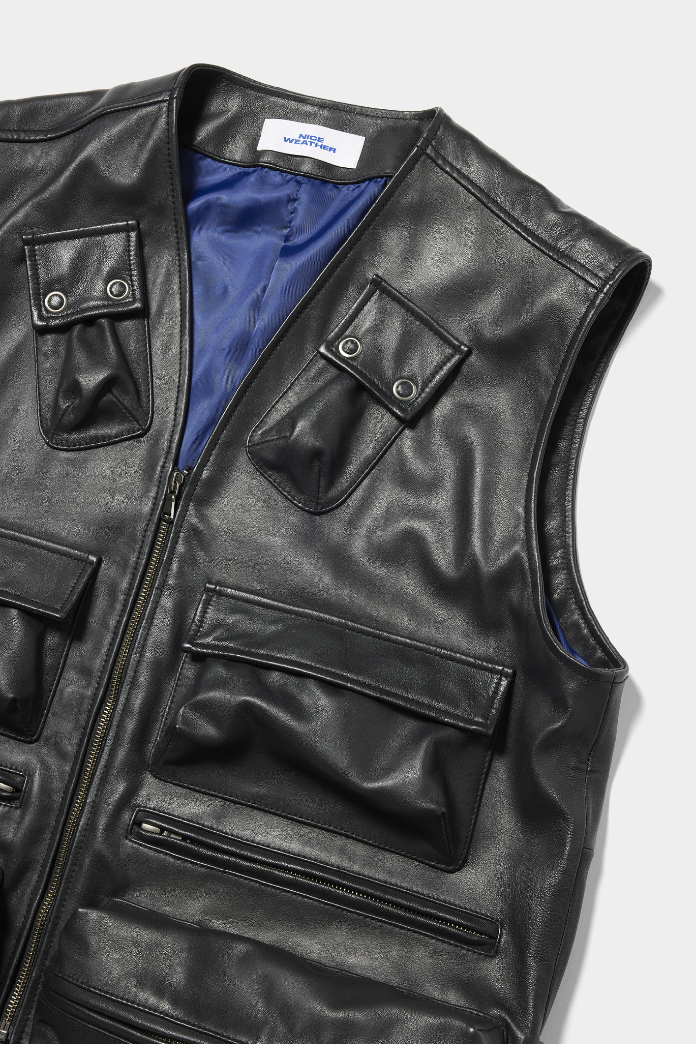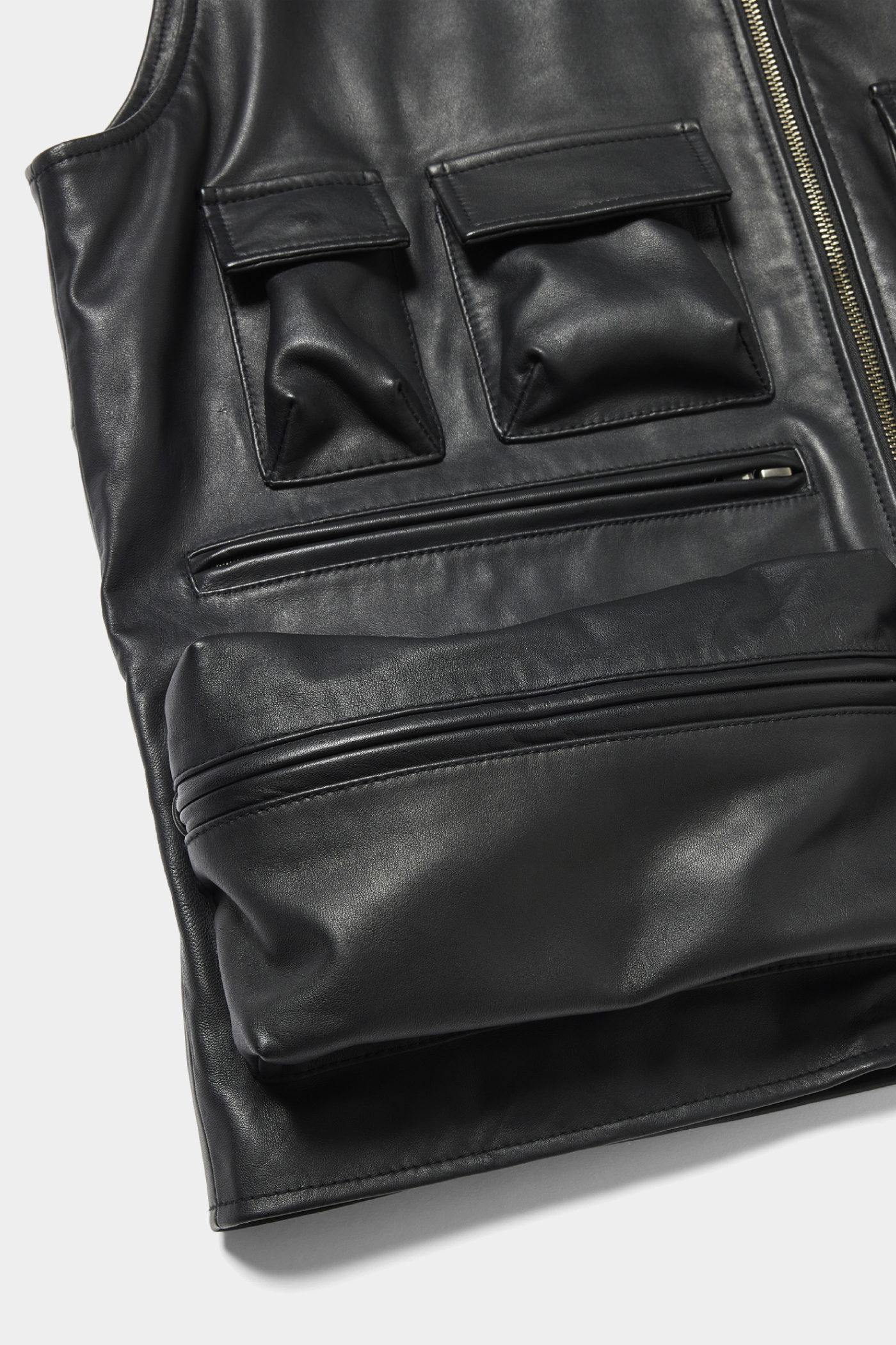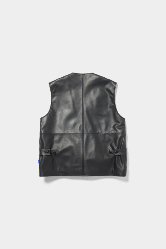 カメラベストを上品に再構築したレザーベスト。こちらはシープスキンを使用。黒革ながら、柔らかい質感でマニッシュすぎないのが今の気分。(AfterParty)