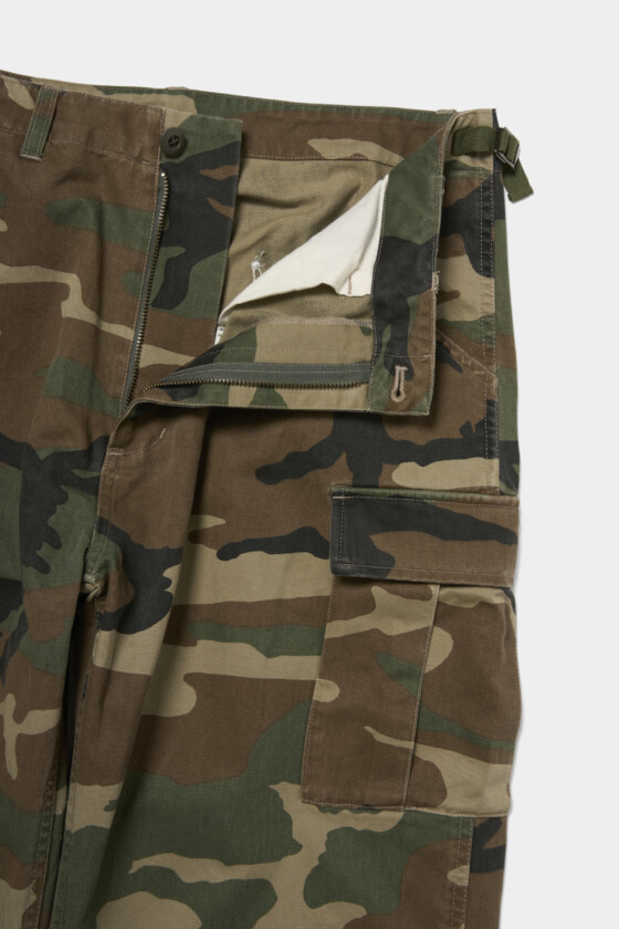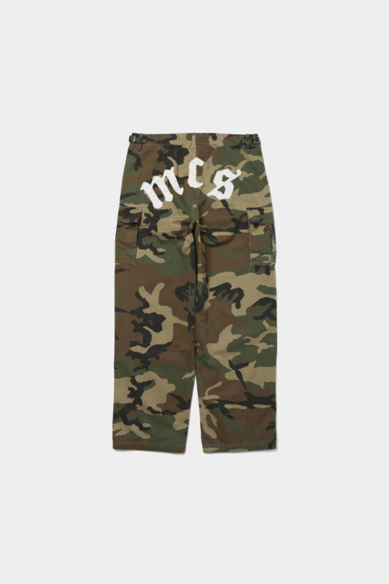 定番のカモ柄パンツ。かと思えば、白字をあしらった背面がインパクト大。オーセンティックでありながら個性派の一本。(AfterParty)