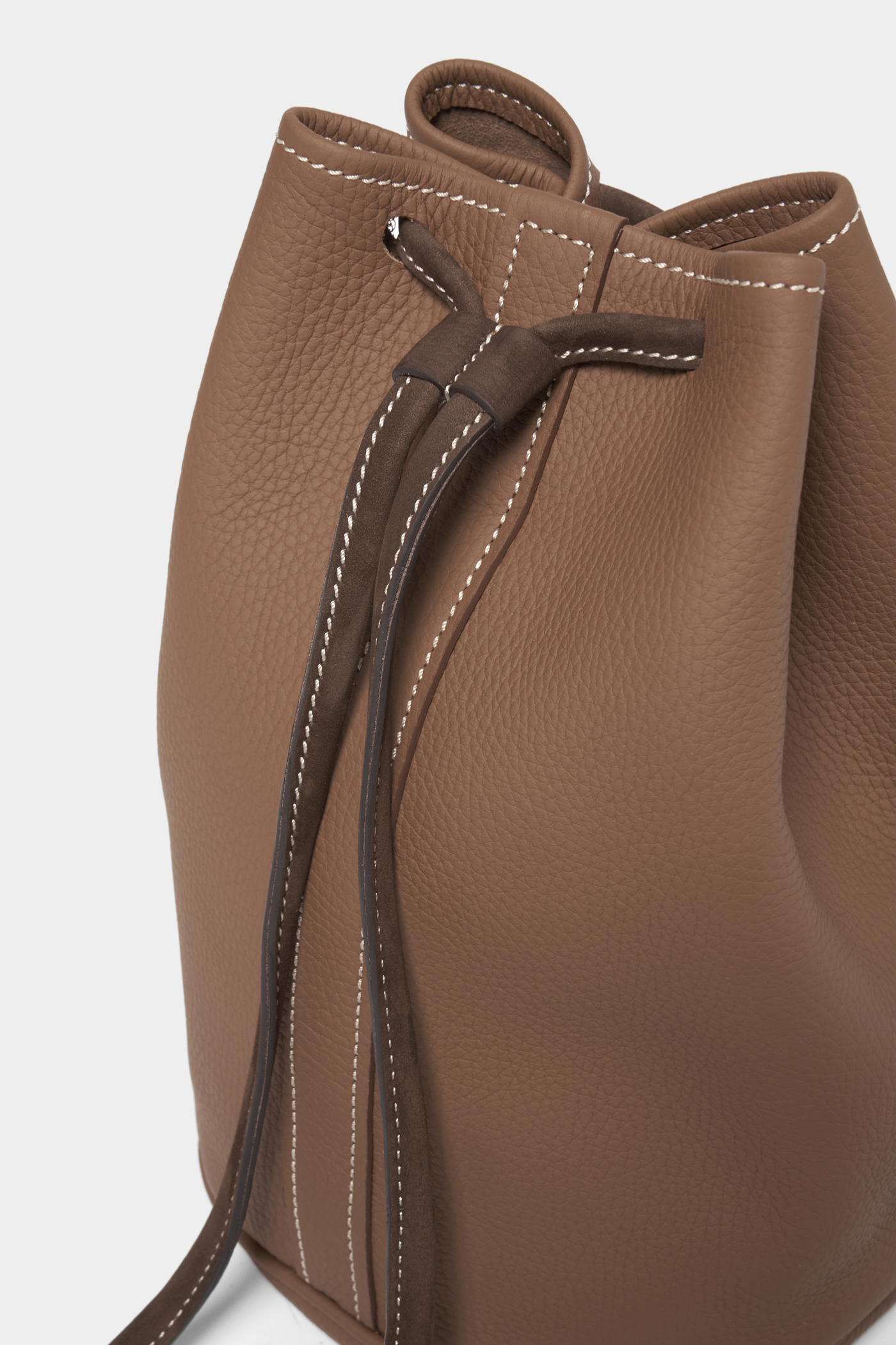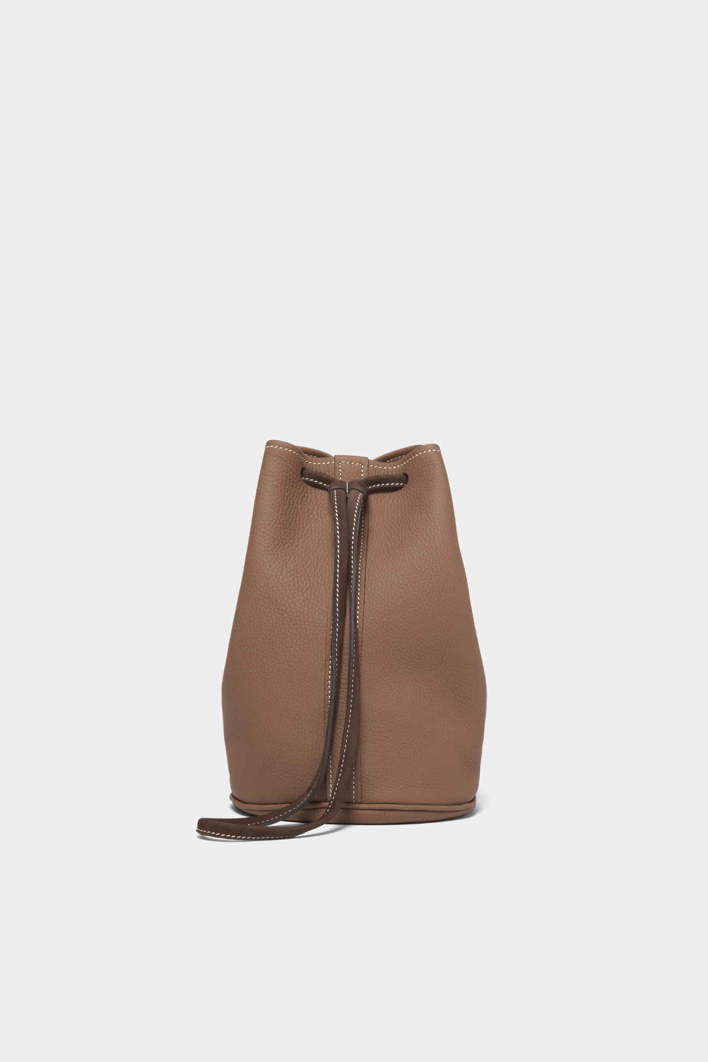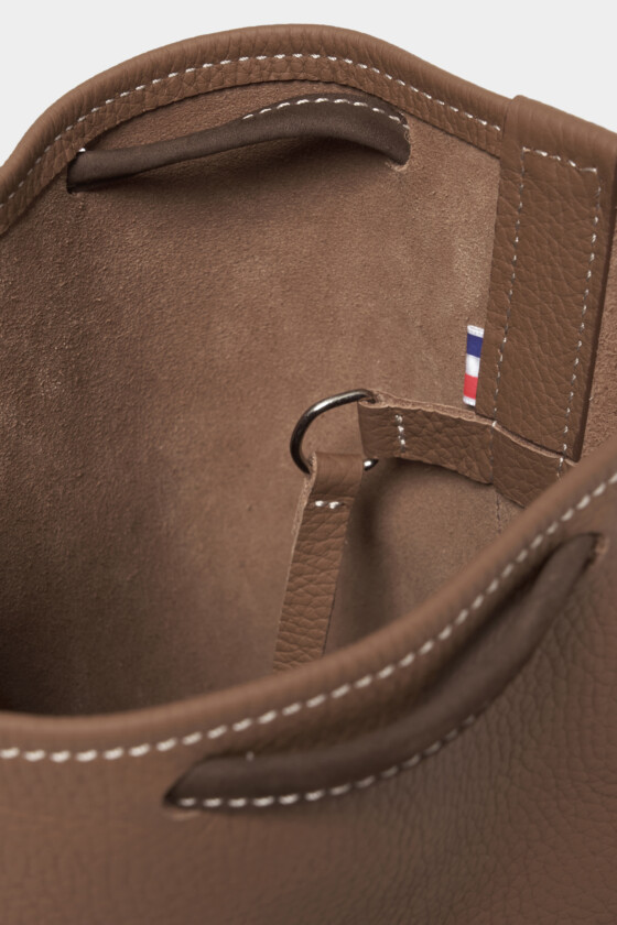 シボ革の立体感によってスタイル全体をリッチに格上げさせてくれる、メンズではわりと珍しいサイズ感のバッグ。財布とヘッドフォンとスマホ、それと文庫本くらいの持ち物であれば、このくらいの大きさが実は重宝します。(AfterParty)