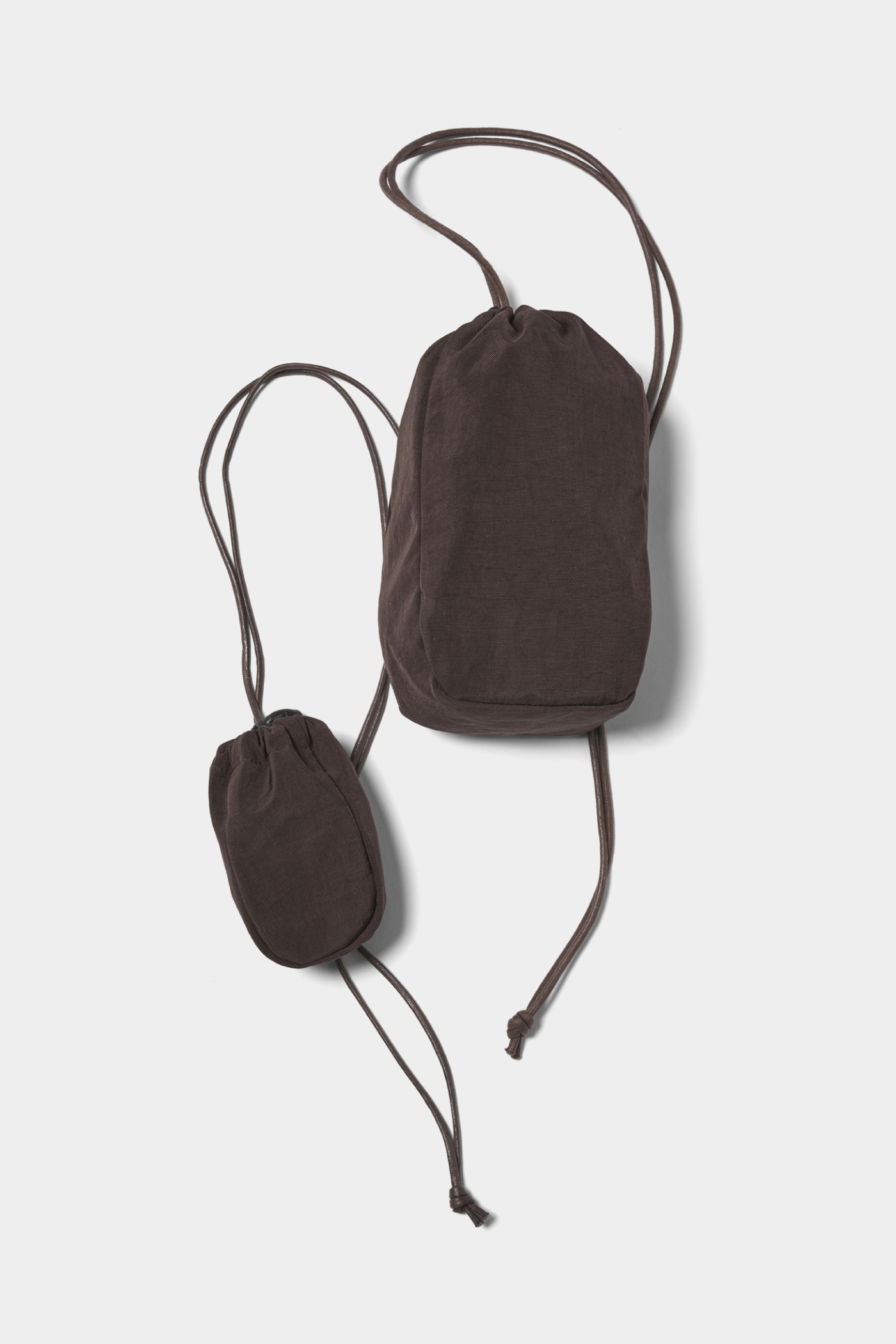 大小2サイズの巾着がセットになった巾着袋。素材にはコットンライクな質感が特徴のタッサーナイロンを使用。アジャスタブルな紐で、掛け方をお好みに調整できるのも嬉しい。(AfterParty)