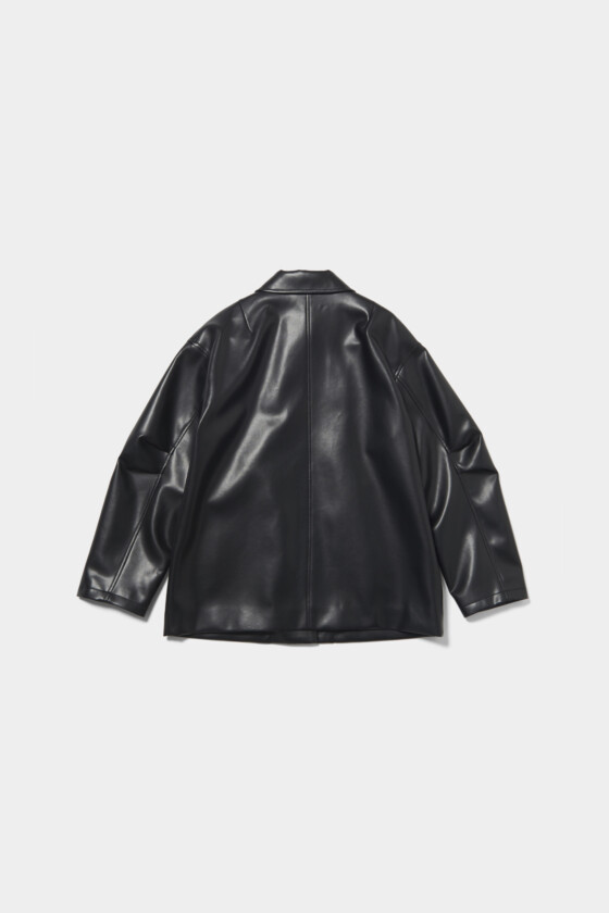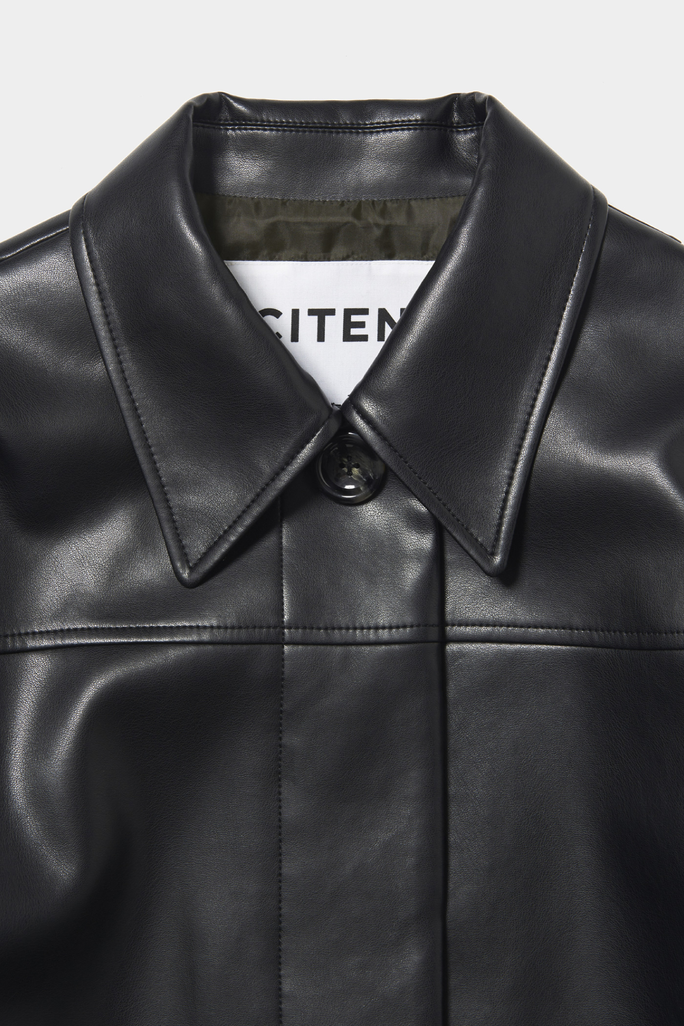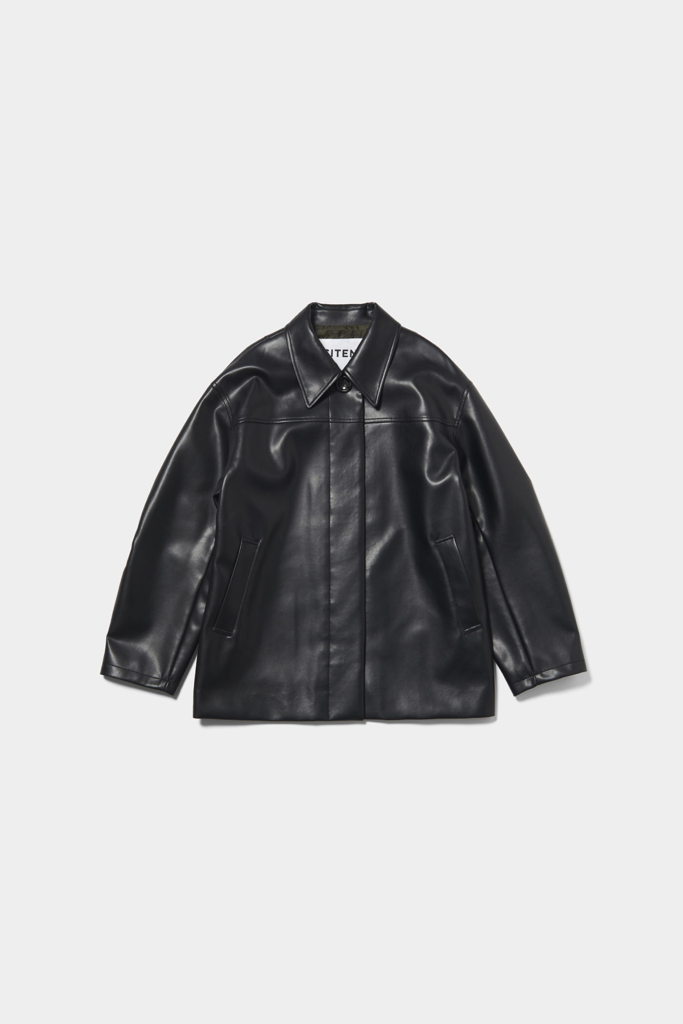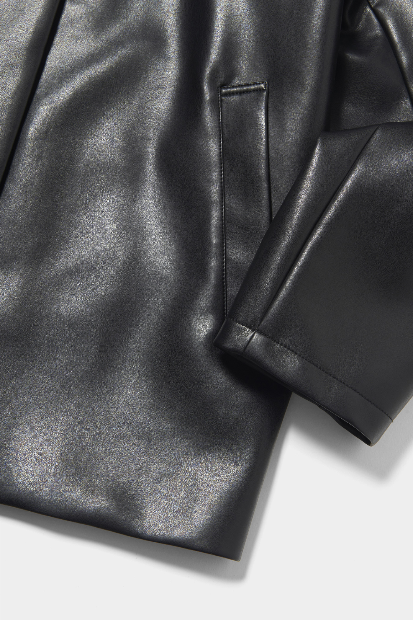 オールブラックに艶や奥行きを与える、存在感のあるフェイクレザージャケット