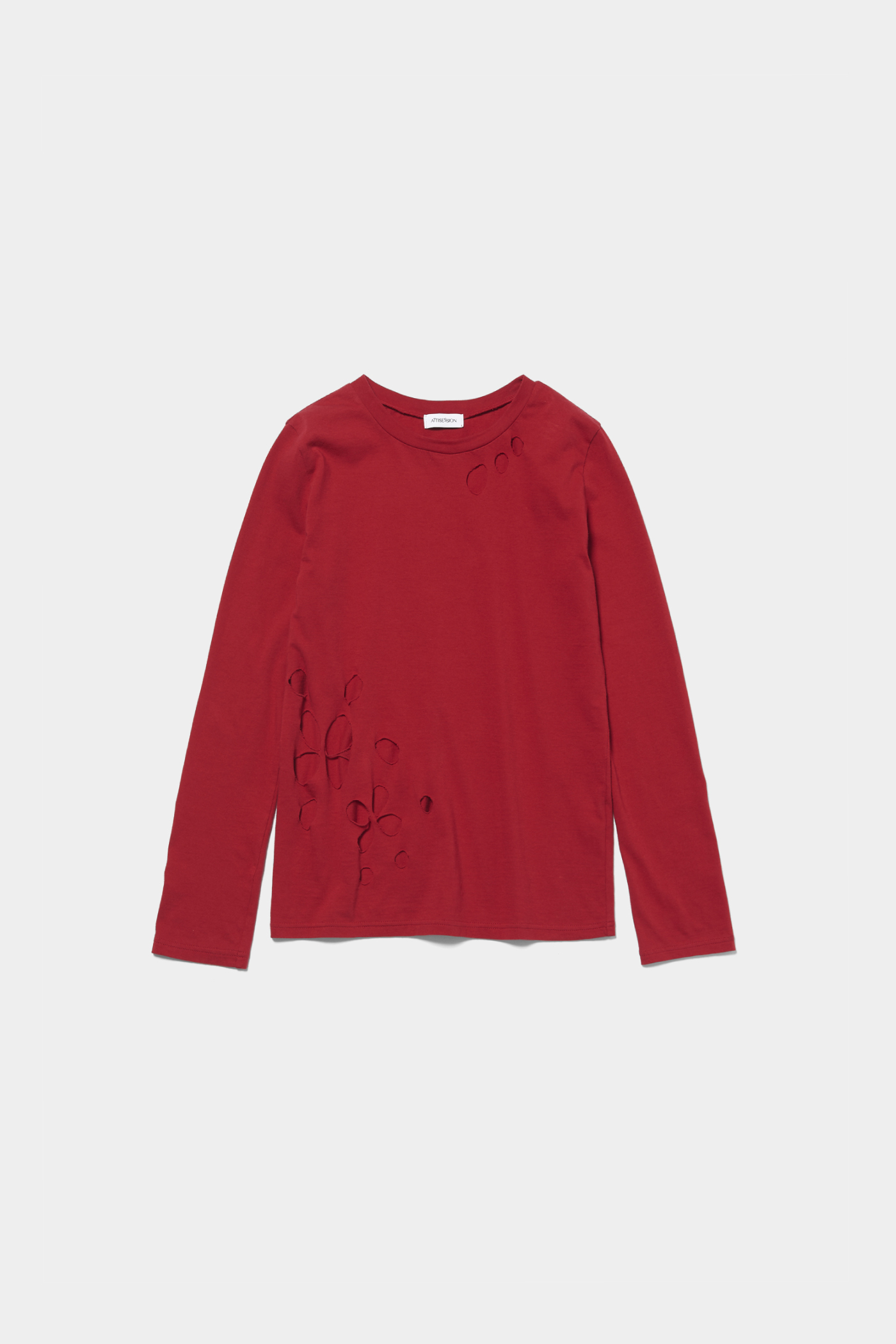 魅力的なレッドカラー!いちばん好きな色です。ディテールにはどこかクールなムードもあり、甘くなりすぎないバランスが好印象。花モチーフのカットアウトが効いていて、インナーとのレイヤード次第で表情が変わるのも魅力です。あえてコントラストのあるカラーを重ねて、奥行きのある着こなしを楽しみたい。