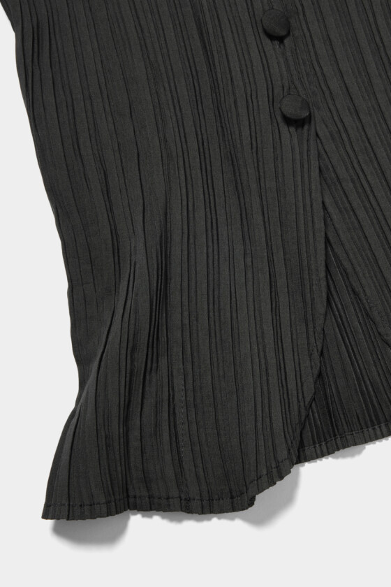 レイヤードが楽しくなるアイテムのひとつがベスト。薄手の素材なので、シャツやカットソー、ワンピースの上に重ねてもかさばらず、バランスよく着こなせるのが魅力。プリーツのディテールが全体を上品にまとめてくれて、カジュアルになりすぎないところも好印象でした。