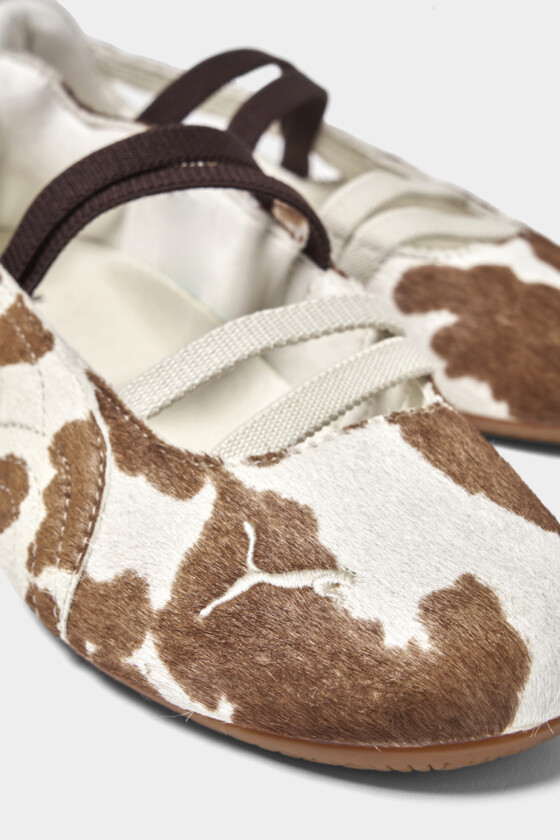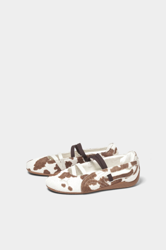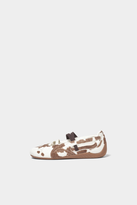 カジュアルなムードがありつつ、フラット特有の軽やかなフォルムがかわいい一足。淡いトーンのカウ柄なので主張しすぎず、普段のスタイリングにも自然に取り入れやすいのがいいなって思いました。甲に入ったストラップがさりげないアクセントになっていて、足元をきゅっと引き締めてくれるのもポイント。ラフだけど手抜きに見えないバランスが絶妙。