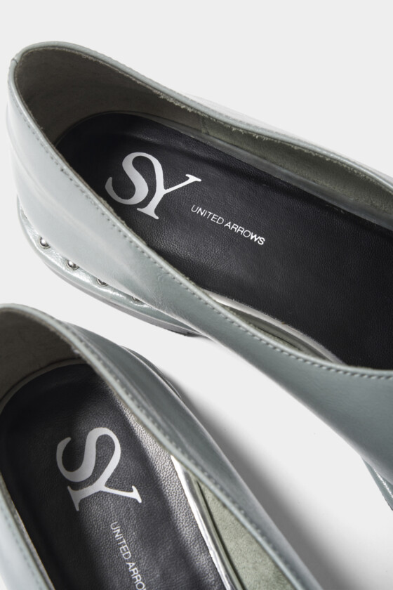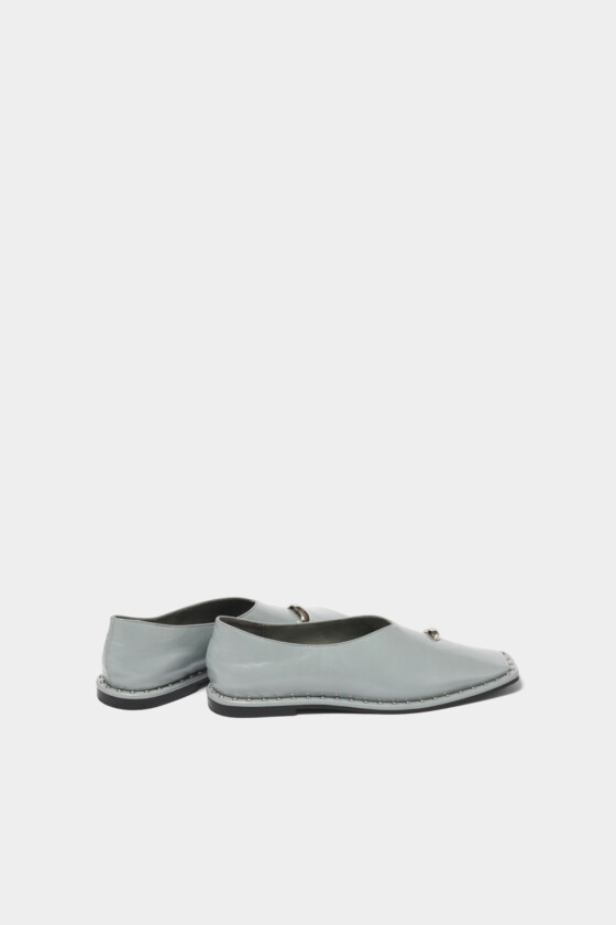 シルバーのメタリックパーツが、足元にさりげない強さを足してくれる。スクエアトゥのすっきりとしたフォルムに、親指部分の立体的なメタルパーツが効いていて、シンプルなのにしっかり個性があるのが魅力。スタッズも主張しすぎず、近くで見ると気が付くくらいのバランス感がちょうどいいんです。フラットなので、デザイン性と日常使いのしやすさを両立しているところもうれしい。