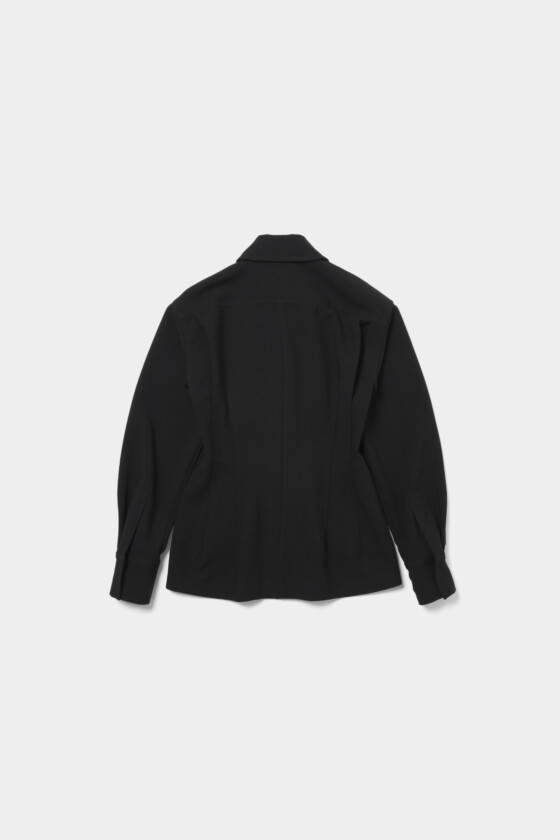 スーツのようなハリ感のある生地を使用した、ジャケットライクなブラックシャツ。フロントとバックに入ったダーツがウエストをすっきりと見せて、エレガントなシルエットを叶えてくれる。