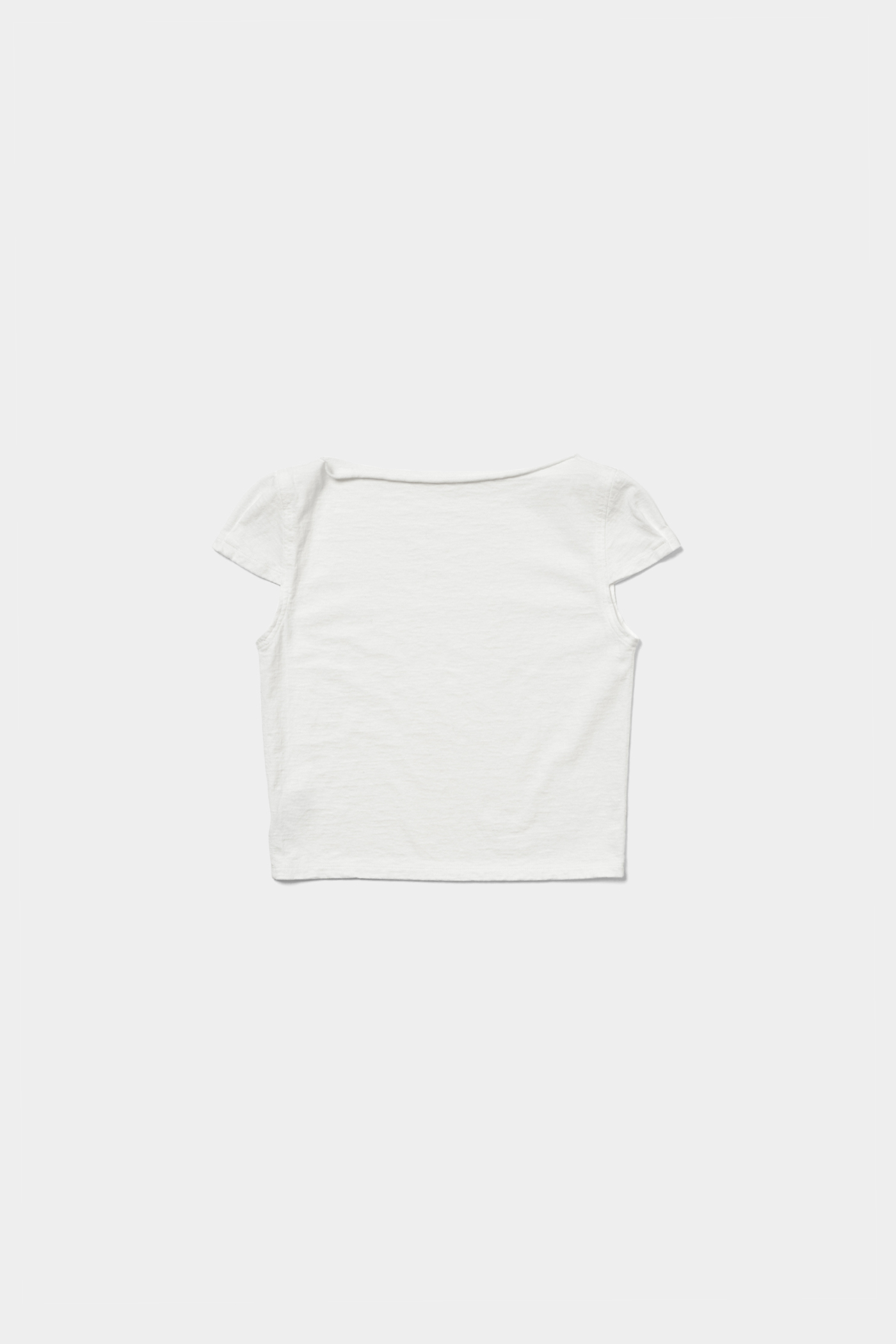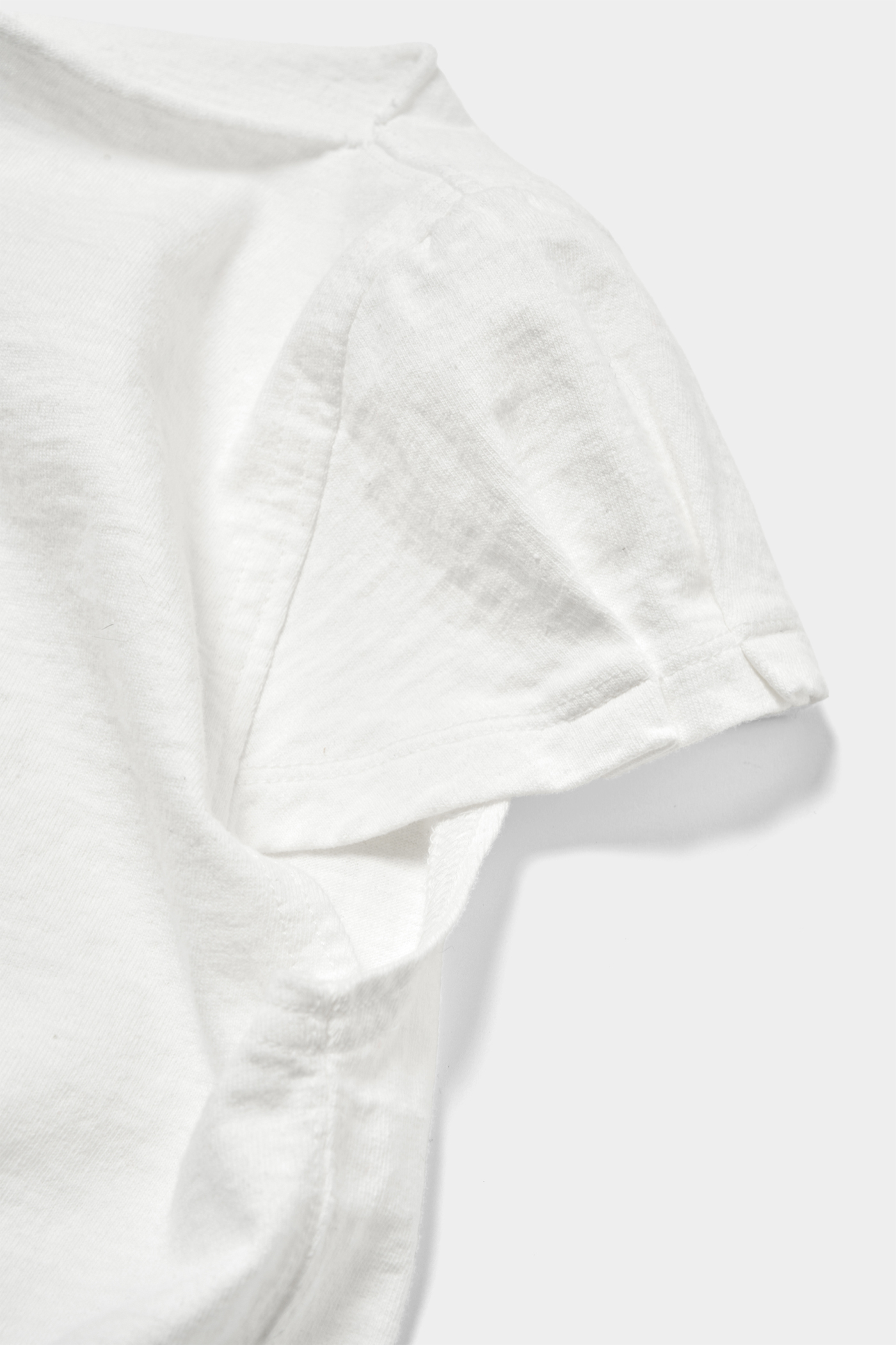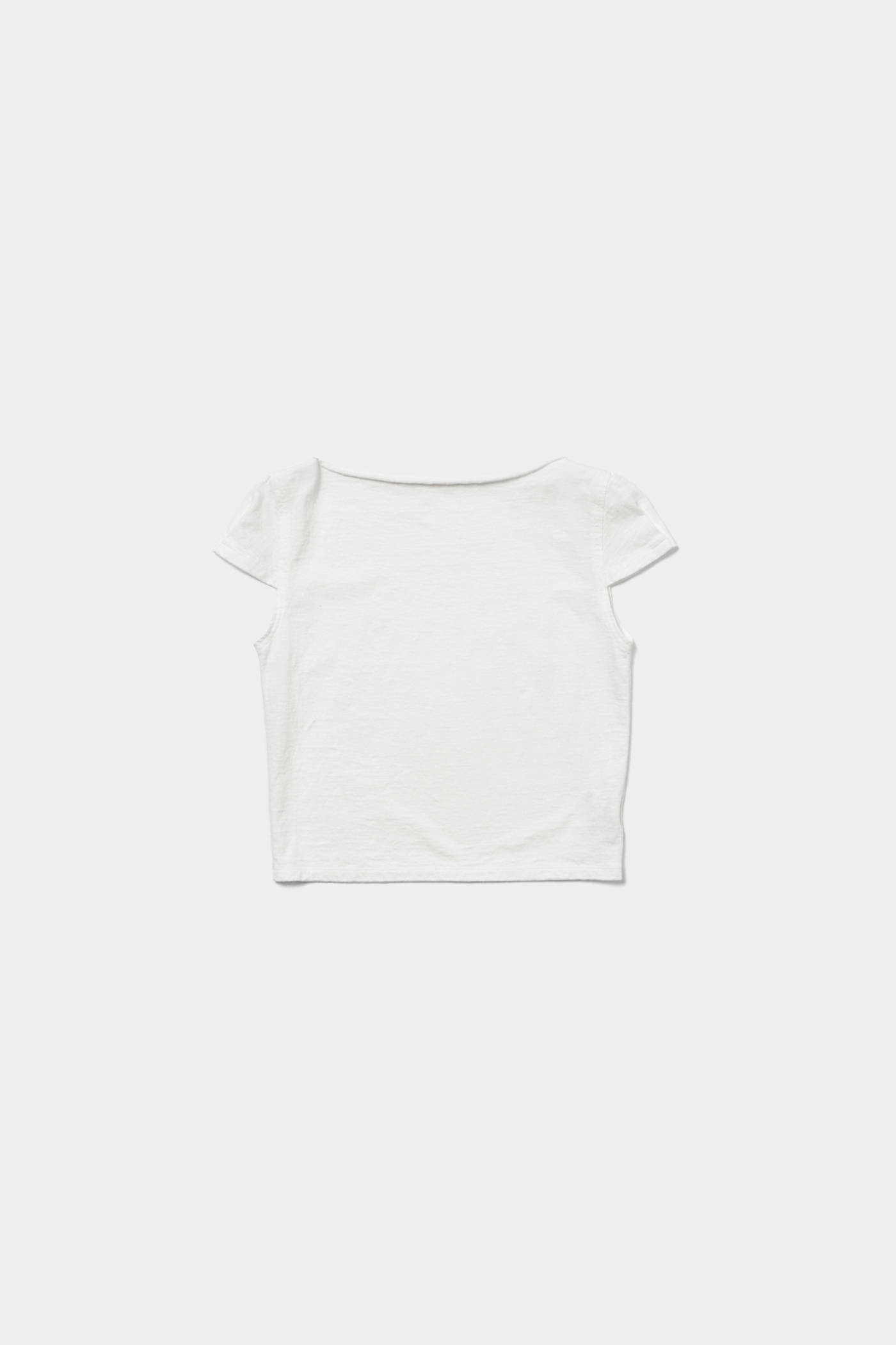 シンプルな白Tながらコンパクトなクロップド丈と短めのスリーブが、トレンド感のある着こなしの秘訣。インナーとしてはもちろん、さらっと1枚でも着回しやすいアイテム。