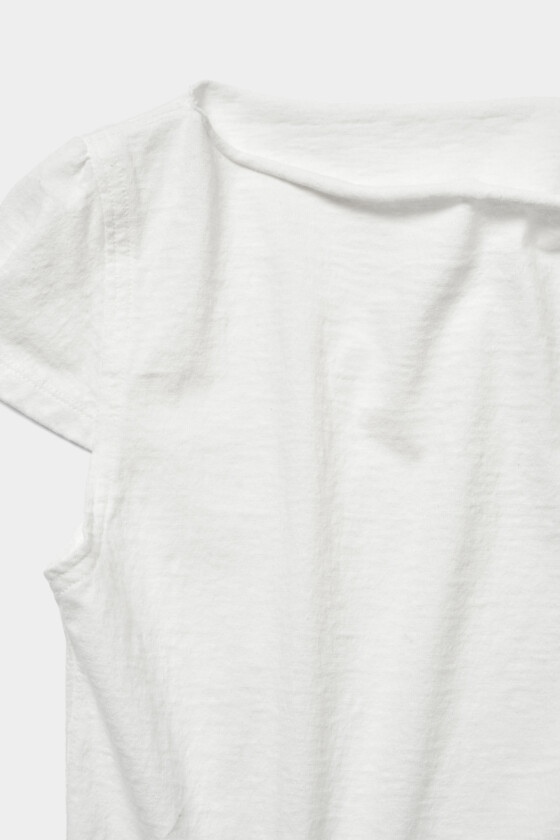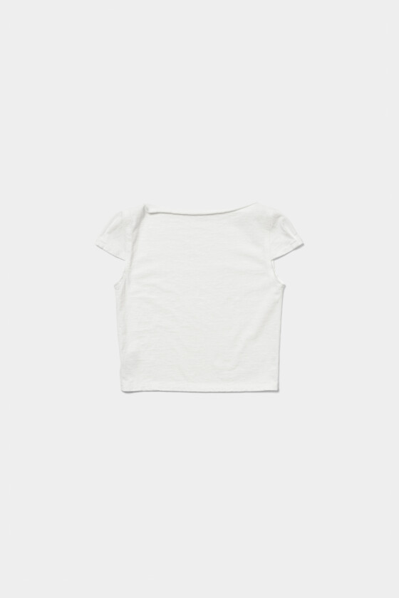 シンプルな白Tながらコンパクトなクロップド丈と短めのスリーブが、トレンド感のある着こなしの秘訣。インナーとしてはもちろん、さらっと1枚でも着回しやすいアイテム。