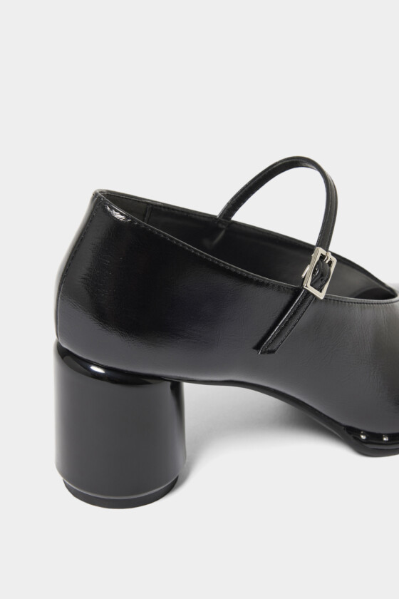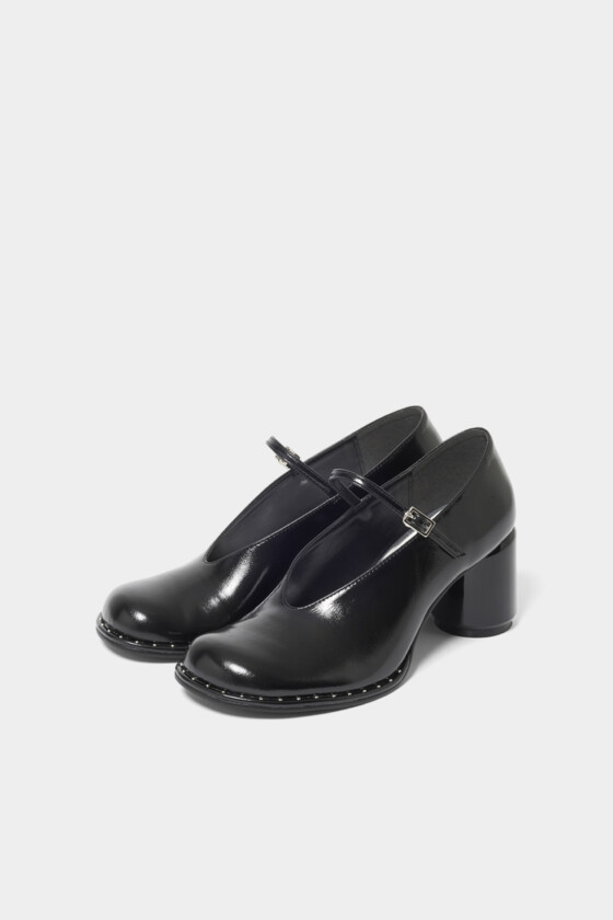 トレンド感のあるオブリークトゥにメリージェーンのデザインを落とし込んだパンプス。バックシルエットや足の甲がすっきりと見えるカットラインが美しく、円形のヒールで歩きやすいところも魅力のひとつ。