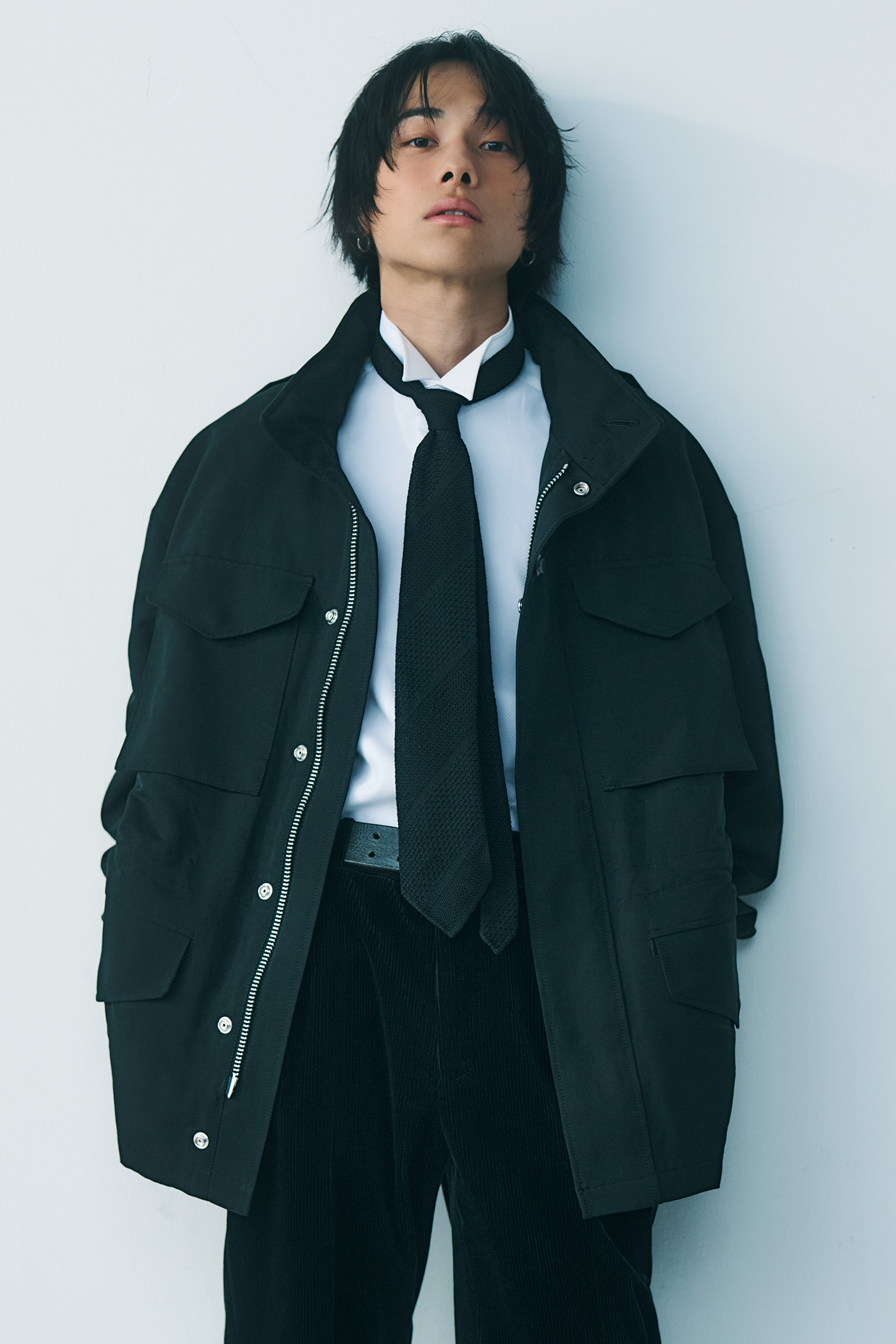 シャツやネクタイなどドレス的なアイテムには、相反する雰囲気のミリタリーブルゾンをさっと羽織って