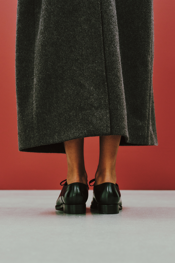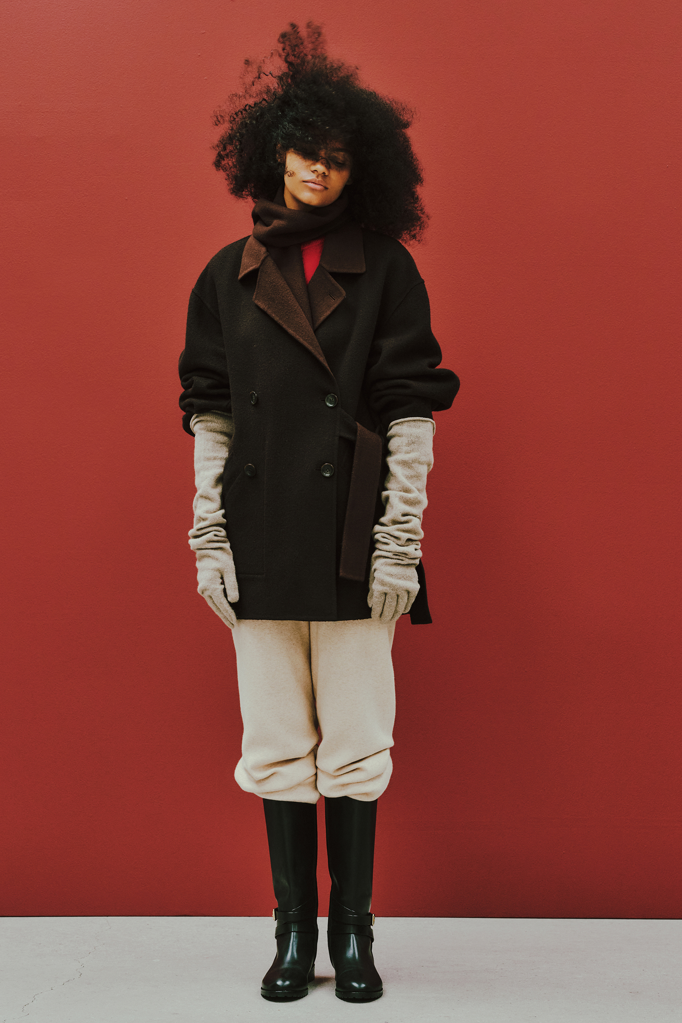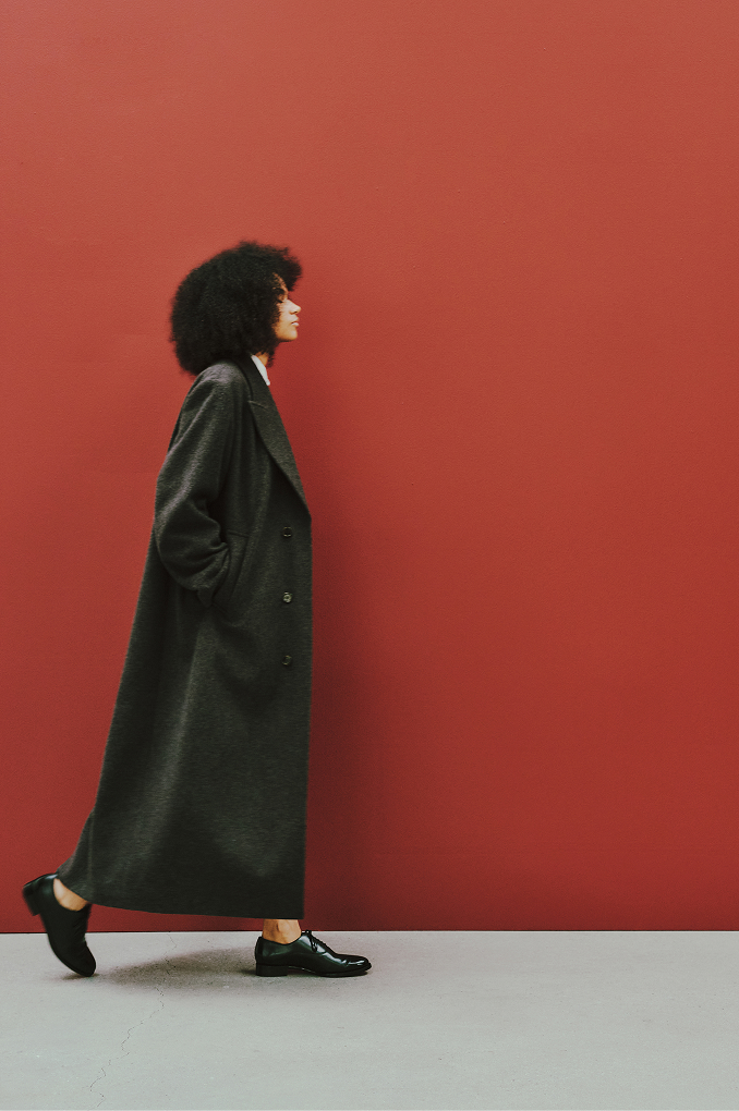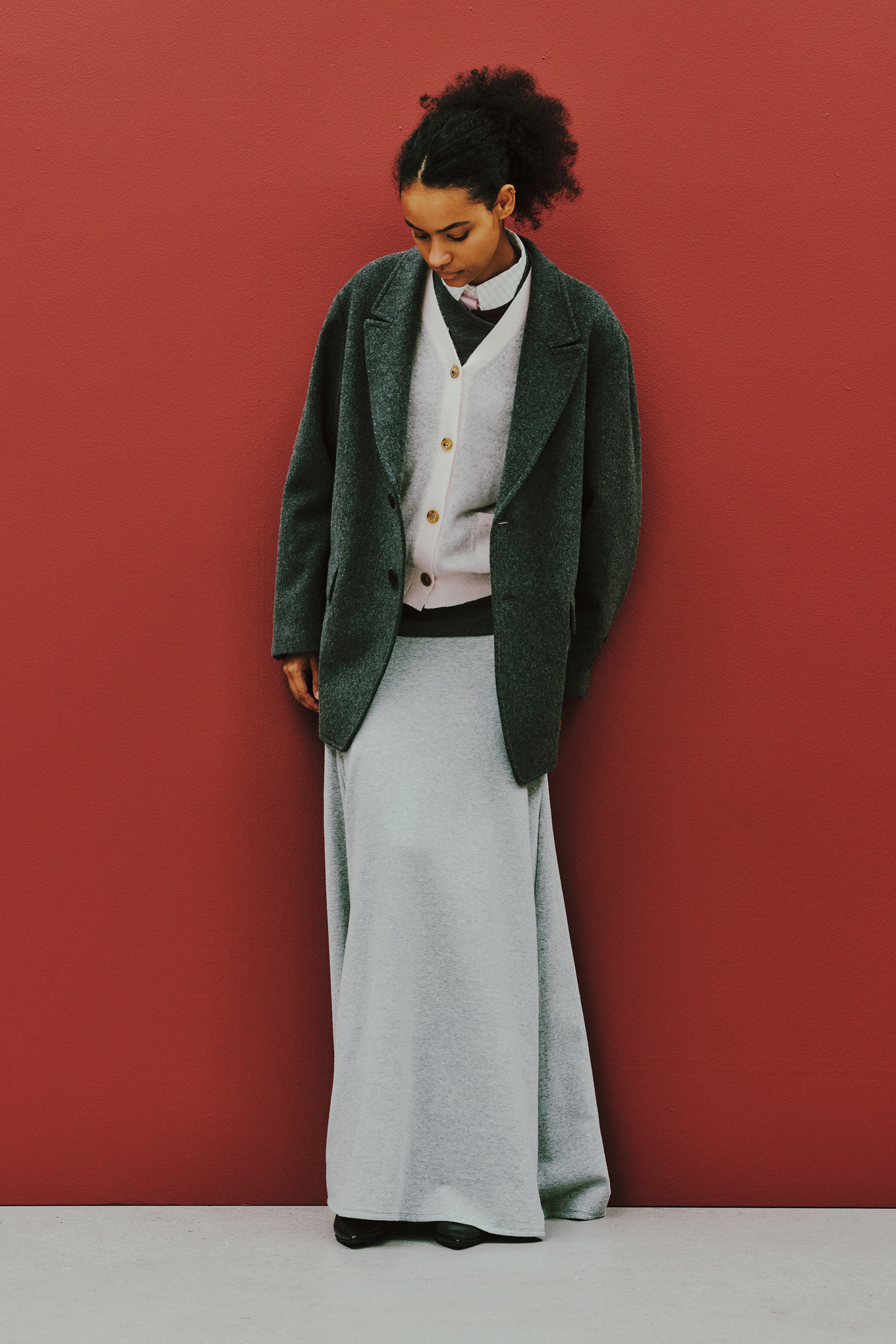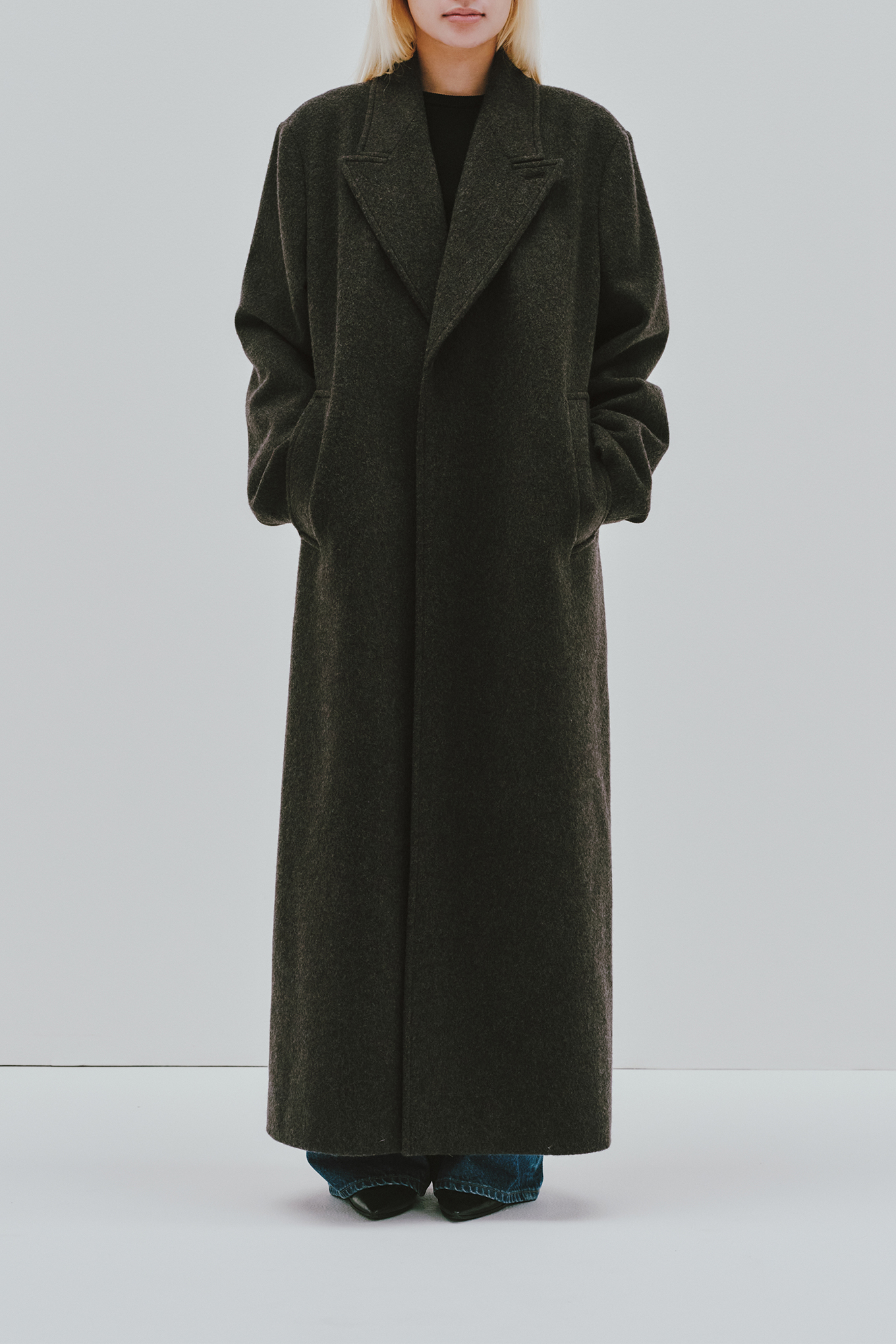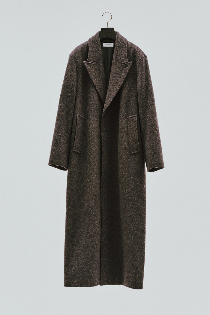 ピークドラペルジャケットのデザインを採用し、直線的なシルエットが特徴のロングコート。今季は肩幅をコンパクトにリサイズすることで、より一層着こなしの幅を広げた。袖を通すだけで背筋が伸びるようなフォーマルな佇まいは、レディにもメンズライクにも振れる。