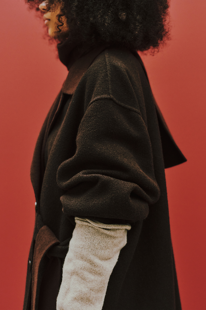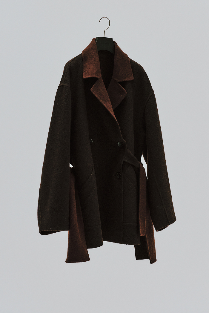同系色のカラー違いによって構成されたリバーシブルは、一見繊細に見えてアレンジの幅をぐっと広げてくれる。肩から袖にかけてやや丸みをつけたシルエットによって、インナーを選ばずにざっくり羽織ることができる。ベルトを取り外して、スカーフやバブーシュカとして使用するのもおすすめ。