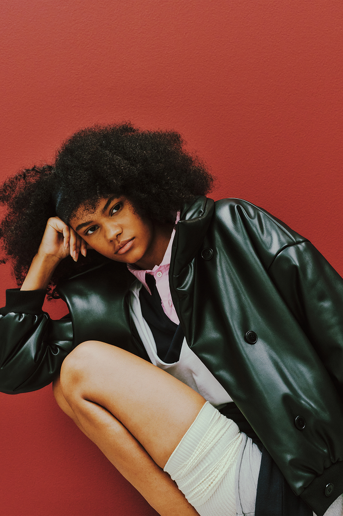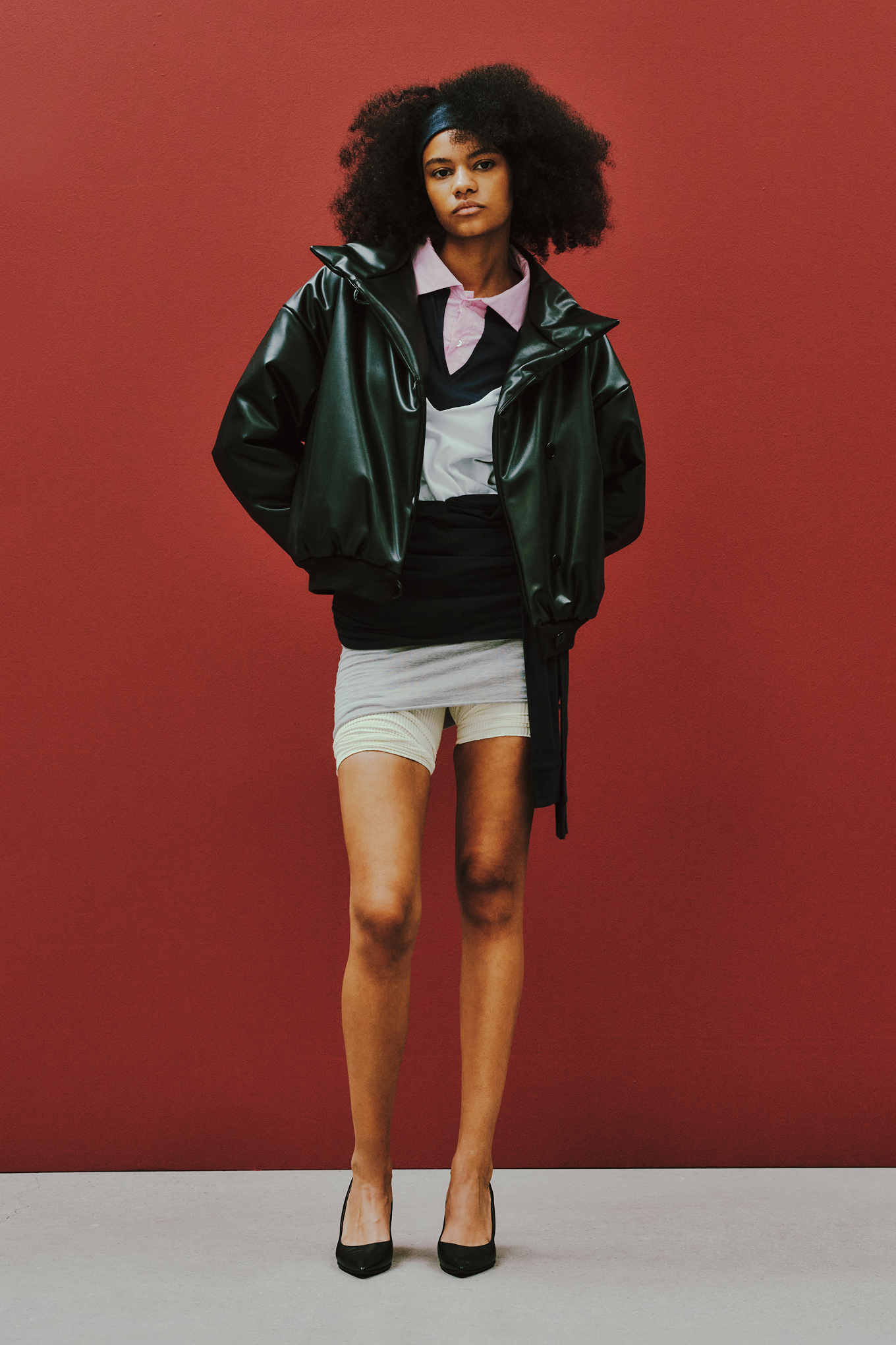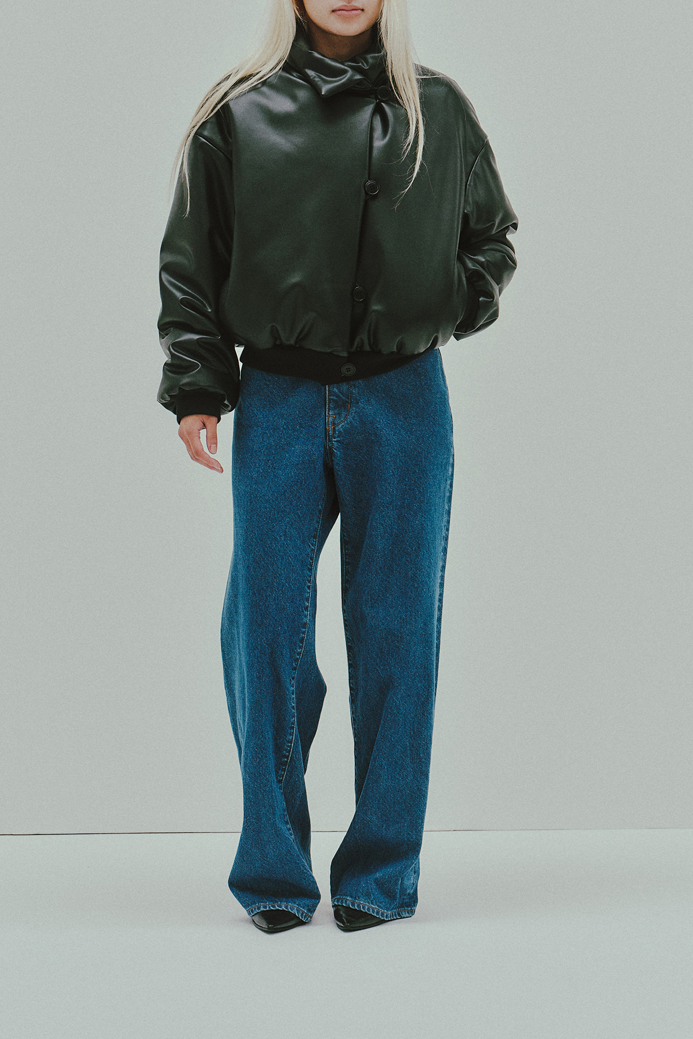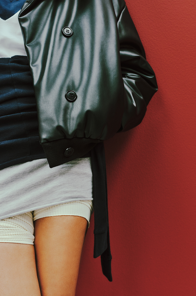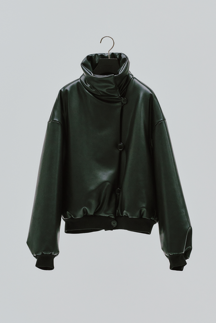 中綿入りのパデッド仕様のショート丈ブルゾン。旬度の高いルックスに、光沢感のあるレザーライクな素材感を掛け合わせ、ハードさとモダンなエッセンスを引き立たせている。どことなく醸し出されたヴィンテージムードは、ループボタンや比翼のフロントなど細部にこだわった設計だからこそ。