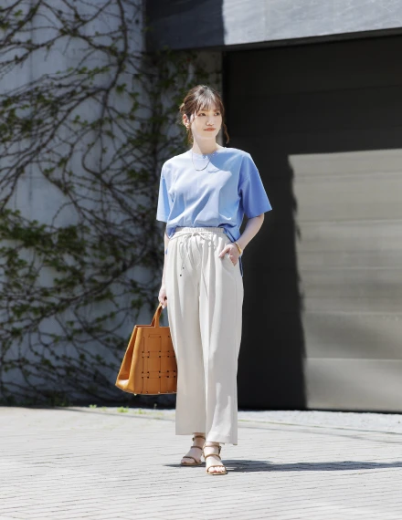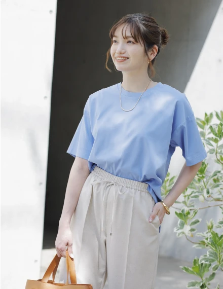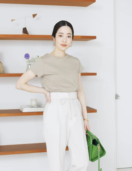 ハイウエストでウエストに細紐デザインのあるデザインのパンツ合わせが◎。ウエストにはしっかりインしてカーヴィな曲線を生かして。ウェーブさんのTシャツスタイルは華やかに仕上げることが大事。ツヤのあるアクセサリーやカラー小物で足し算のオシャレを楽しみたい。