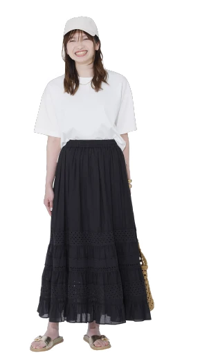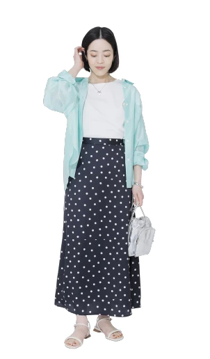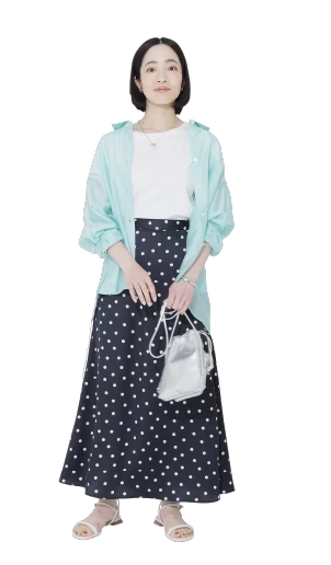 薄手で柔らかく、光沢のあるスカートを選んでウェーブさんの柔らかな身体に沿うコーディネートを。華やかな柄も同系色でまとめられたものを選ぶと◎。