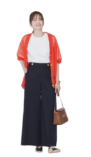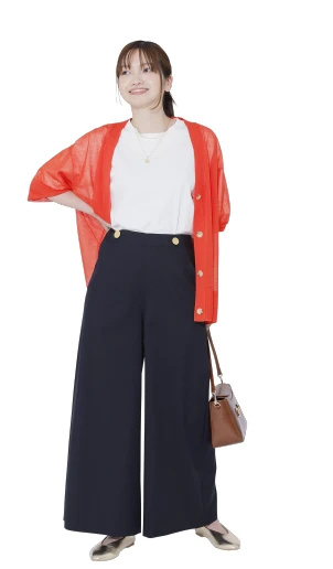 ハリがあって、思い切ったワイドパンツも負けずに着られるのがナチュラルさん。カジュアルな素材との対比で女性らしさを引き出します。カーディガンも長めでゆとりのあるシルエットが◎。