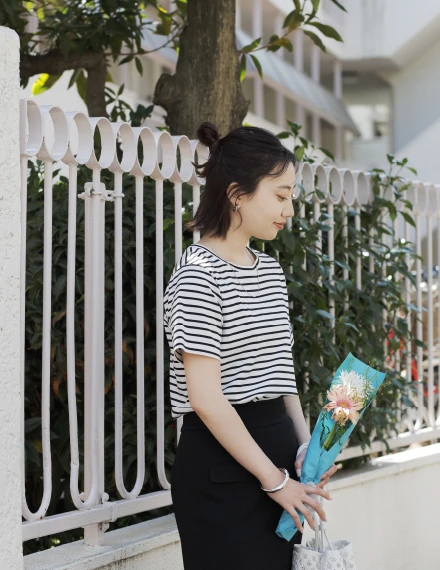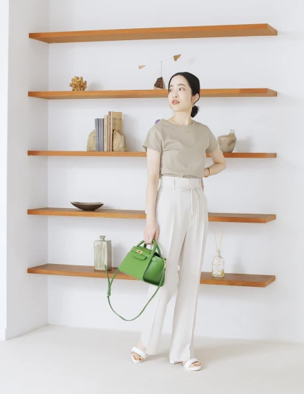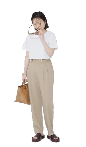 オン使いしたいキレイ目素材のパンツも、抜け感のあるドロストデザインのものを選ぶのがおすすめ!ウエストインも前だけ引っかけるように着て、こなれ感を演出するとお似合いに。バッグは大きめで少し柔らかさのあるものがおすすめです。クラフト感あるデザインもお似合い。