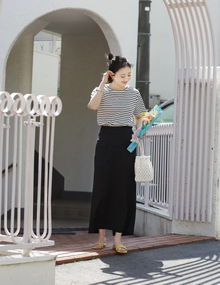 コントラストが得意なストレートさんに、ボーダーとブラックスカートのモノトーンでまとめたメリハリスタイル!スカートはウエストがすっきりしているシンプルなIラインを選ぶとお似合いに。夏に取り入れたくなるカジュアルなバッグも、形がしっかりと自立しているタイプを選んで。